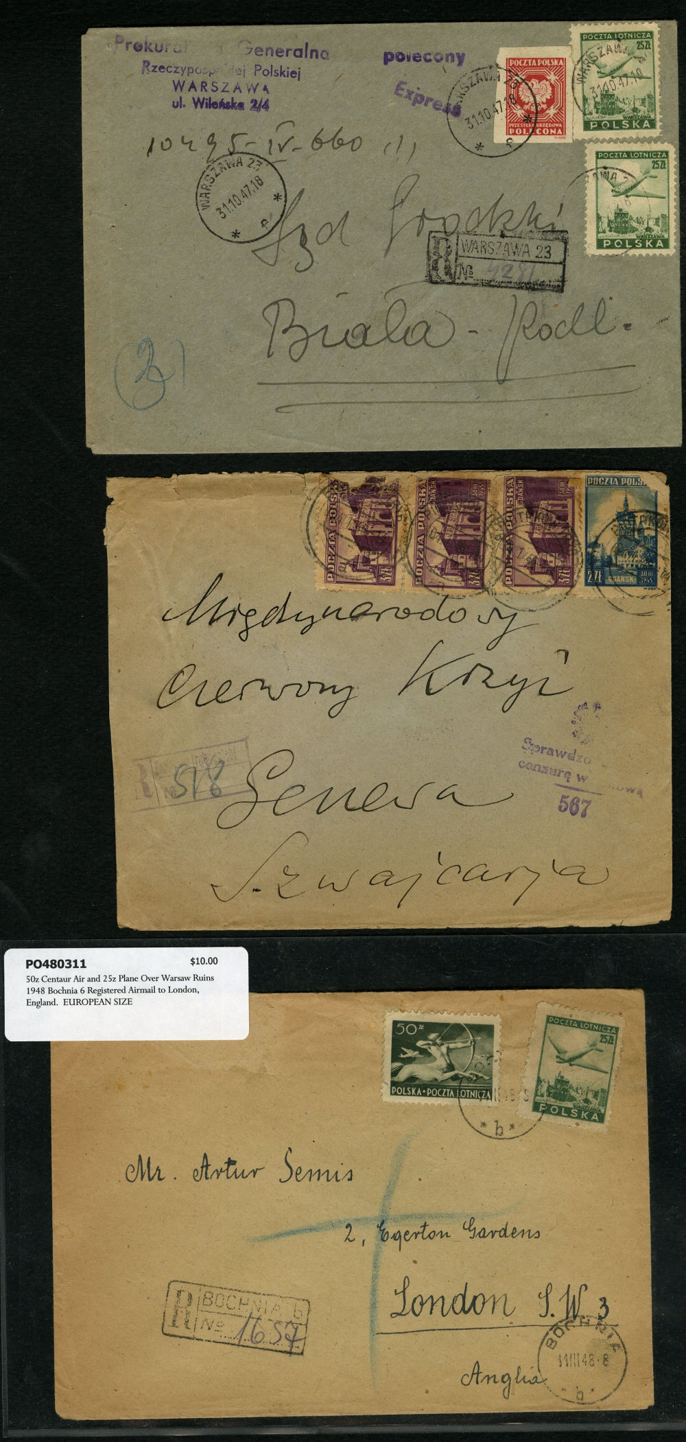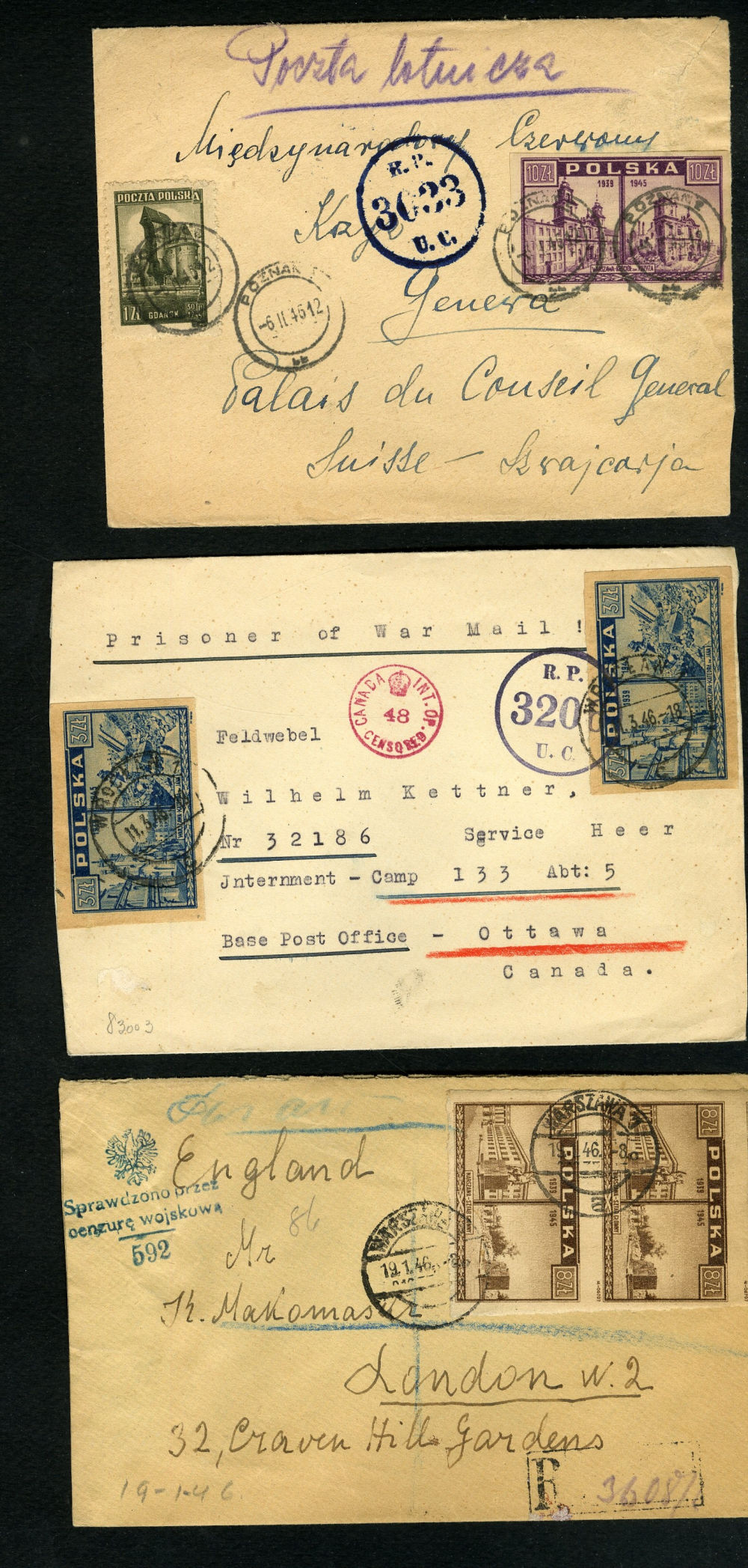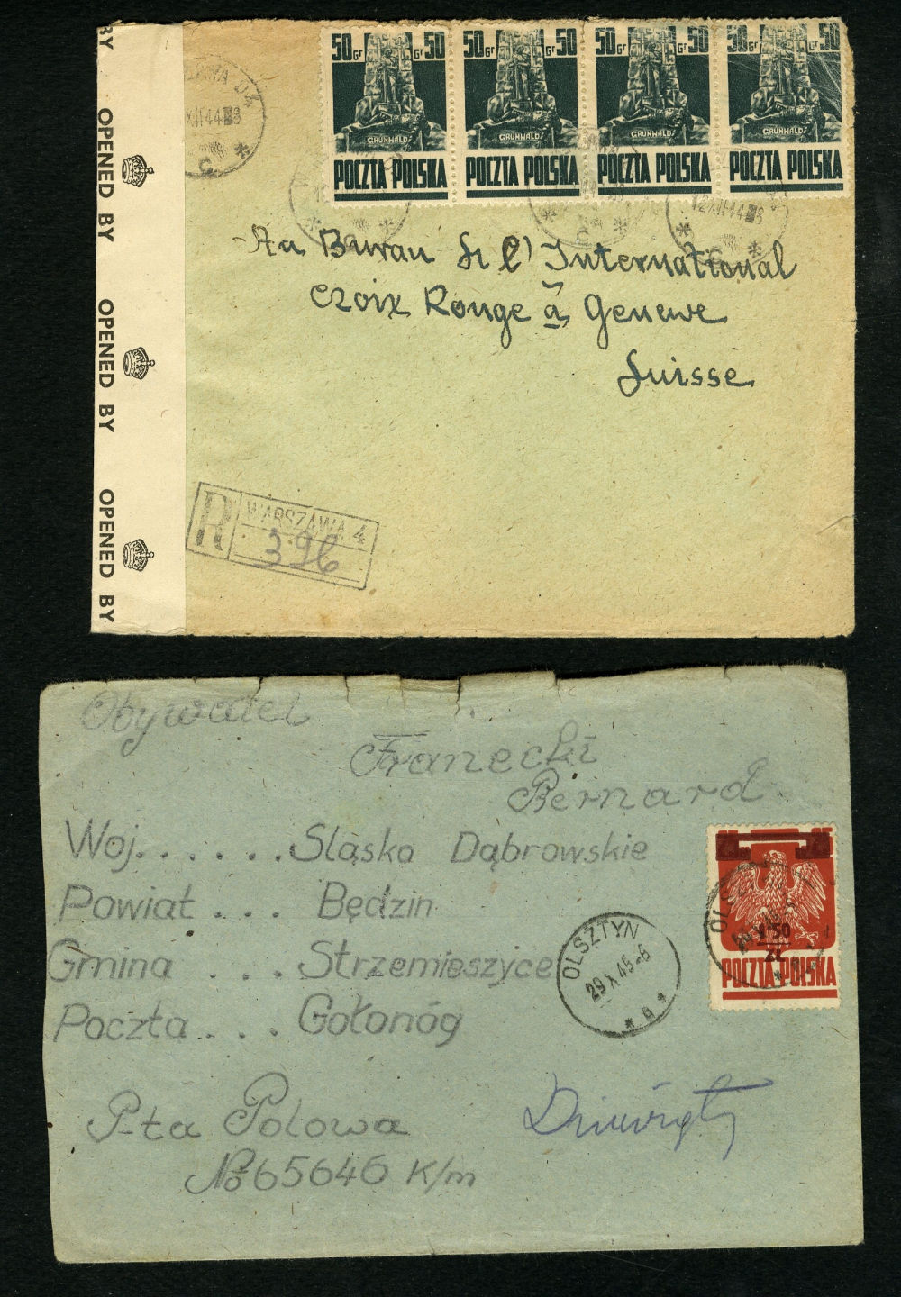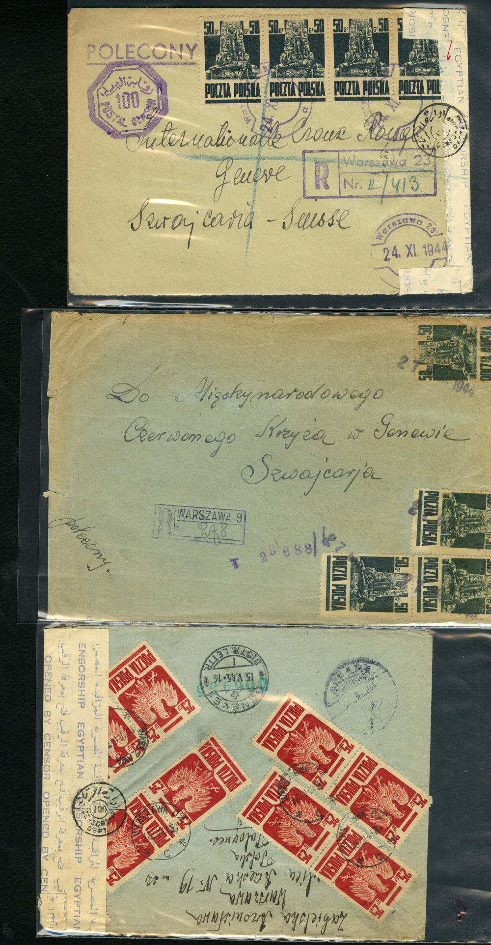 1418 COVER   imagePOLAND 1944-46 Mail to the Red Cross, mostly in Geneva, generally from Warsaw and post offices outside, used during WWII and in the early days of Polish People''s Republic, selection of 97 covers, some partly described on exhibit pages, showing variety of rates, censor markings, handstamped Registration boxes, generally franked with Goznak stamps, also a few later, some provincial and uncommon origins and destinations, many routed via Turkey, Egypt, Lebanon, Gibraltar, some bearing Generalgouvernement Registry labels, many 100+ days in transit, mixed condition, fine-v.f., captivating assembly (accompanied by a corresponding manuscript by Chris Kulpinski, Re-written, May 2009)