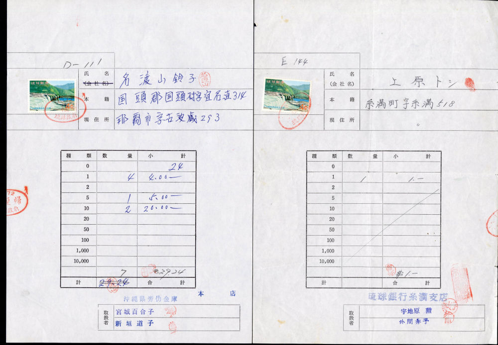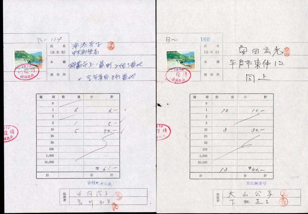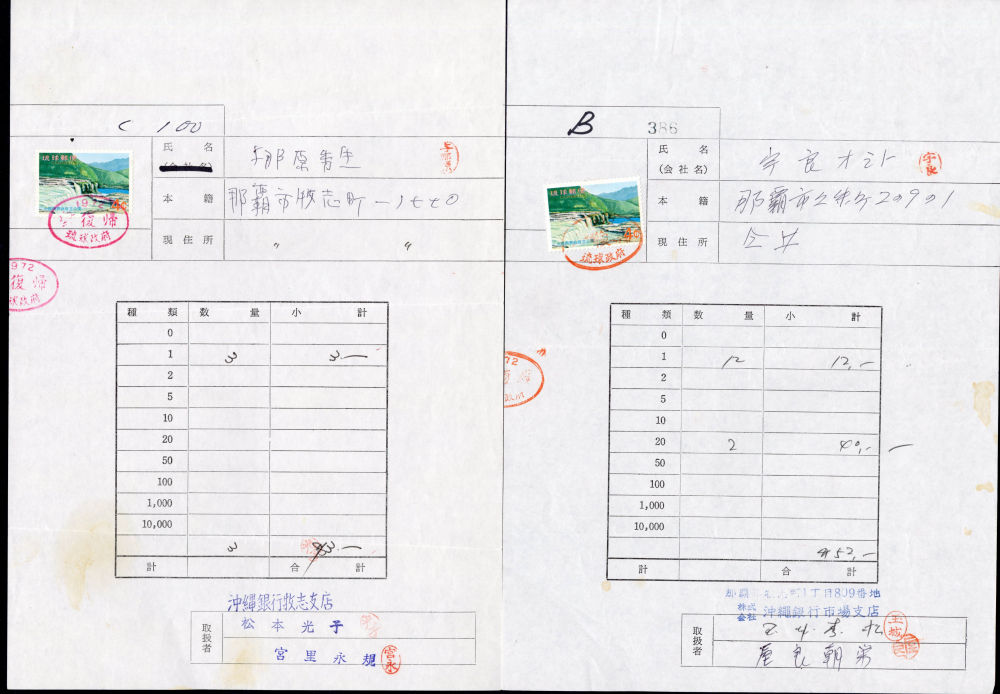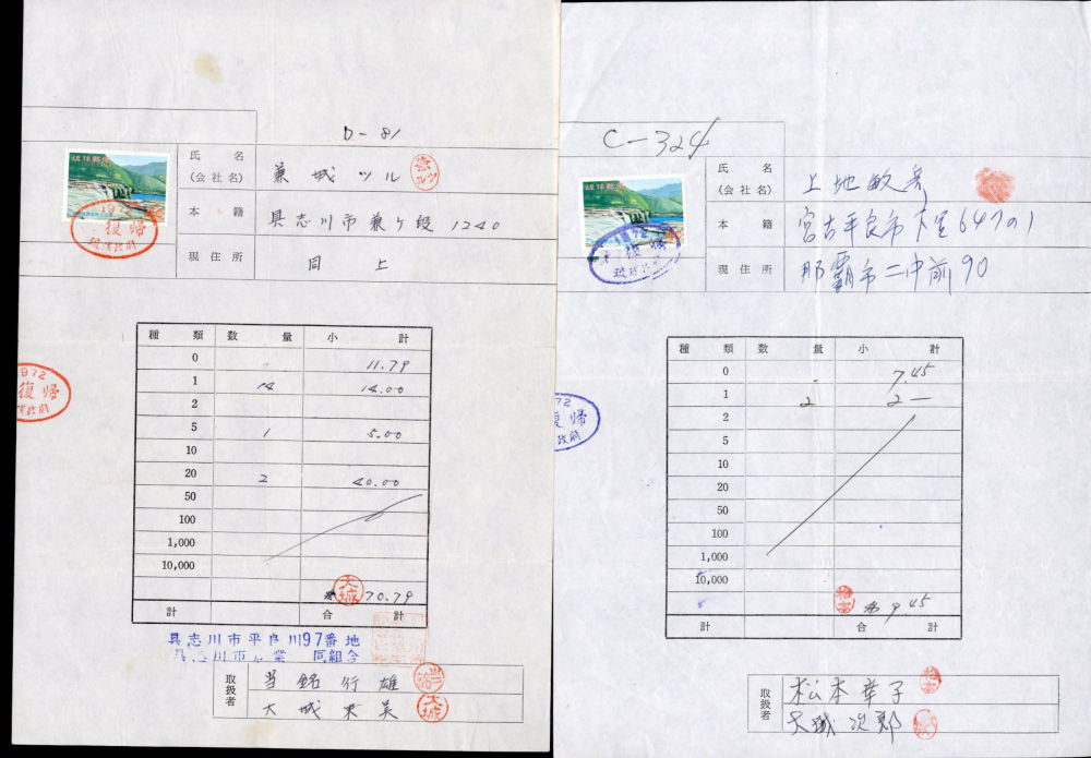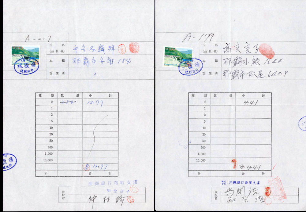 1426   imageRYUKYU ISLANDS 1971 unissued 4c Iriomote Park single on Emergency Conversion Confirmation Certificates, 10 copies, various red seals and chops, fine (see footnote in Scott following No.RQ8)2250 (Image) (Image 2) (Image 3) (Image 4) (Image 5) (All Images)
