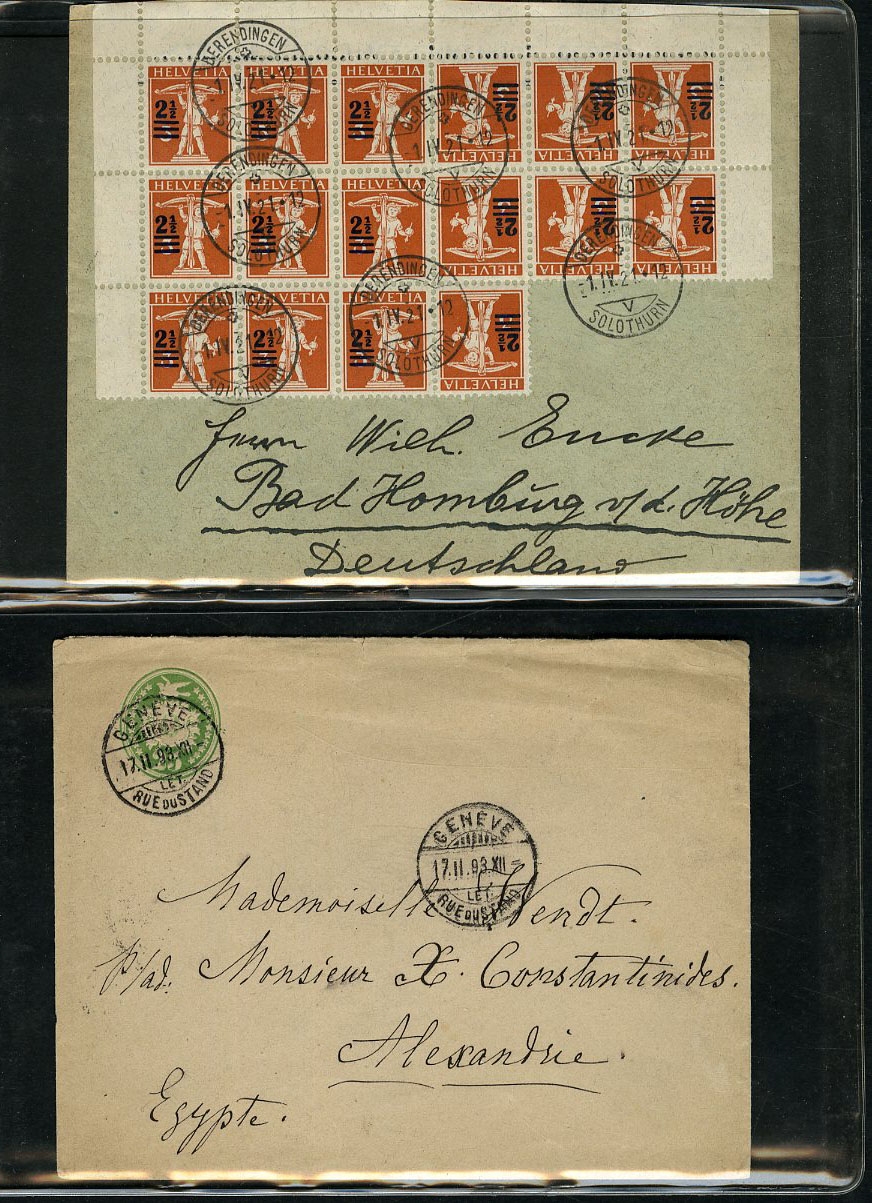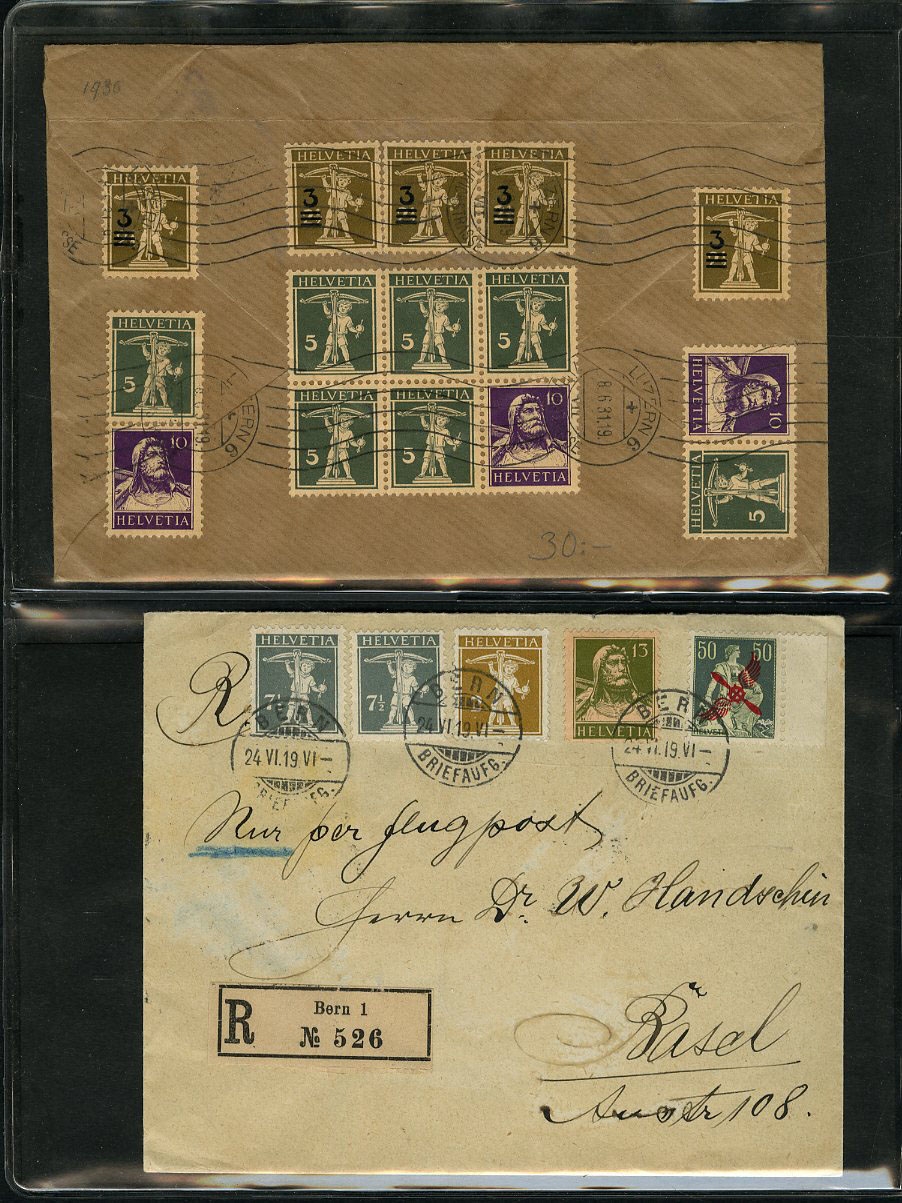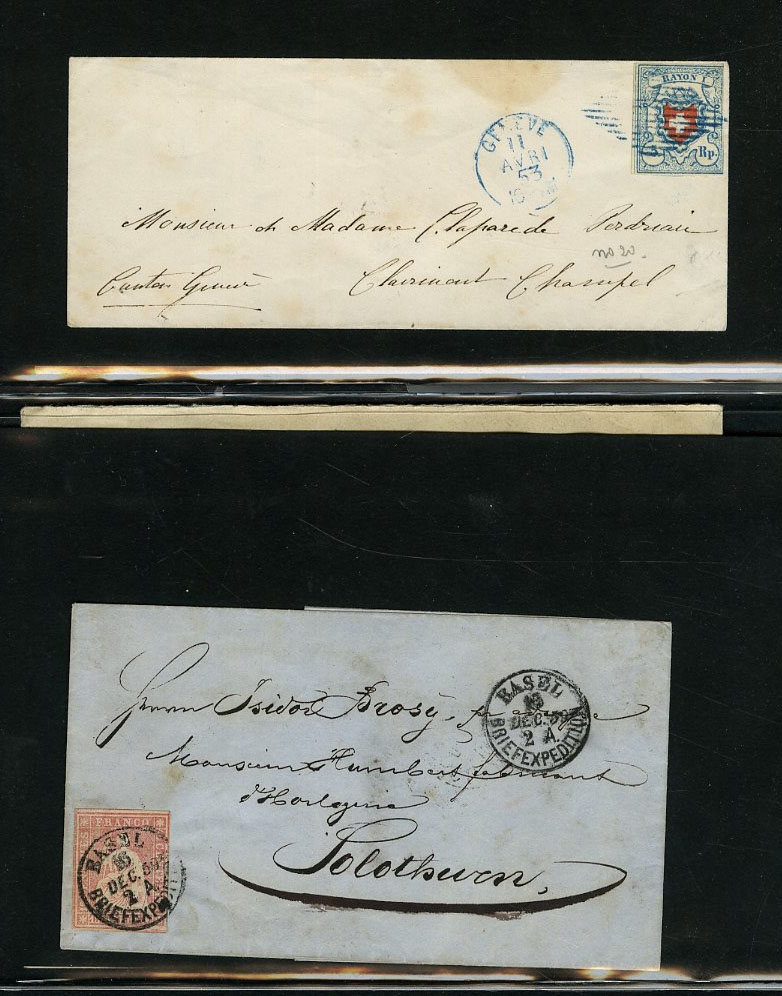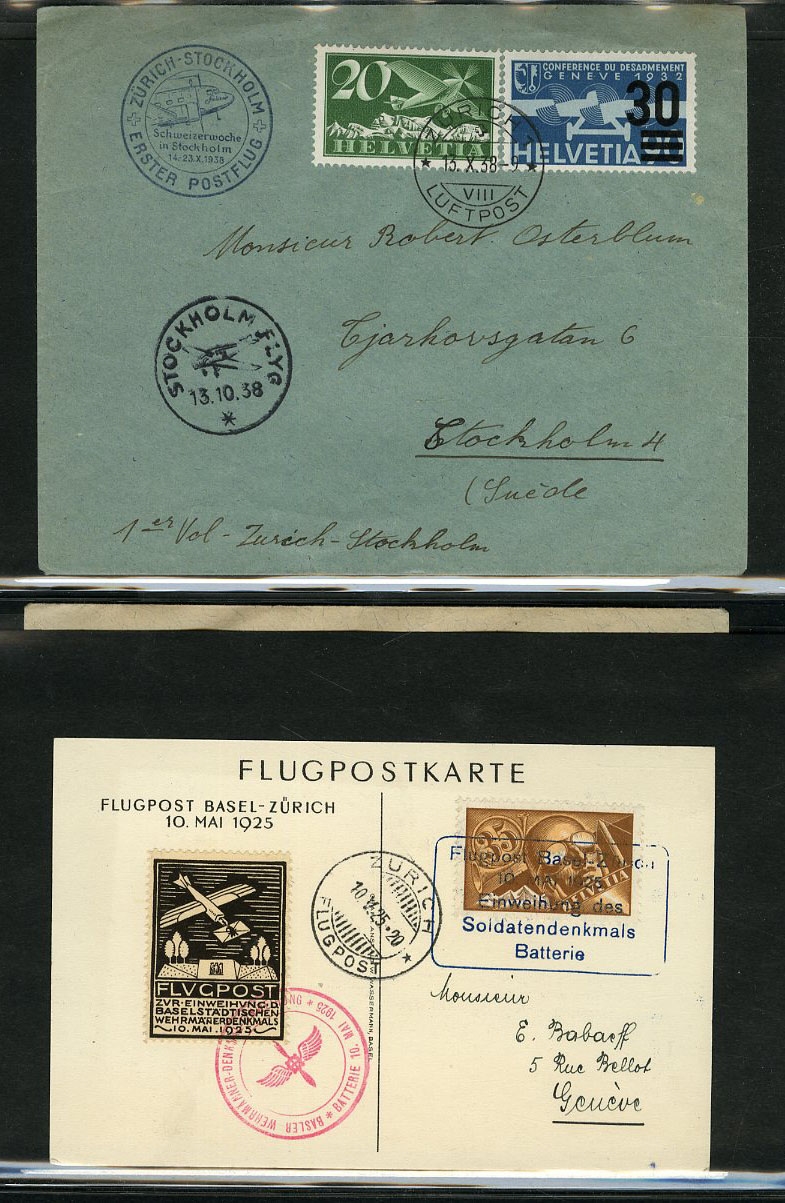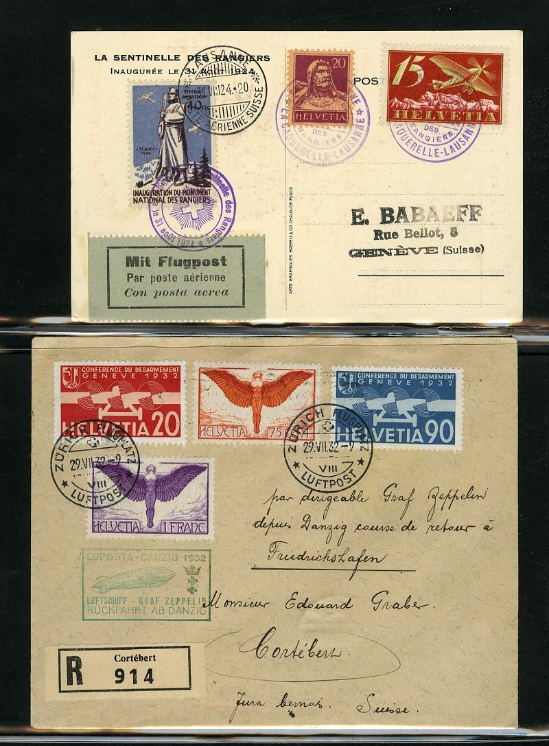 1433 COVER   imageSWITZERLAND 1853-1938 selection of 15 better items with 1853 cover franked 5rp blue & red, 1859 Sitting Helvetia 15r on cover, 1919 50c Air Post overprint on combination cover, 1932 LUPOSTA Zeppelin flight cover, 1938 Zurich-Stockholm flight, "Rangiers" label on 1920 card, 1925 Flugpost label in black on card, tete-beche issues on covers, early stationery items, parcel cards, etc. (Image) (Image 2) (Image 3) (Image 4) (Image 5) (Image 6) (Image 7) (Image 8) (All Images)