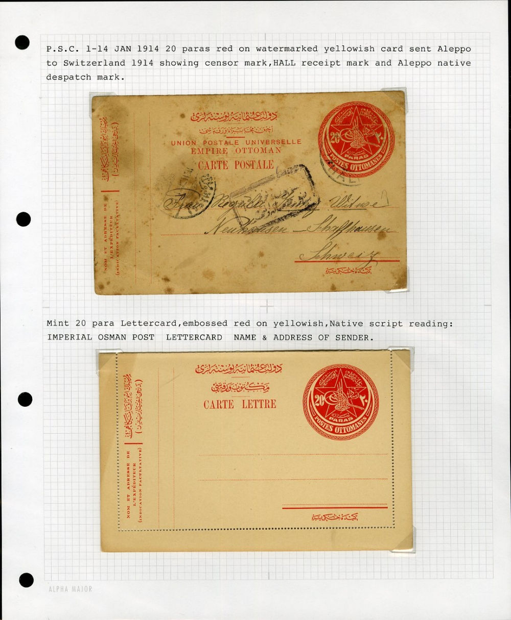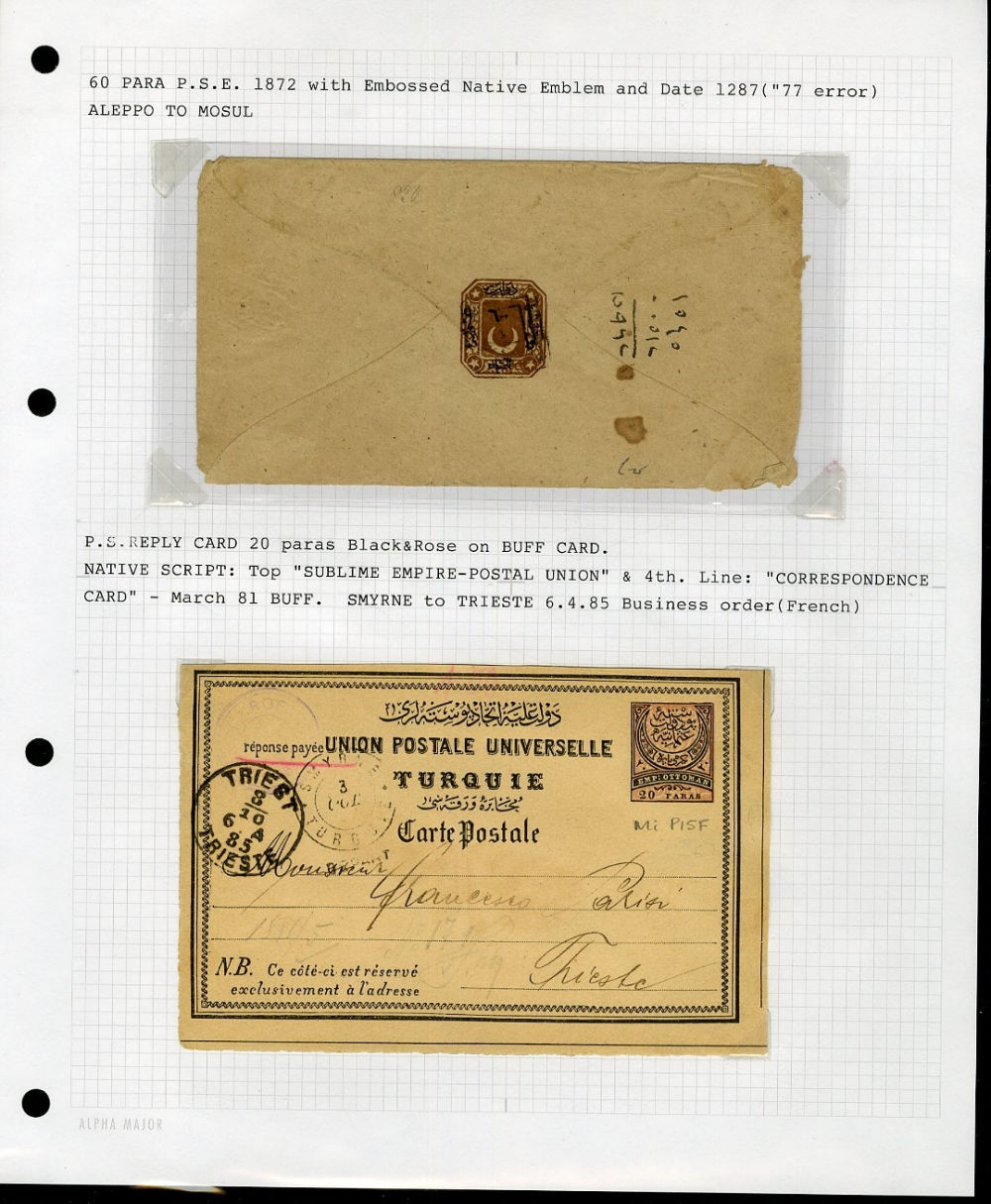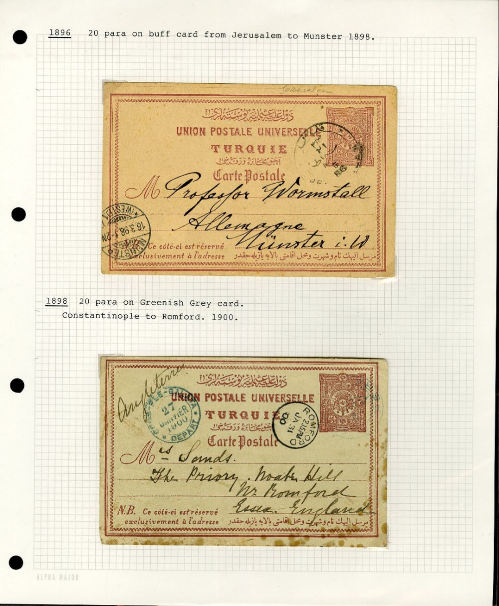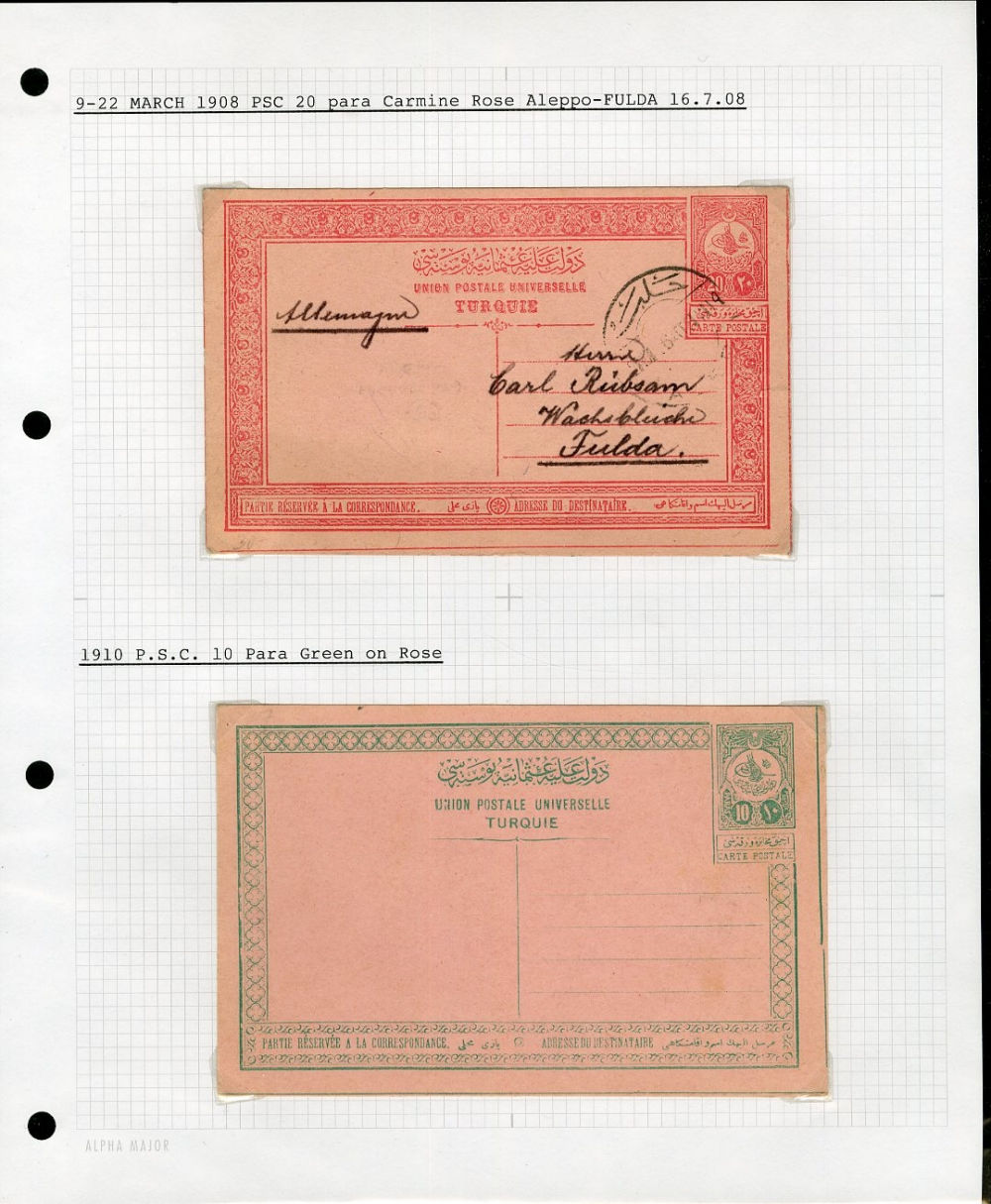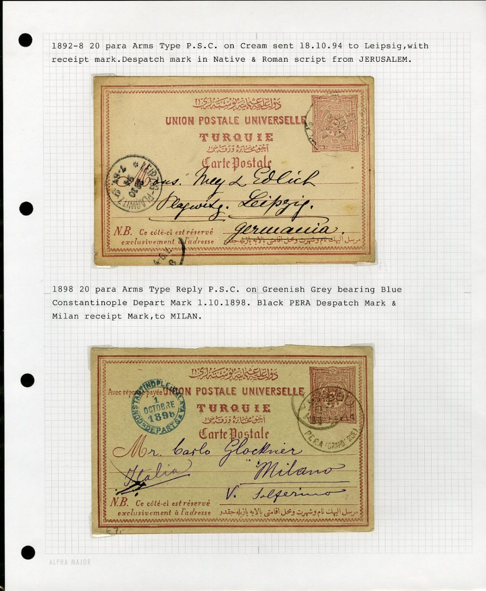 1436 COVER   imageTURKEY 1880-1920 Ottoman Empire, selection of 81 stationery items and covers, used and unused, written up on album leaves with wealth of cancelations and markings to a variety of destinations, used in Syria, Iraq, Holy Land with a Beni Saab card, Salonica, etc. A fine group (Image) (Image 2) (Image 3) (Image 4) (Image 5) (Image 6) (Image 7) (Image 8) (Image 9) (Image 10) (Image 11) (Image 12) (Image 13) (Image 14) (Image 15) (Image 16) (Image 17) (Image 18) (Image 19) (Image 20) (Image 21) (Image 22) (Image 23) (Image 24) (Image 25) (Image 26) (Image 27) (Image 28) (Image 29) (Image 30) (Image 31) (Image 32) (Image 33) (Image 34) (Image 35) (Image 36) (Image 37) (Image 38) (Image 39) (Image 40) (Image 41) (Image 42) (Image 43) (Image 44) (All Images)