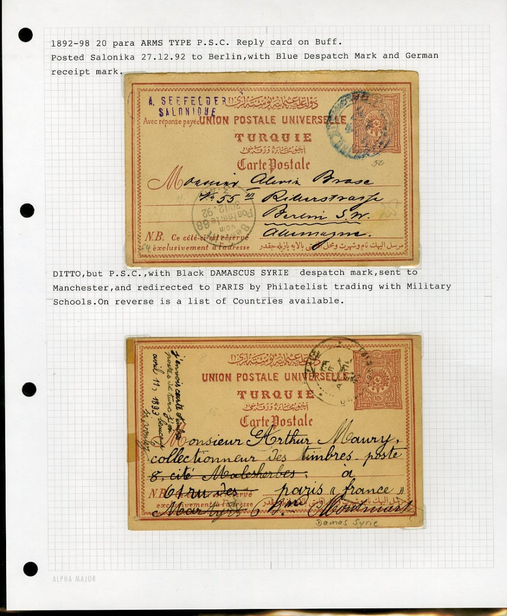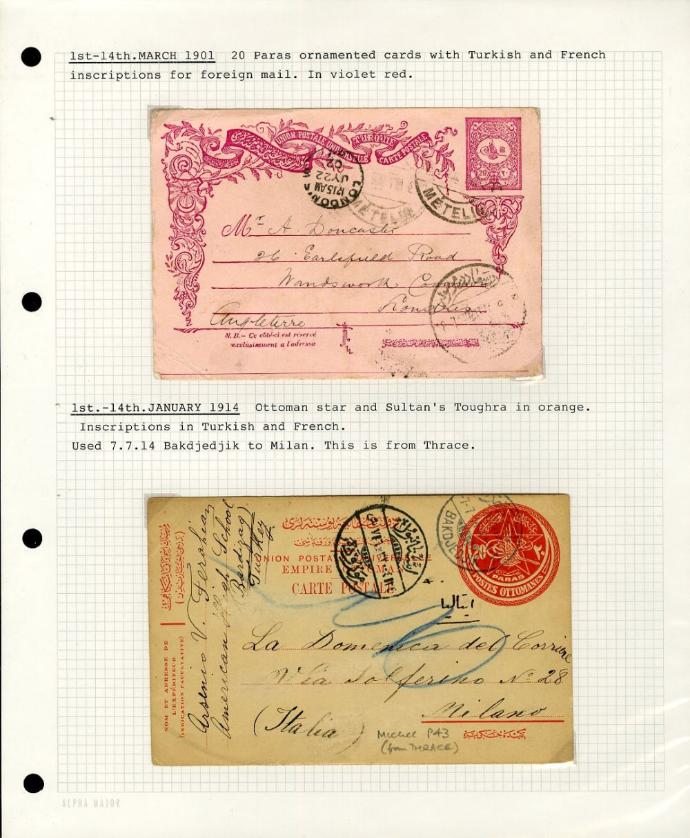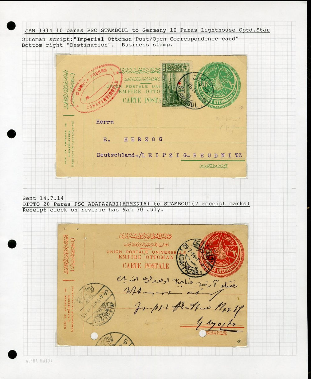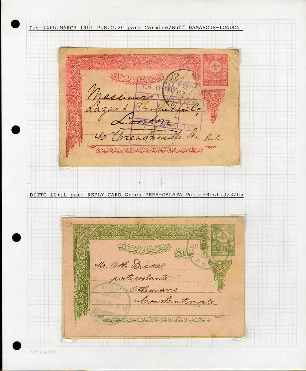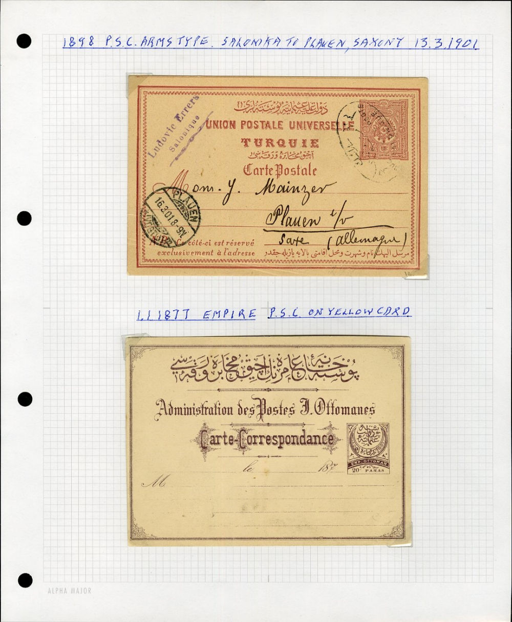 1436 COVER   imageTURKEY 1880-1920 Ottoman Empire, selection of 81 stationery items and covers, used and unused, written up on album leaves with wealth of cancelations and markings to a variety of destinations, used in Syria, Iraq, Holy Land with a Beni Saab card, Salonica, etc. A fine group (Image) (Image 2) (Image 3) (Image 4) (Image 5) (Image 6) (Image 7) (Image 8) (Image 9) (Image 10) (Image 11) (Image 12) (Image 13) (Image 14) (Image 15) (Image 16) (Image 17) (Image 18) (Image 19) (Image 20) (Image 21) (Image 22) (Image 23) (Image 24) (Image 25) (Image 26) (Image 27) (Image 28) (Image 29) (Image 30) (Image 31) (Image 32) (Image 33) (Image 34) (Image 35) (Image 36) (Image 37) (Image 38) (Image 39) (Image 40) (Image 41) (Image 42) (Image 43) (Image 44) (All Images)