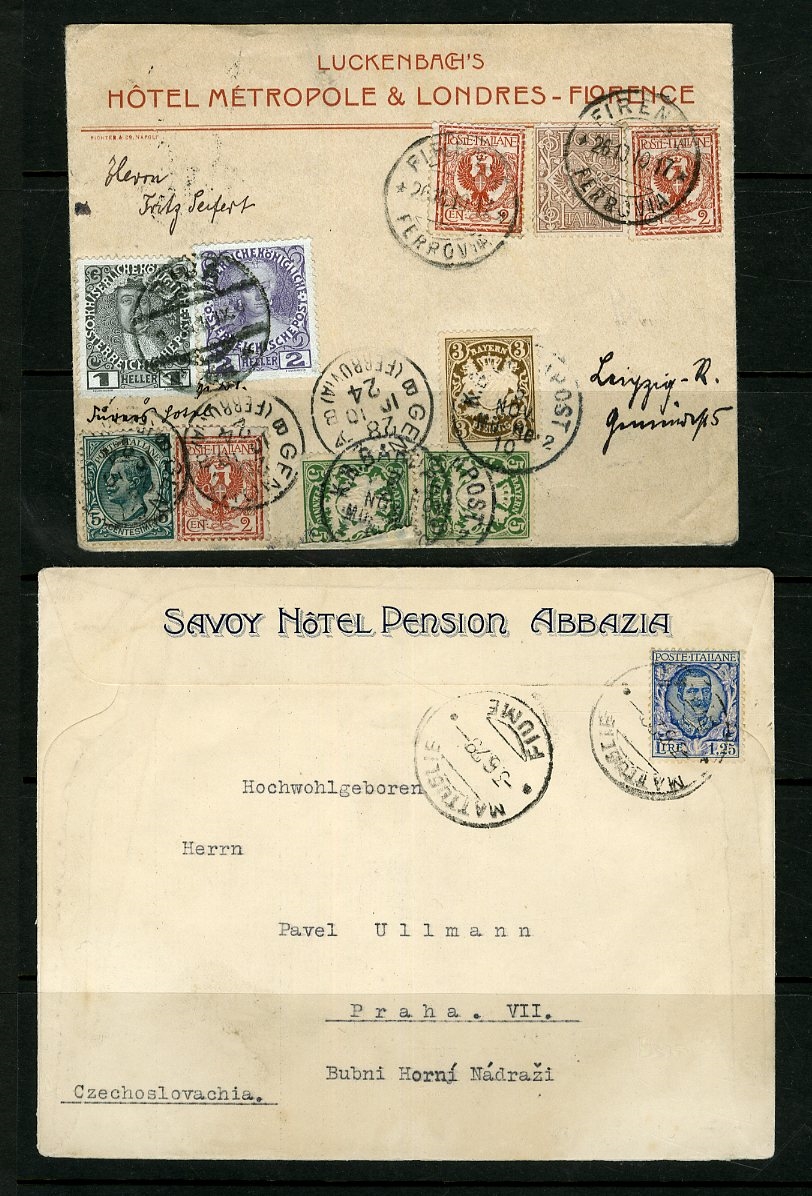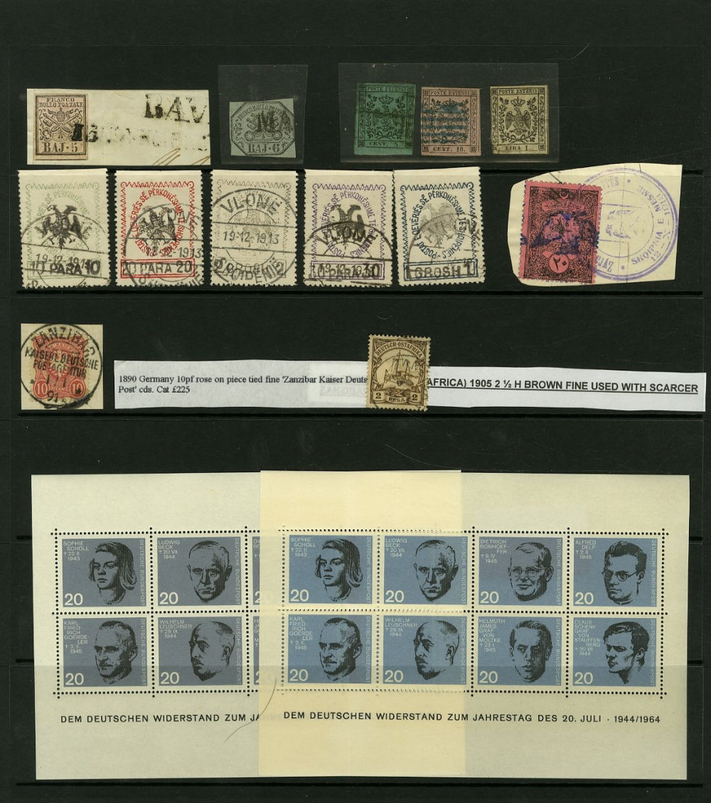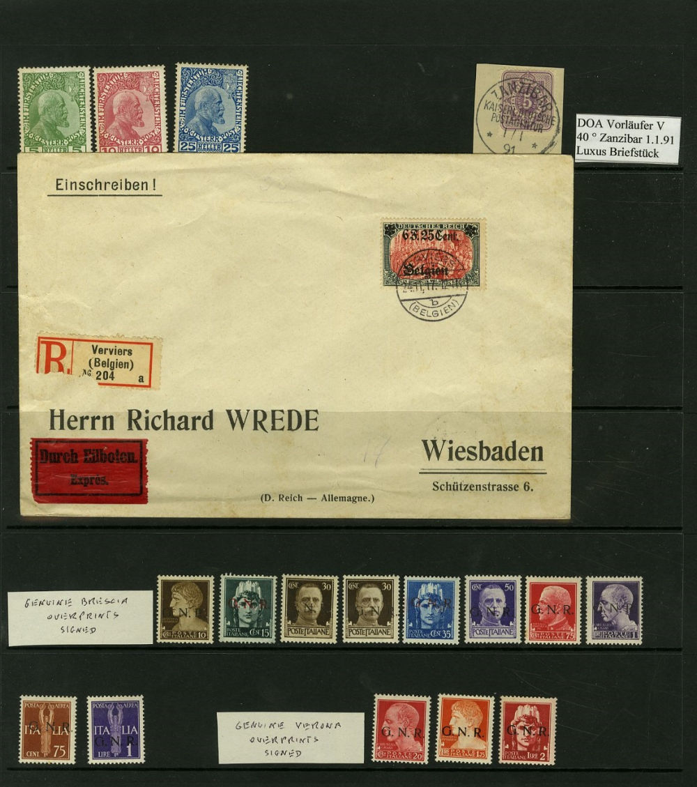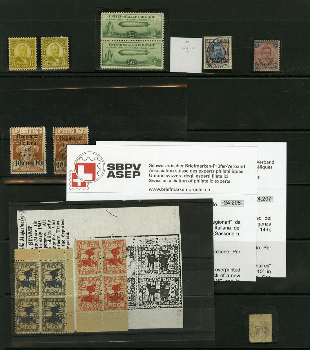 1443 O, og, COVER   imageWORLDWIDE COLLECTIONS and BALANCES 1865-1933 balance of a consignment on stock cards and album pages, United States 50c Zeppelin (C18) pair n.h., 1922-26 2c Washington selection, one stamp with "hair and ear" re-entry, Albania, Belgium German Occupation 1916-18 6fr25c on 5m on registered cover (cat.$450), China 1911 Hukuang Railways Bond, Italy G.N.R. overprints to 2L, n.h. signed Avi, also two first flight covers, a 1926 Venice-Vienna franked Air 5L green (cat $325), 1927 Rome-Vienna franked Air 1.50L buff, Fiume and Italy Hotel covers, the latter from Firenze to Leipzig, with Italian, Austrian and Bavarian franking, 1915 Taxed card to Tunisia franked with Tunisia 10c brown Postage Due, de Penido commemorative post card, Firenze Campo di Marte Circuto Aereo stamps, Fiume 1920 Legionary and Carnaro, used and unused (Sass.146,146A), with Avi Certificates, Eritrea 1892 5L blue and rose unused signed Diena, Tripoli 5L blue & rose used on piece, signed Dr Avi; Liechtenstein 1912 three values unused, France Colmar issues, miscellaneous North Korea, Romania Judaica "Satu Mare "Pentru Deportati" 100l and 200l marginal blocks of four, Tannu Tuva collection with complete used and unused sets, etc., mixed condition, interesting group (Image) (Image 2) (Image 3) (Image 4) (Image 5) (Image 6) (Image 7) (Image 8) (Image 9) (Image 10) (Image 11) (Image 12) (Image 13) (Image 14) (Image 15) (Image 16) (Image 17) (Image 18) (Image 19) (Image 20) (Image 21) (Image 22) (Image 23) (Image 24) (Image 25) (Image 26) (Image 27) (Image 28) (Image 29) (Image 30) (Image 31) (All Images)