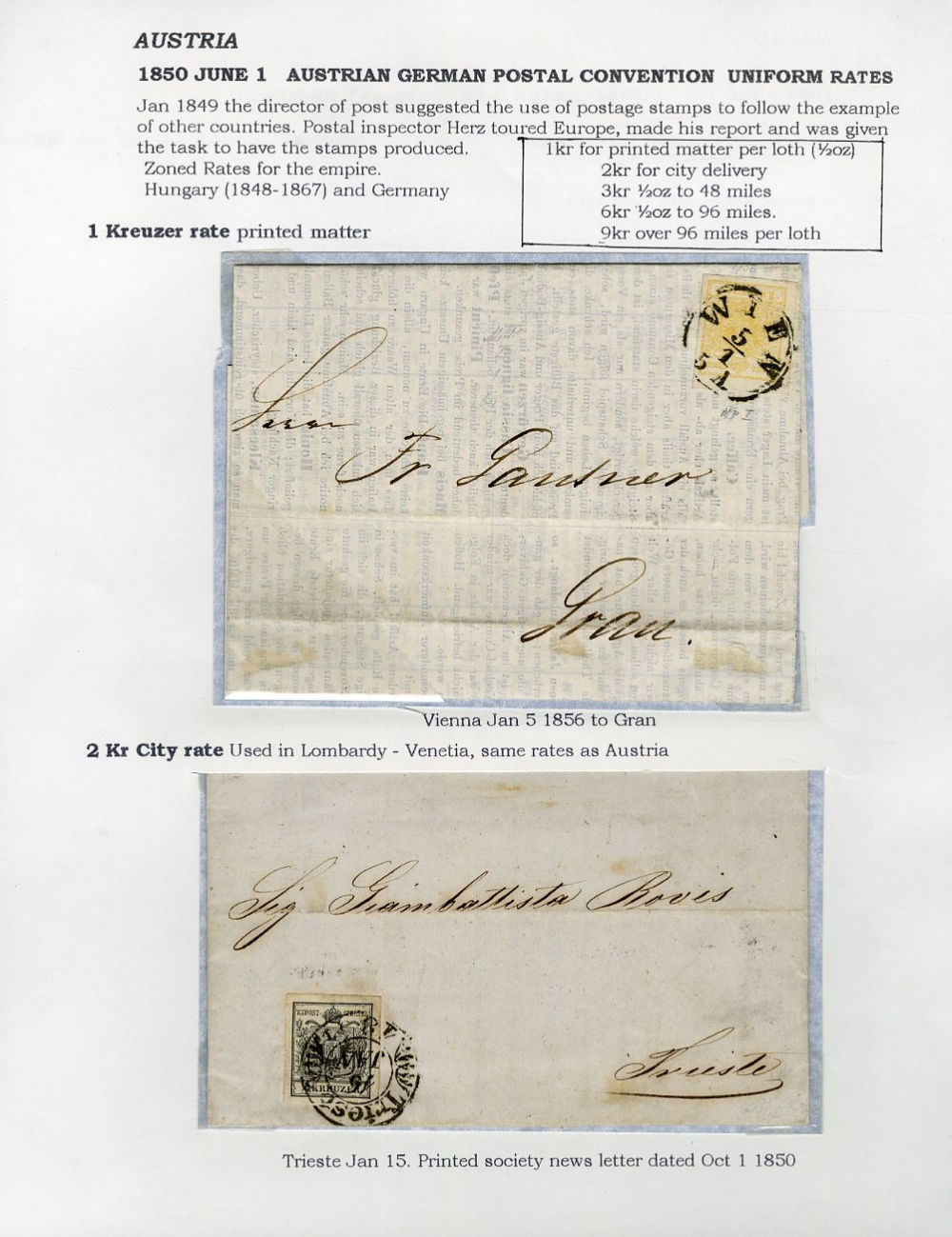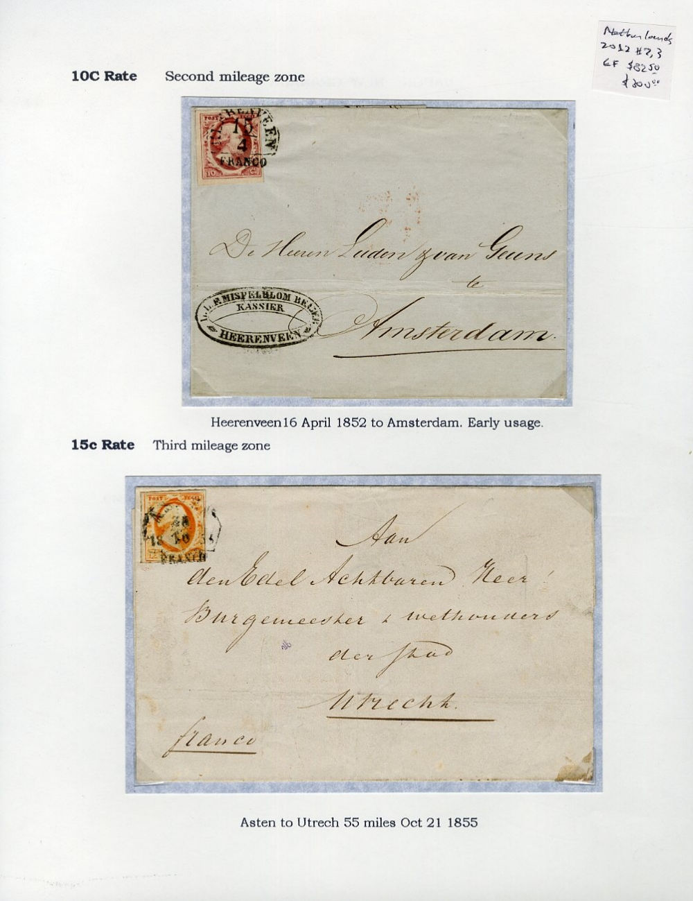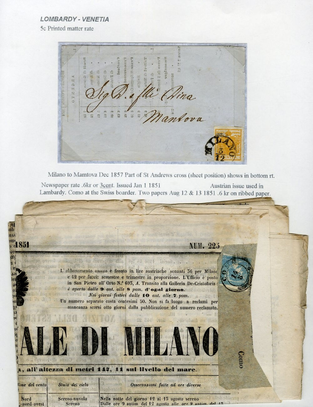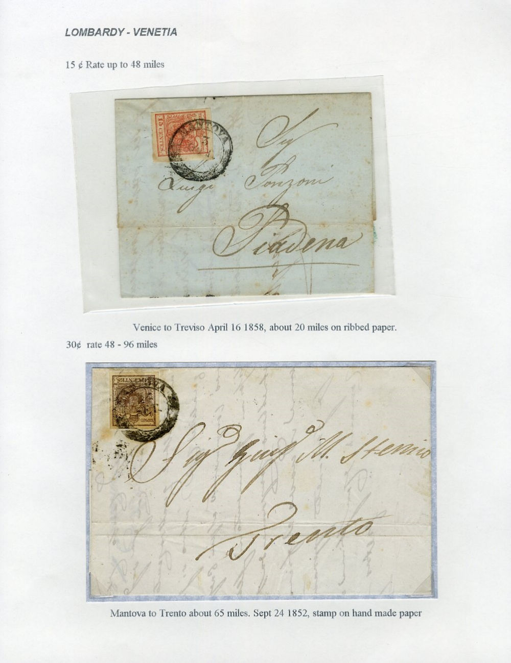 1455 COVER   imageWORLDWIDE COLLECTIONS and BALANCES 1849-1862 First Issue stamps on cover, selection on exhibit pages, showing Austria 1850 1kr yellow on FL from Wien to Graz, 2kr gray black on FL used internally in Trieste (Lombardy Venetia), 9kr blue on FL from Trieste to Amsterdam; Lombardy-Venetia 5c orange, printed matter from Milano to Mantova, Newspaper (0.6kr) 3c ribbed paper on complete "Gazetta Ufficiale Di Milano" used in Como, also 15c and 30c individual FLs, Belgium 1859 10c and 20c on FLs, France 40c orange on FL from Bordeaux to Nyon, Switzerland (von Der Weid certificate), 1fr carmine brown (YT 6c) on FL from Paris to Bordeaux (Calves certificate); Greece 1861 Hermes Heads, 1 Lepta chocolate brown (three ample margins, just in at top), on part of newspaper (APS certificate), 20 Lepta, two FLs, also 40 Lepta and 80 Lepta, each early (October 1861) usage on FLs, Luxembourg 1852 domestic rate from Clairvaux to Diekirch, 10c gray black on coverfront, 1sgr on FL to Trier. Also included are three FLs from Netherlands, bearing 5c, 10c and 15c single frankings, used domestically; Ionian Islands 1869 1p blue, cut in at left, with double ring cds Zakynthos 22 Aug pmk, addressed to Zante. A fine and attractive group of imperforate classics on cover, mostly with margins all around, sound and fine-v.f. (Image) (Image 2) (Image 3) (Image 4) (Image 5) (Image 6) (Image 7) (Image 8) (Image 9) (Image 10) (Image 11) (Image 12) (Image 13) (All Images)