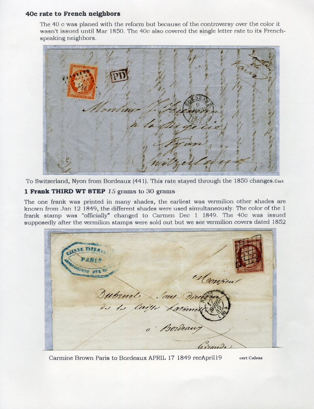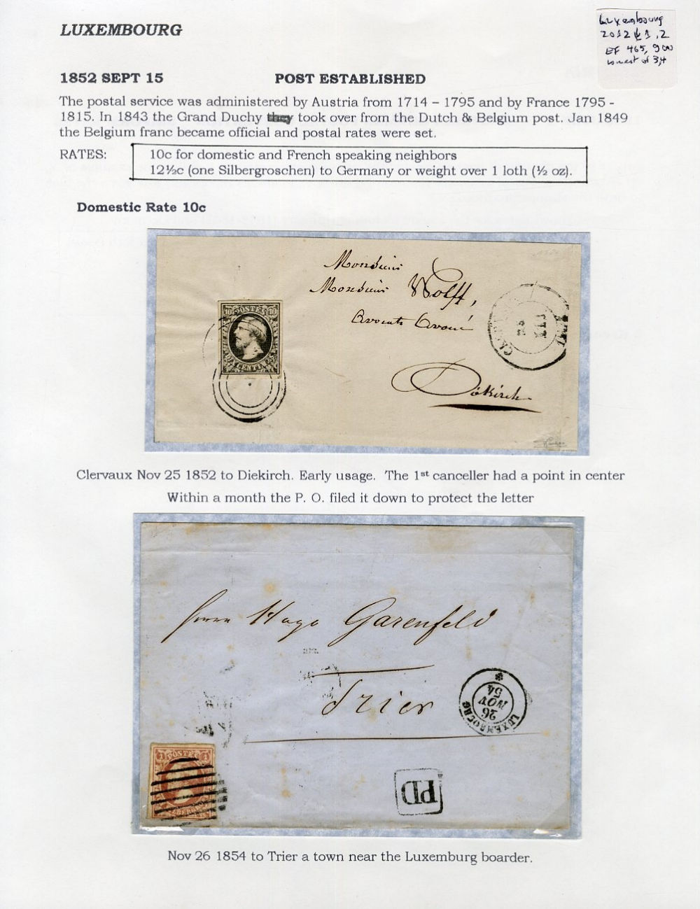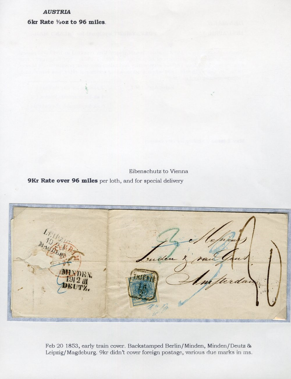 1455 COVER   imageWORLDWIDE COLLECTIONS and BALANCES 1849-1862 First Issue stamps on cover, selection on exhibit pages, showing Austria 1850 1kr yellow on FL from Wien to Graz, 2kr gray black on FL used internally in Trieste (Lombardy Venetia), 9kr blue on FL from Trieste to Amsterdam; Lombardy-Venetia 5c orange, printed matter from Milano to Mantova, Newspaper (0.6kr) 3c ribbed paper on complete "Gazetta Ufficiale Di Milano" used in Como, also 15c and 30c individual FLs, Belgium 1859 10c and 20c on FLs, France 40c orange on FL from Bordeaux to Nyon, Switzerland (von Der Weid certificate), 1fr carmine brown (YT 6c) on FL from Paris to Bordeaux (Calves certificate); Greece 1861 Hermes Heads, 1 Lepta chocolate brown (three ample margins, just in at top), on part of newspaper (APS certificate), 20 Lepta, two FLs, also 40 Lepta and 80 Lepta, each early (October 1861) usage on FLs, Luxembourg 1852 domestic rate from Clairvaux to Diekirch, 10c gray black on coverfront, 1sgr on FL to Trier. Also included are three FLs from Netherlands, bearing 5c, 10c and 15c single frankings, used domestically; Ionian Islands 1869 1p blue, cut in at left, with double ring cds Zakynthos 22 Aug pmk, addressed to Zante. A fine and attractive group of imperforate classics on cover, mostly with margins all around, sound and fine-v.f. (Image) (Image 2) (Image 3) (Image 4) (Image 5) (Image 6) (Image 7) (Image 8) (Image 9) (Image 10) (Image 11) (Image 12) (Image 13) (All Images)