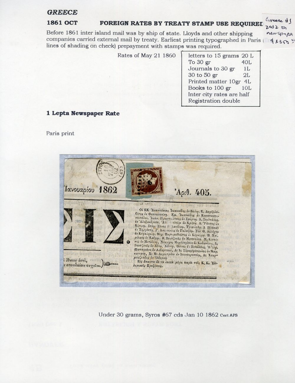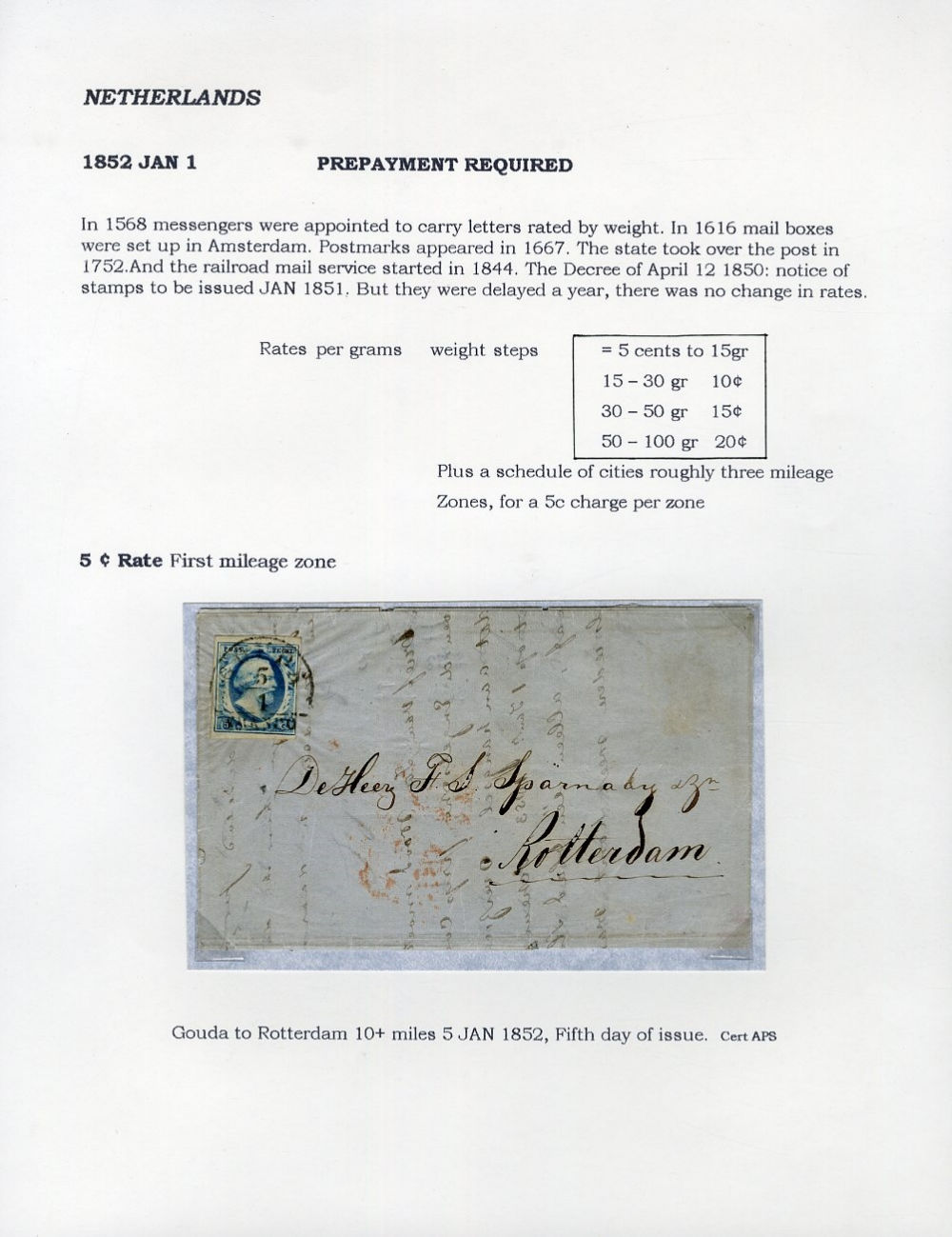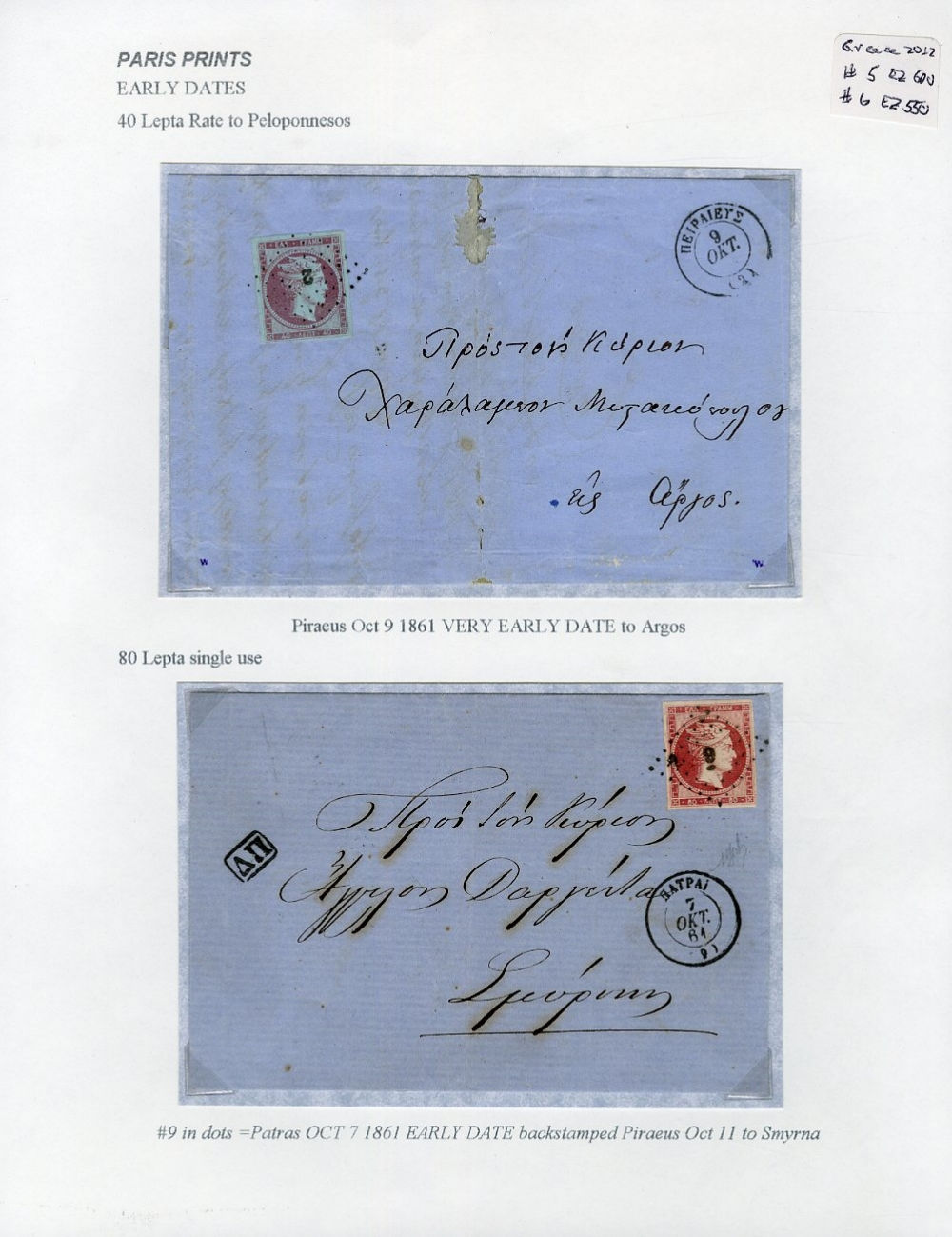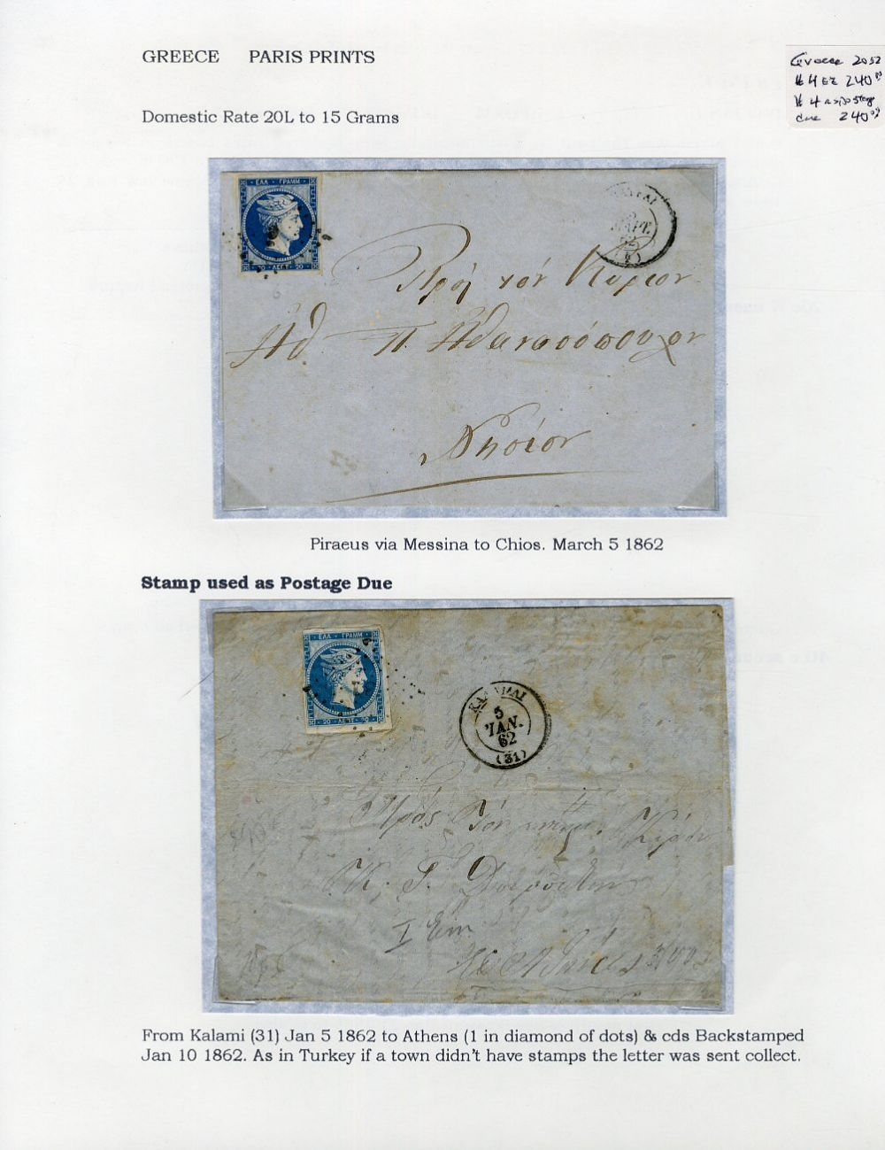 1455 COVER   imageWORLDWIDE COLLECTIONS and BALANCES 1849-1862 First Issue stamps on cover, selection on exhibit pages, showing Austria 1850 1kr yellow on FL from Wien to Graz, 2kr gray black on FL used internally in Trieste (Lombardy Venetia), 9kr blue on FL from Trieste to Amsterdam; Lombardy-Venetia 5c orange, printed matter from Milano to Mantova, Newspaper (0.6kr) 3c ribbed paper on complete "Gazetta Ufficiale Di Milano" used in Como, also 15c and 30c individual FLs, Belgium 1859 10c and 20c on FLs, France 40c orange on FL from Bordeaux to Nyon, Switzerland (von Der Weid certificate), 1fr carmine brown (YT 6c) on FL from Paris to Bordeaux (Calves certificate); Greece 1861 Hermes Heads, 1 Lepta chocolate brown (three ample margins, just in at top), on part of newspaper (APS certificate), 20 Lepta, two FLs, also 40 Lepta and 80 Lepta, each early (October 1861) usage on FLs, Luxembourg 1852 domestic rate from Clairvaux to Diekirch, 10c gray black on coverfront, 1sgr on FL to Trier. Also included are three FLs from Netherlands, bearing 5c, 10c and 15c single frankings, used domestically; Ionian Islands 1869 1p blue, cut in at left, with double ring cds Zakynthos 22 Aug pmk, addressed to Zante. A fine and attractive group of imperforate classics on cover, mostly with margins all around, sound and fine-v.f. (Image) (Image 2) (Image 3) (Image 4) (Image 5) (Image 6) (Image 7) (Image 8) (Image 9) (Image 10) (Image 11) (Image 12) (Image 13) (All Images)