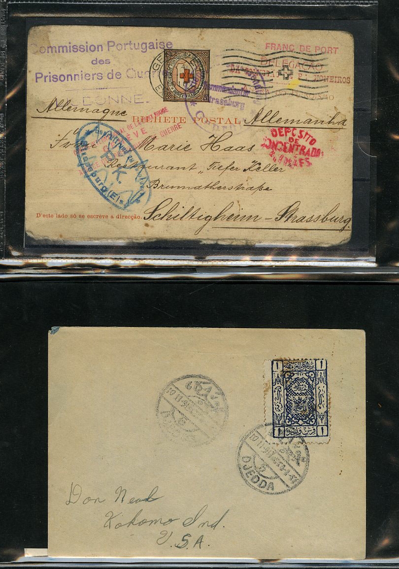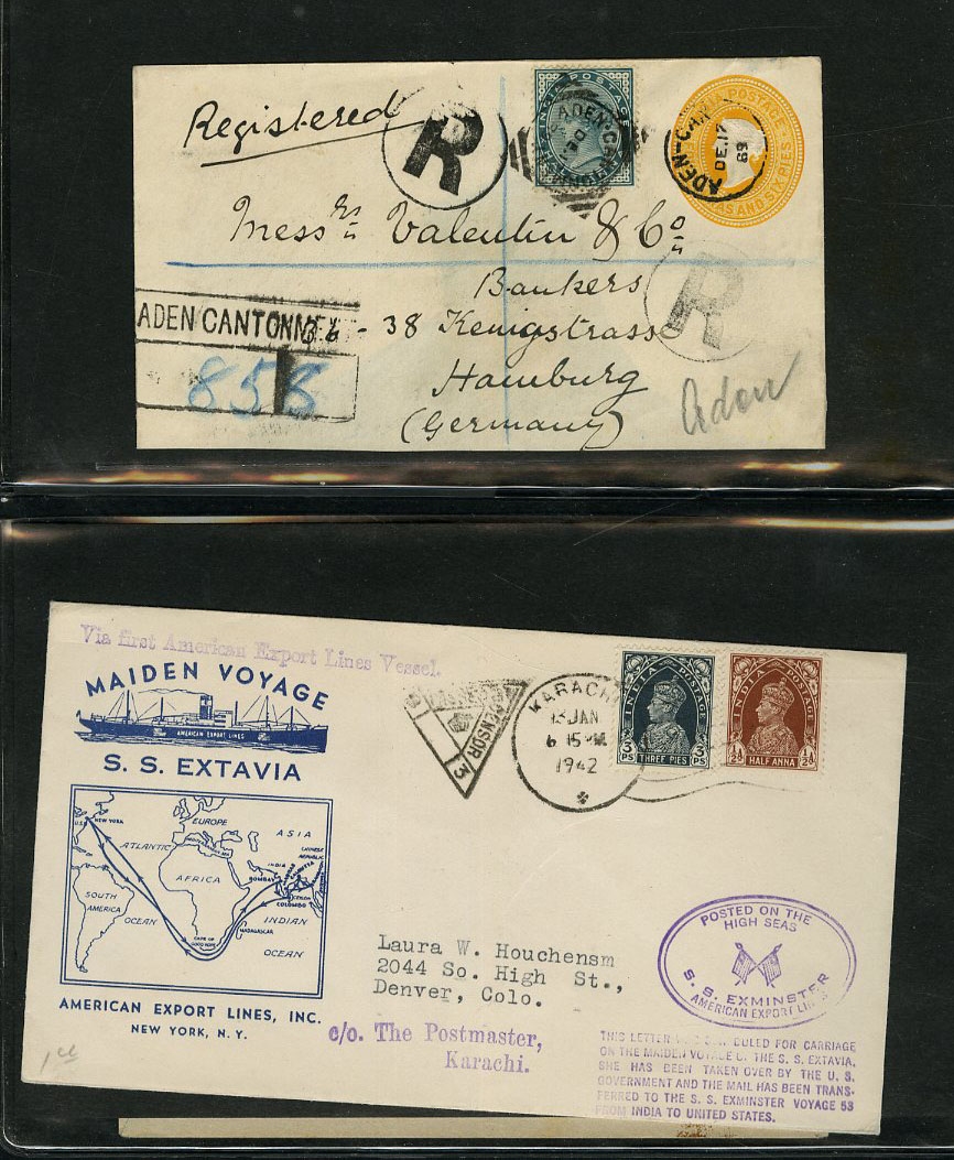 1456 COVER   imageWORLDWIDE COLLECTIONS and BALANCES 1868-1934 selection of 48 covers or cards, with Aden 1889 uprated registered stationery cover to Hamburg canceled "ADEN CANTONMENT/DE" (scarce), Austria 1936 FIS set of four on registered cover, Belgium 1933-34 Tuberculosis and Crusader sets on registered covers, Czechoslovakia 1926 Sokol set on registered cover, Germany Hitler Occupation overprints, India/Pakistan 1942 SS Extavia cover, Malta 1868 letter to France, franked with Great Britain Queen Victoria 4d (Pl.10) tied by "MALTA A25" oval duplex to Marseille, Portugal 1916 POW card, Spanish Guinea, Sweden with early covers and parcel cards, etc. (Image) (Image 2) (Image 3) (Image 4) (Image 5) (Image 6) (Image 7) (Image 8) (Image 9) (Image 10) (Image 11) (Image 12) (Image 13) (Image 14) (Image 15) (Image 16) (Image 17) (Image 18) (Image 19) (Image 20) (Image 21) (Image 22) (Image 23) (Image 24) (Image 25) (All Images)