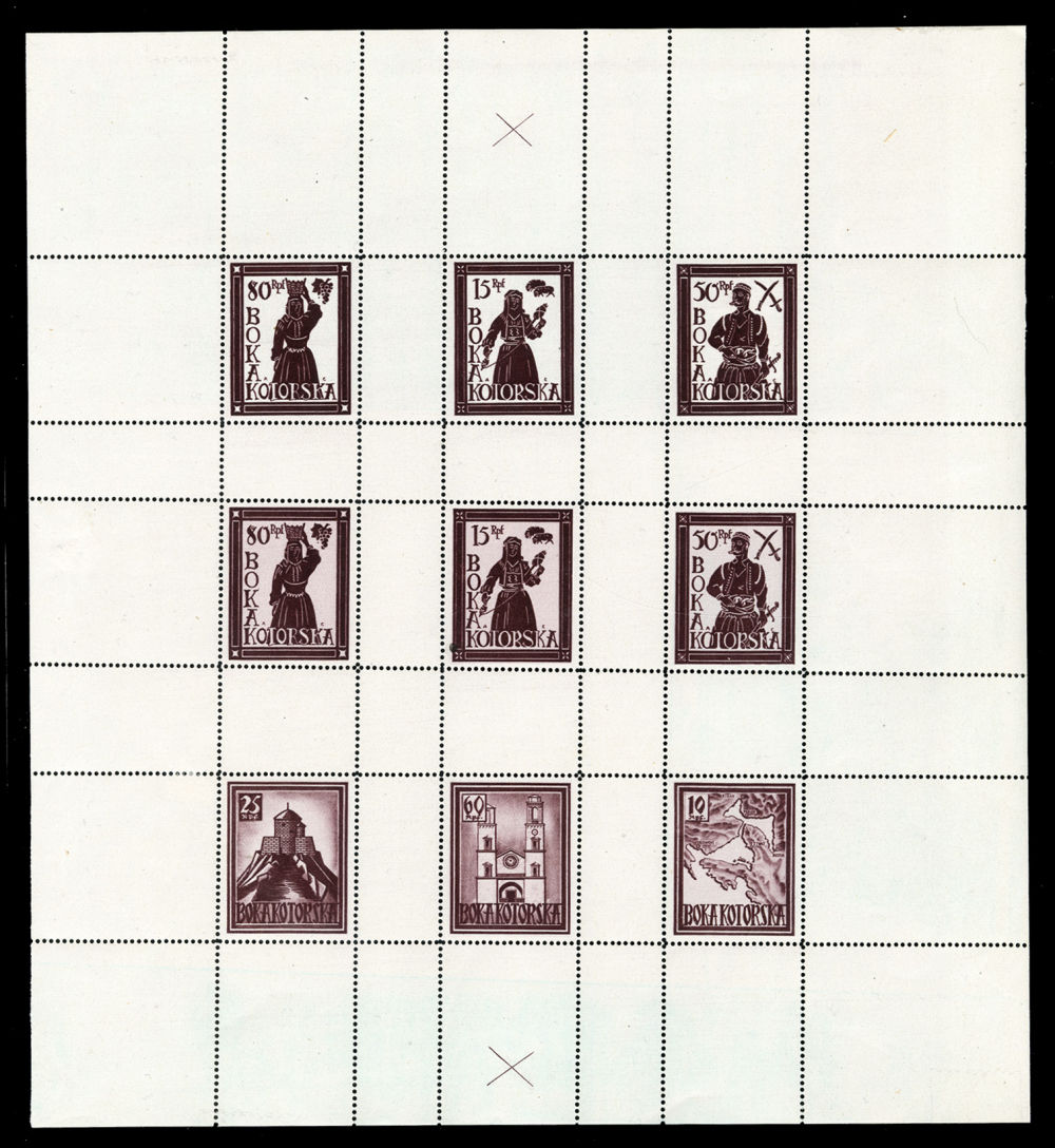 Zd-2) 1944 pictorials, unissued set of six, plus additional three values without groundwork, perforated and gummed sheetlet of nine, with intact margins all around, apparently unfolded, stamps n.h., couple of inclusions visible on back, also some gum