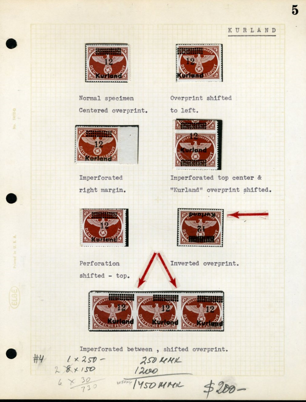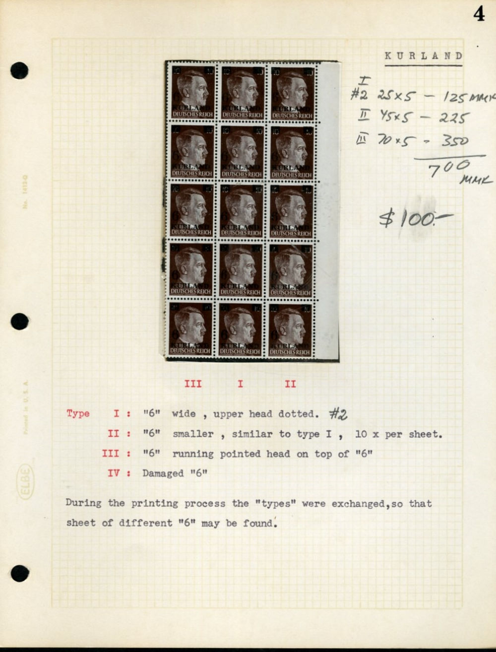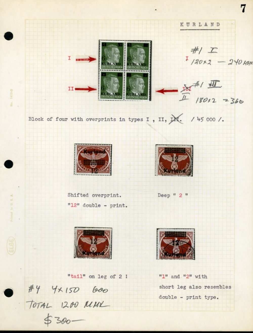 1945 surcharges, specialized group on pages, 71 stamps showing variety of types, blocks of four and larger, errors and varieties, including inverted overprint, shifted and displaced surcharges, etc., mounted on album pages, with old valuations,