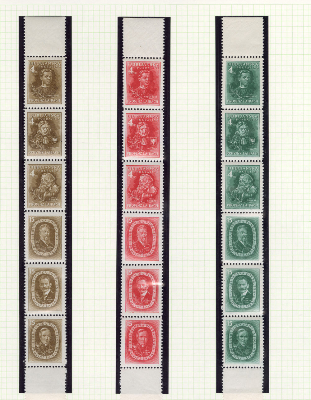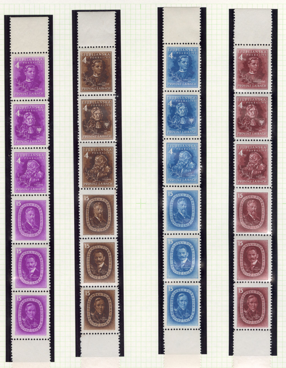 (Mi.IA-VIA) 1945 Famous Slovenes, unissued set of six, seven vertical se-tenant strips of three, various colors, n.h., fine-v.f., €4,200