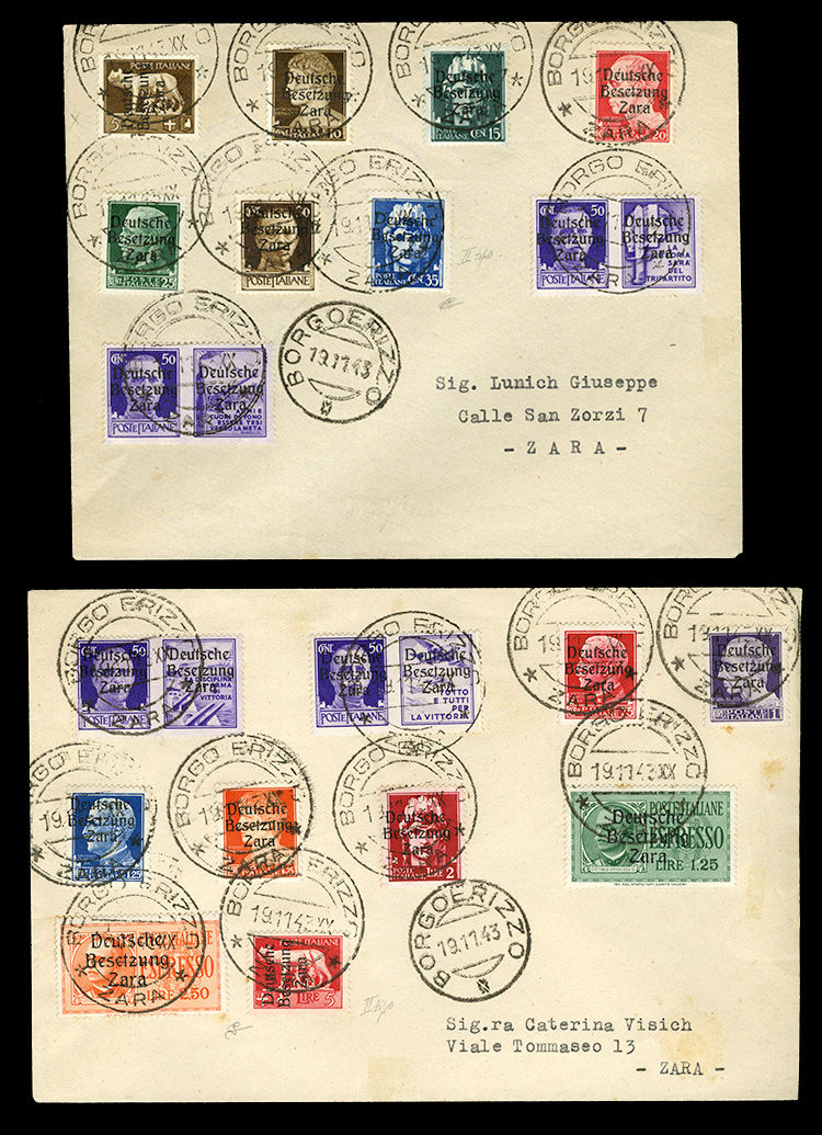 (Mi.1/22) 1943 (19 Nov) two locally addressed covers, franked with 19 different overprints to 5L, also Special Delivery and 50c violet Propaganda Labels (4 different), various types, tied by "Borgo Erizzo" cds, scattered toned spots away