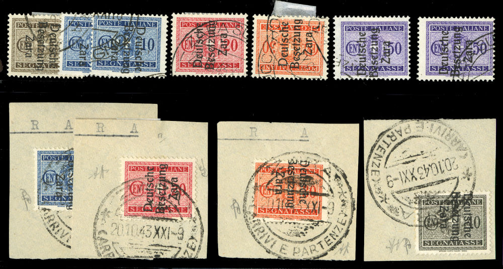 (Mi.P1/7) 1943 selection of 11, with 5c, 10c (3, including one type III), 20c (2), 30c (2), 40c, and 50c (2, including one type III), used, few on piece, all types I or II unless otherwise noted, fine-v.f., few signed, €1,900 (Image)