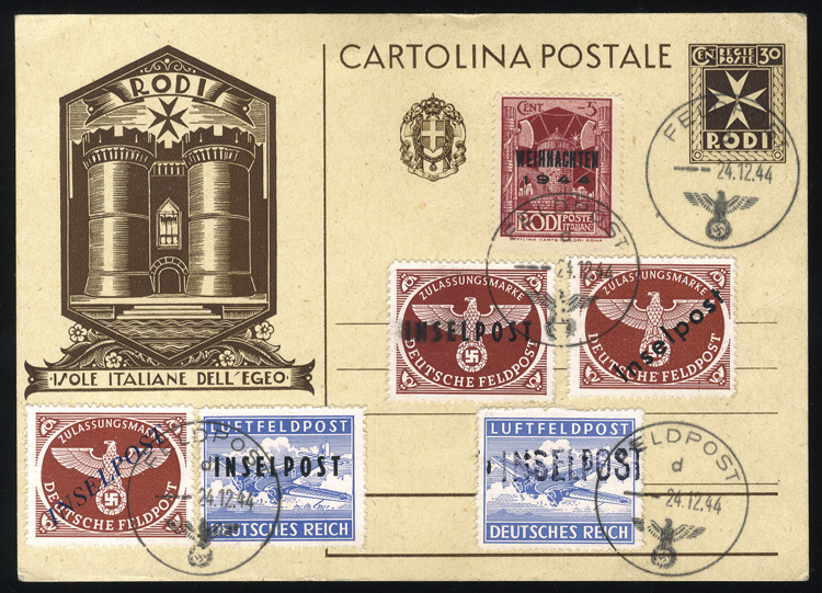 (Mi.6,8B,9,10B,11B,12III) 1944 six different issues on 30c Rhodes postcard, with Vukovar, Rhodes (both issues) plus Weinachten type III, Agram (rouletted) and Leros, all tied by Feldpost 24.12.44 cancels, v.f. and interesting