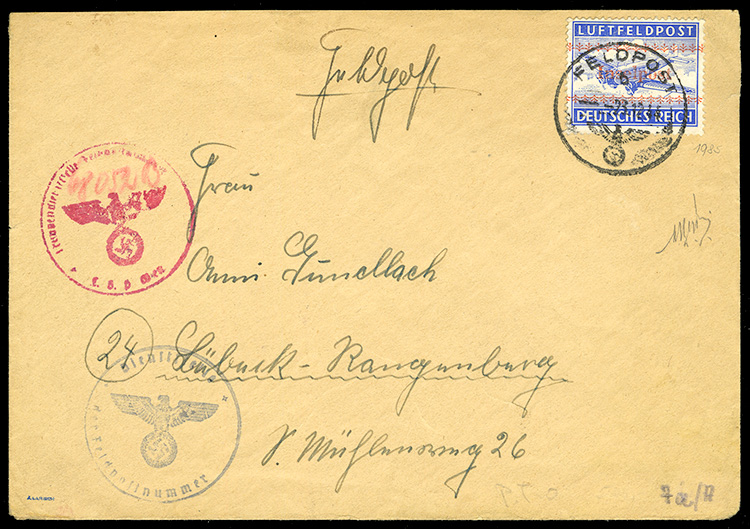 1944 Inselpost, red overprint, tied by Feldpost cds on cover to Germany, red censor hs, fine, cover, signed Bloch, €700 (Image)