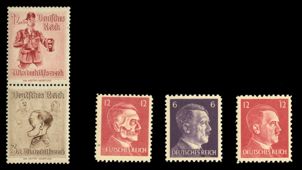 WORLD WAR II OCCUPATION ISSUES British Propaganda Forgeries for Germany (Mi.15-17,30-31) 1944 Streicher and Goring, se-tenant vertical pair, few gum bends, also American Issues 6pf, 12pf and "Futches Reich" Forgeries, n.h., fine-v.f., €1,420 (Image)