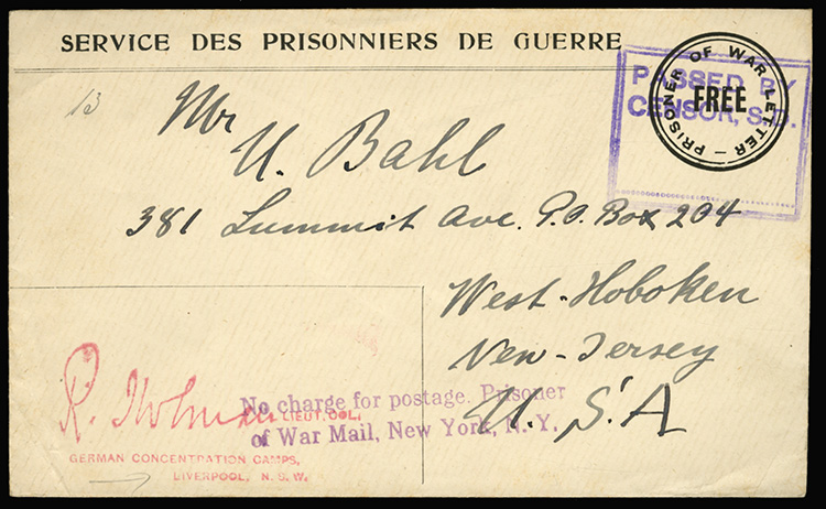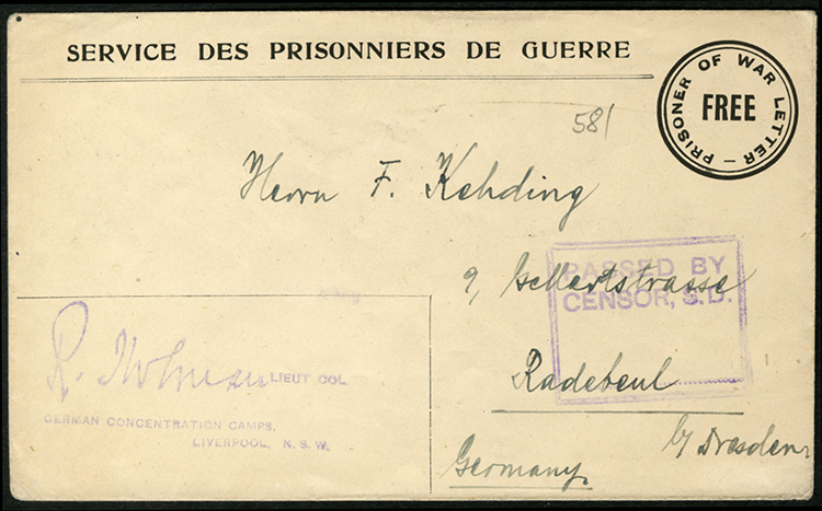 cover with pre-printed "Service des Prisonniers de Guerre" and round "Prisoner of War Letter / Free" alongside, addressed to Germany, with "German Concentration Camps, Liverpool, N.S.W." and censor''s signature, also boxed "Passed by Censor, S.D." (Image)