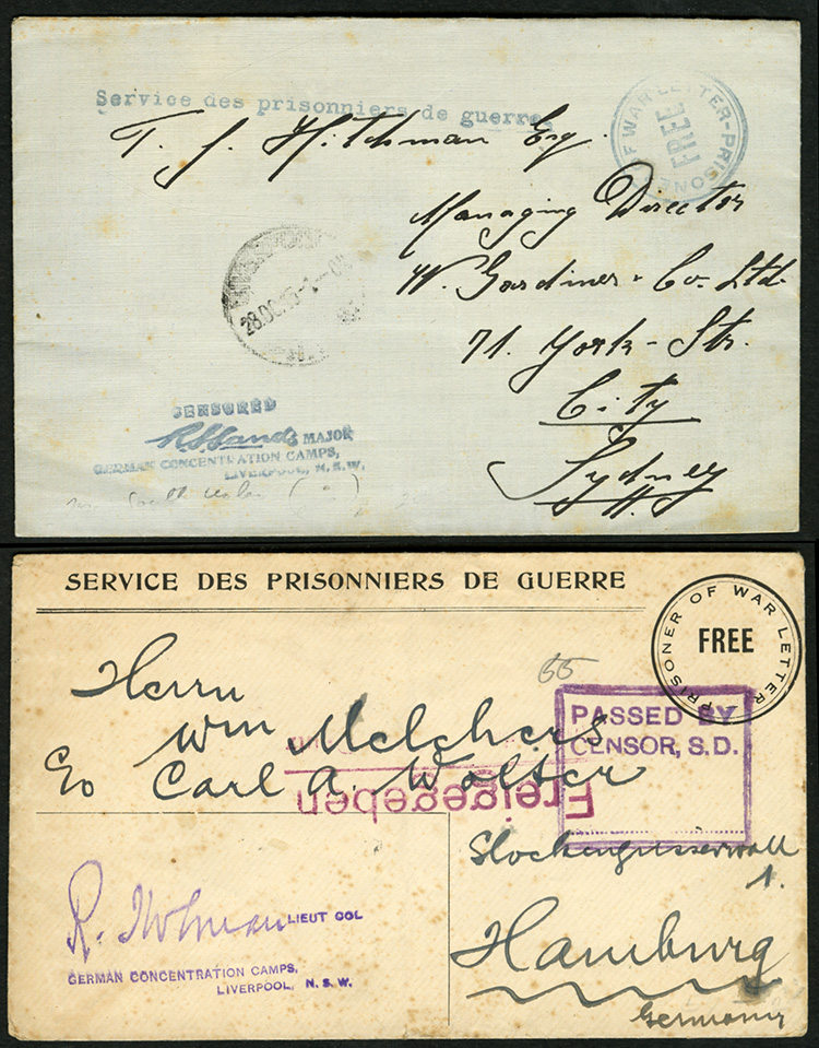 free-frank "Service des Prisonniers de Guerre" cover to New York, with censor handstamp "German Concentration Camps, Liverpool, N.S.W. Censored" signature of a Major, Sydney 28 Oct 1915 departure pmk; also another cover to Germany, boxed "Passed by