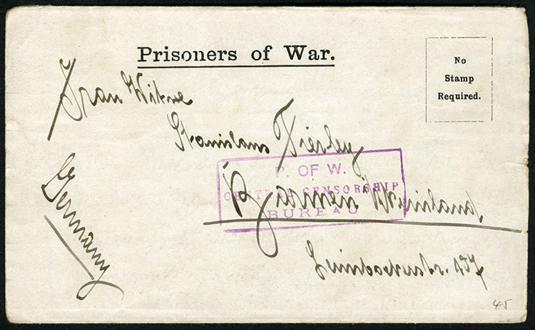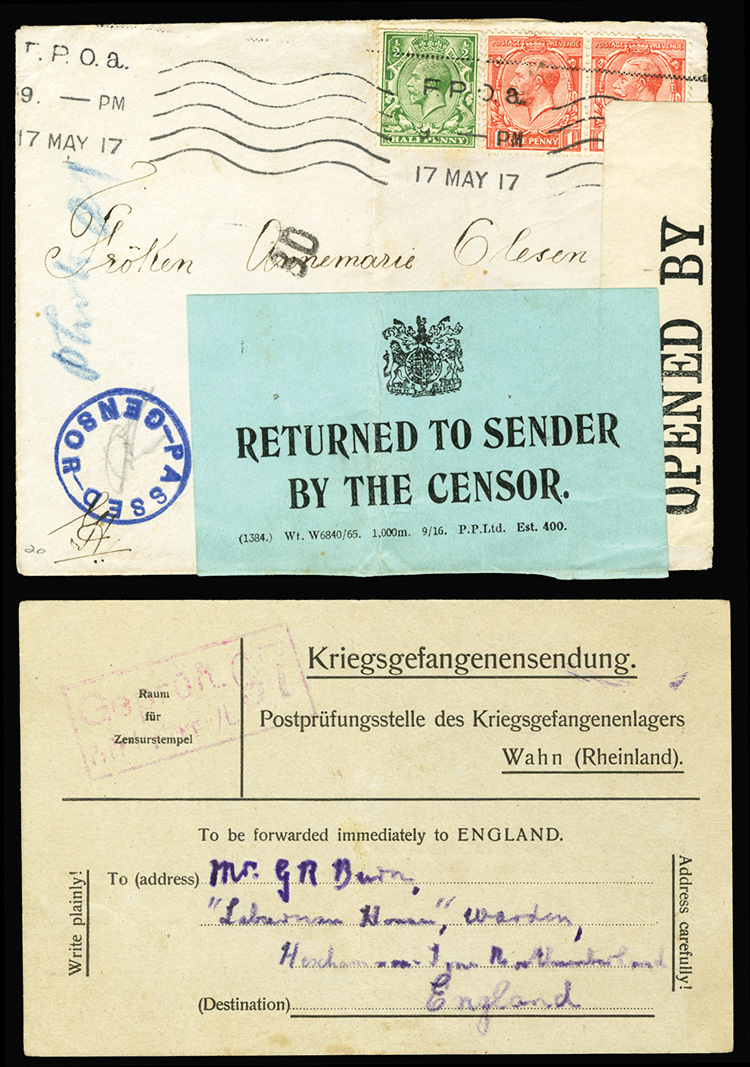Dec) Prisoner of War card showing return address in Wahn (Rhineland), addressed to England, with framed censor cachet, also a letter from Geo Burns, dated 25 Jan 1919 "this p.c. is what are called Fake card because it is false address to cause people