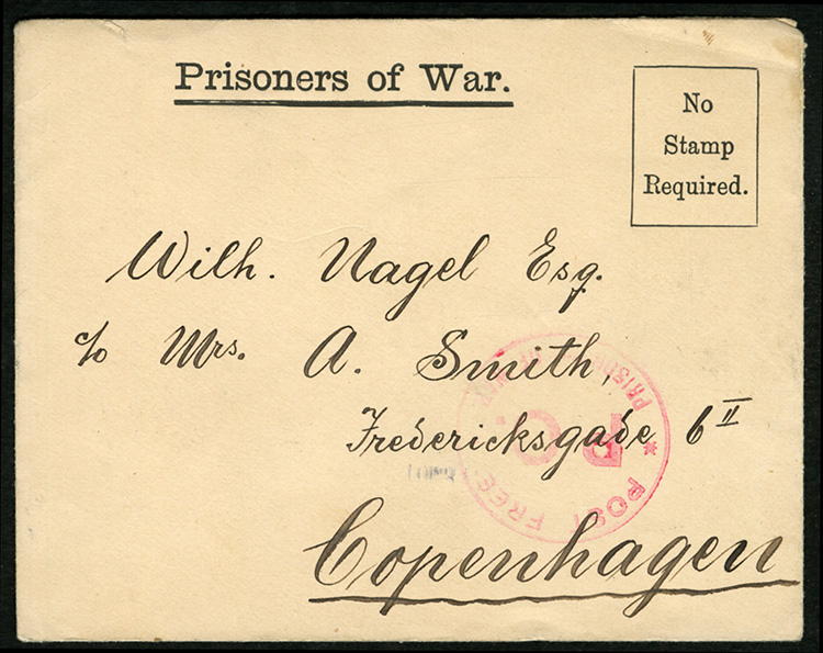 Prisoner of War free frank cover addressed to Copenhagen, with "Post Free P.C." in red, sent from a POW at "H.M.T. Ascania" off Isle of Wight, with Copenhagen arrival pmk, fine (Image)