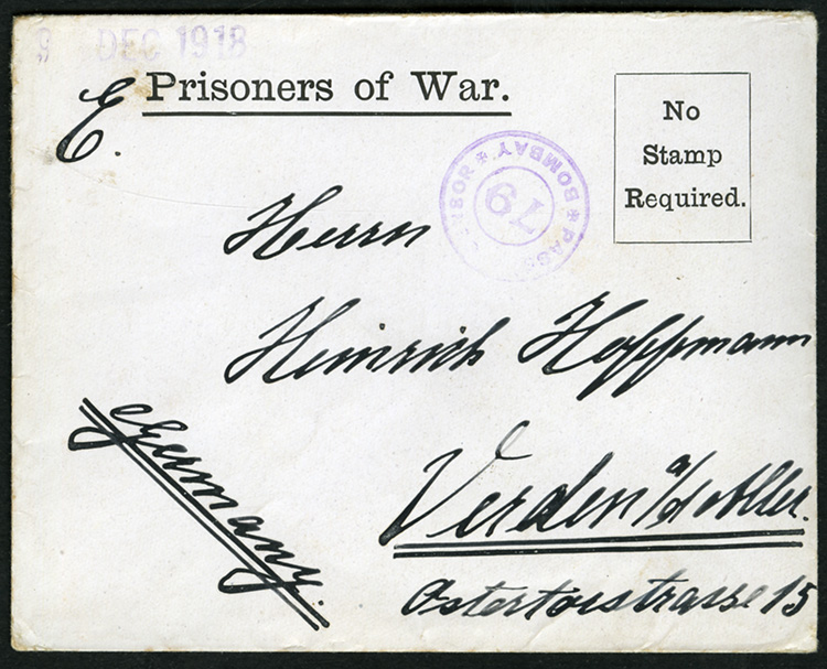 single correspondence from Ahmednagar Camp in India, 16 covers with pre-printed "Prisoner of War No Stamp Required", sent by a POW Heinrich Hoffmann to Germany, different departure dates, "Passed Censor Bombay" and other censor markings, fine (Image)