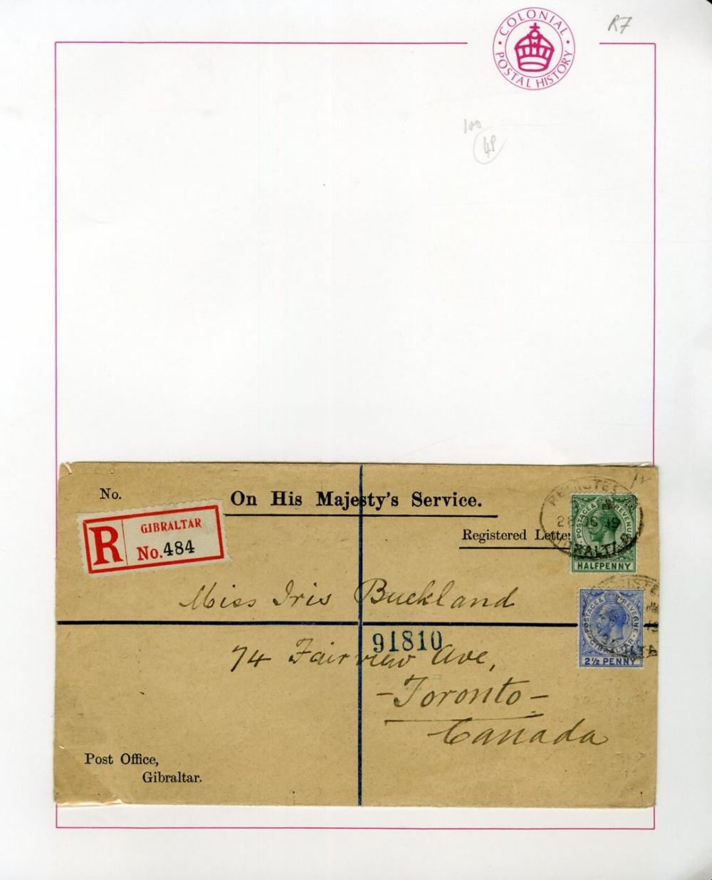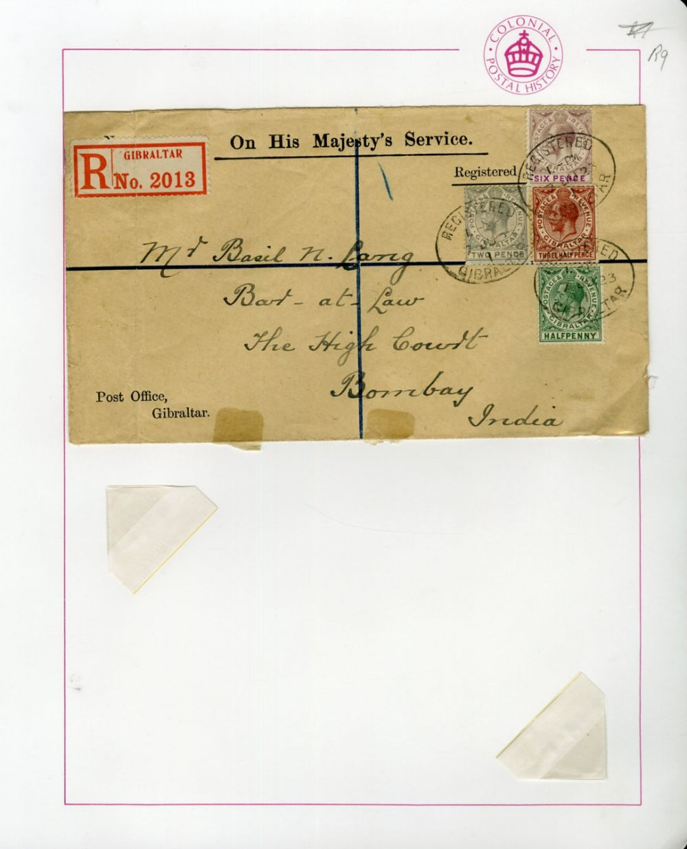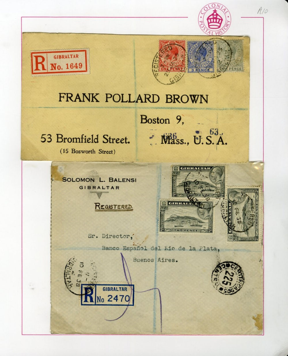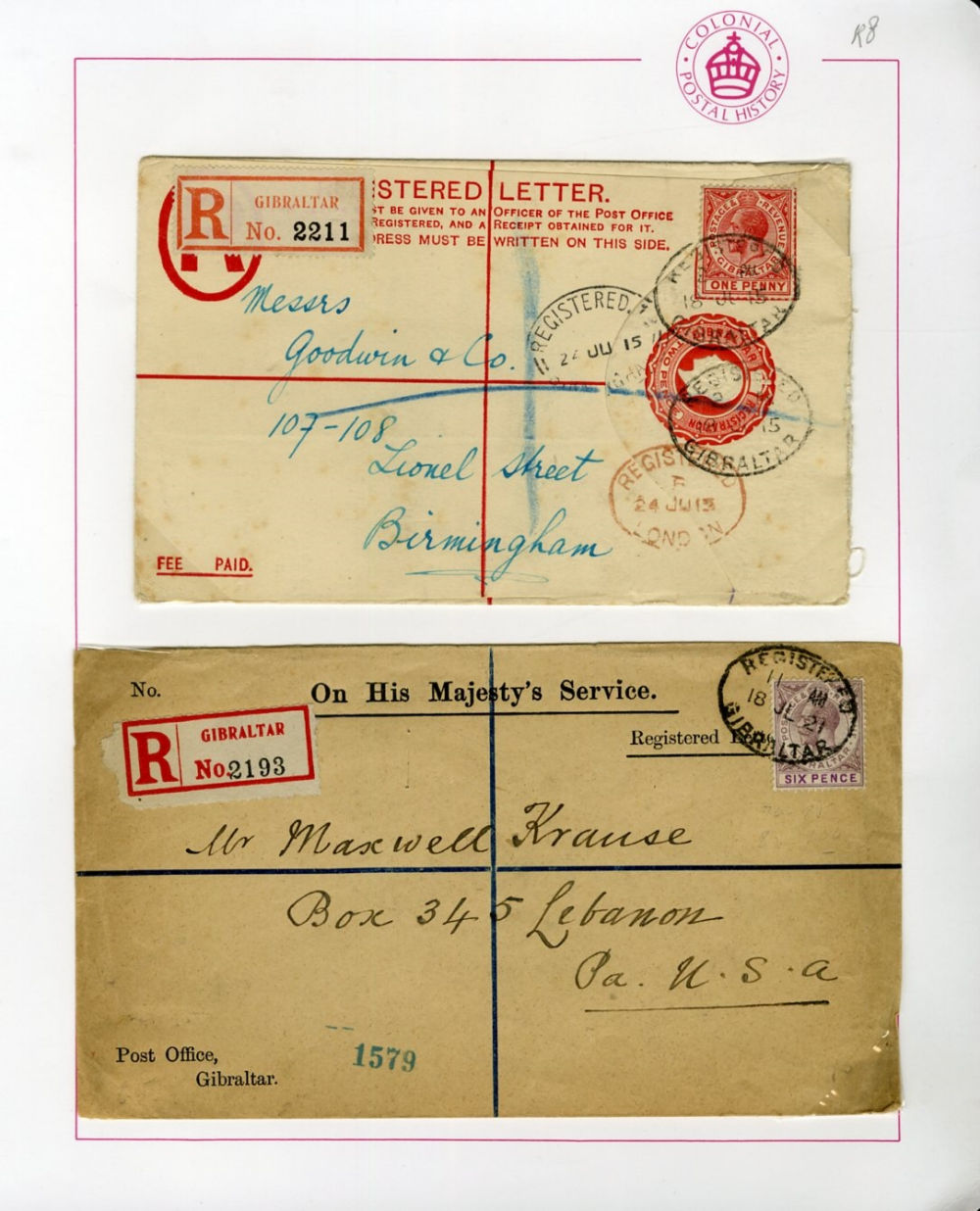 1122 c   imageGIBRALTAR 1915-21 selection of six registered covers to England, USA, India, Argentina and Canada, various George V frankings, mostly fine or better (Image) (Image 2) (Image 3) (Image 4) (All Images)