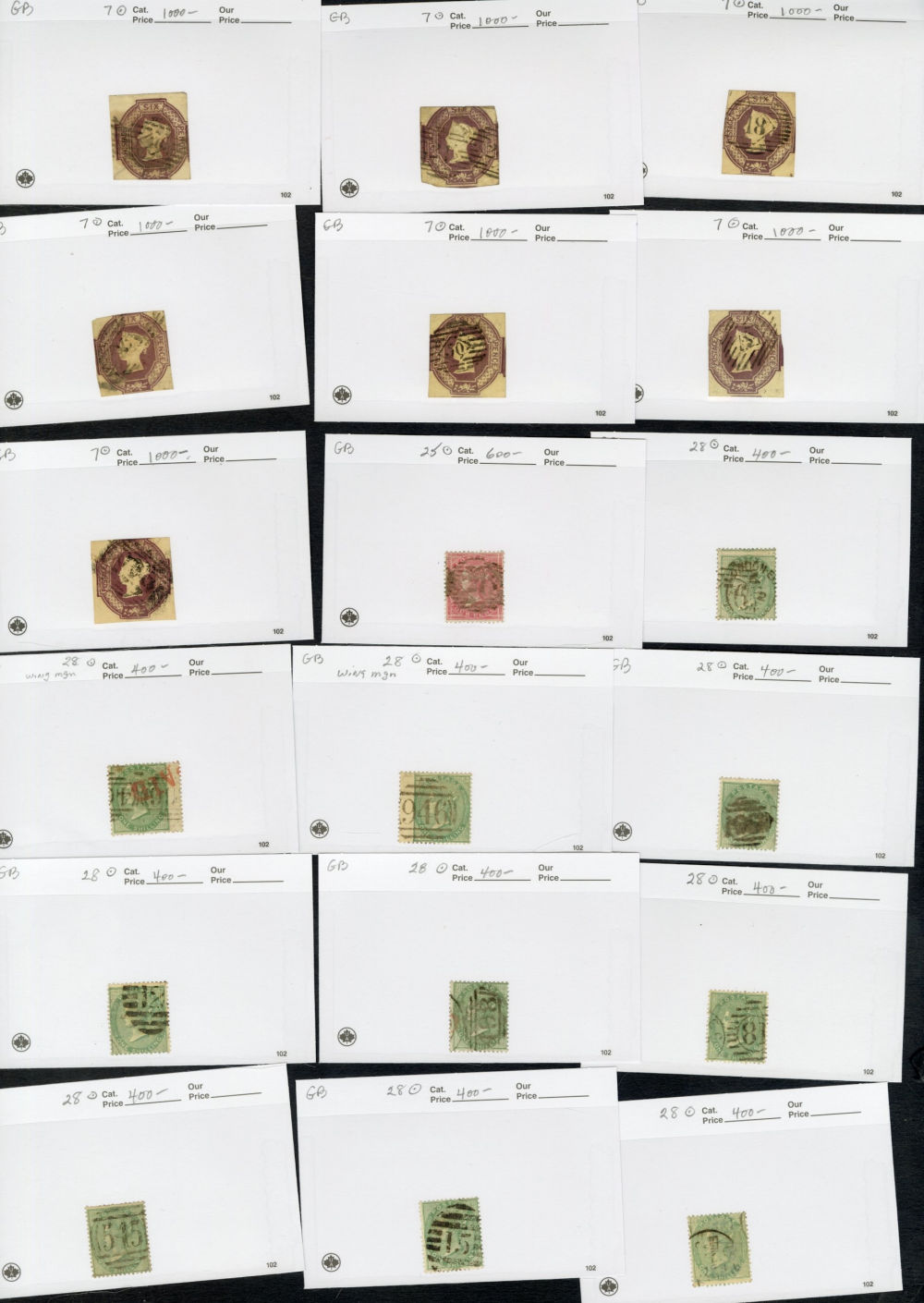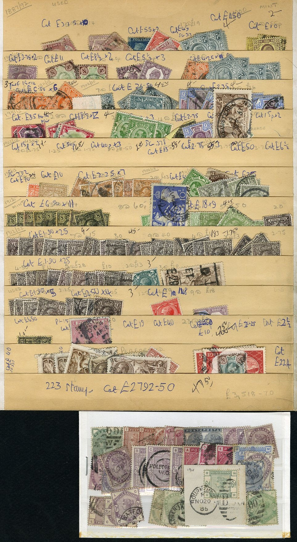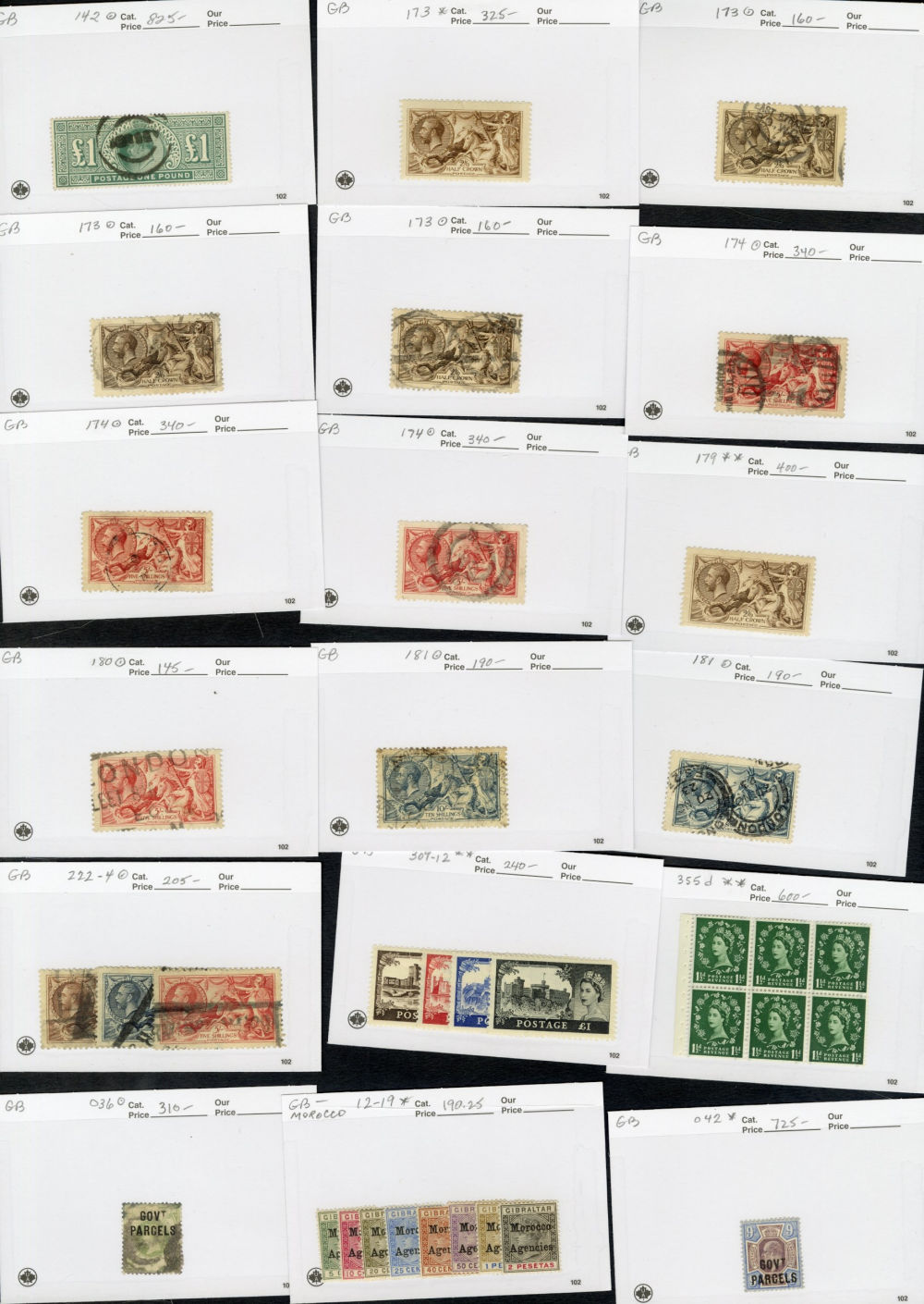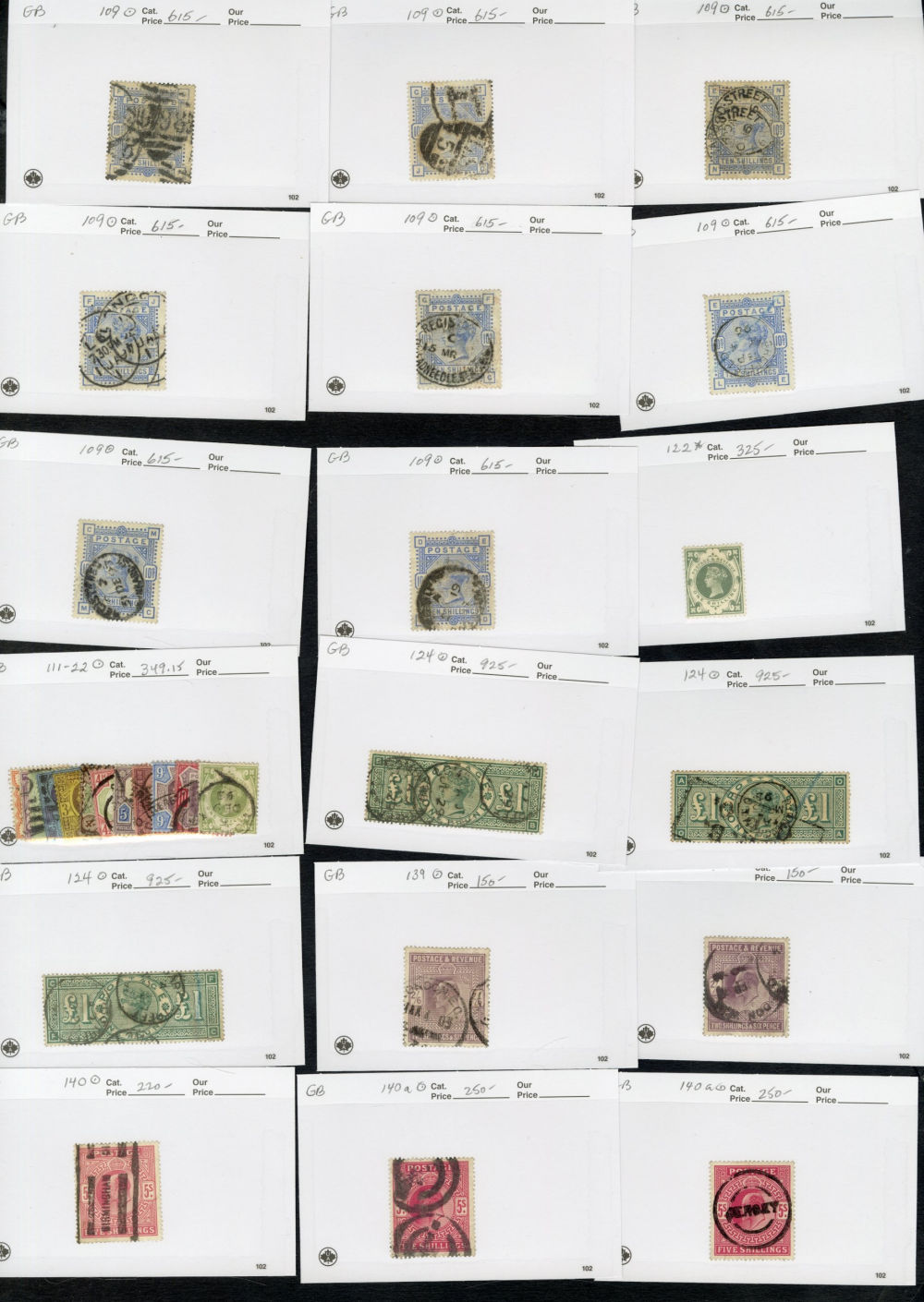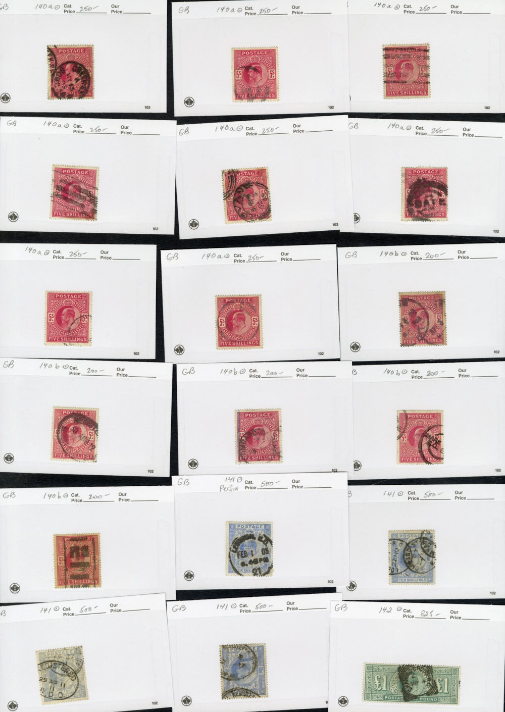1123 O   imageGREAT BRITAIN 1840-1920 accumulation of mostly used high values, neatly displayed on dealer's cards, some Penny Blacks, Square Embossed values, Queen Victoria to 10sh, KEVII to £1, some Seahorses, occasional unused items, moderate quantities, condition varies, faults to be expected, cat. $115,000+ (Image) (Image 2) (Image 3) (Image 4) (Image 5) (Image 6) (Image 7) (Image 8) (Image 9) (All Images)