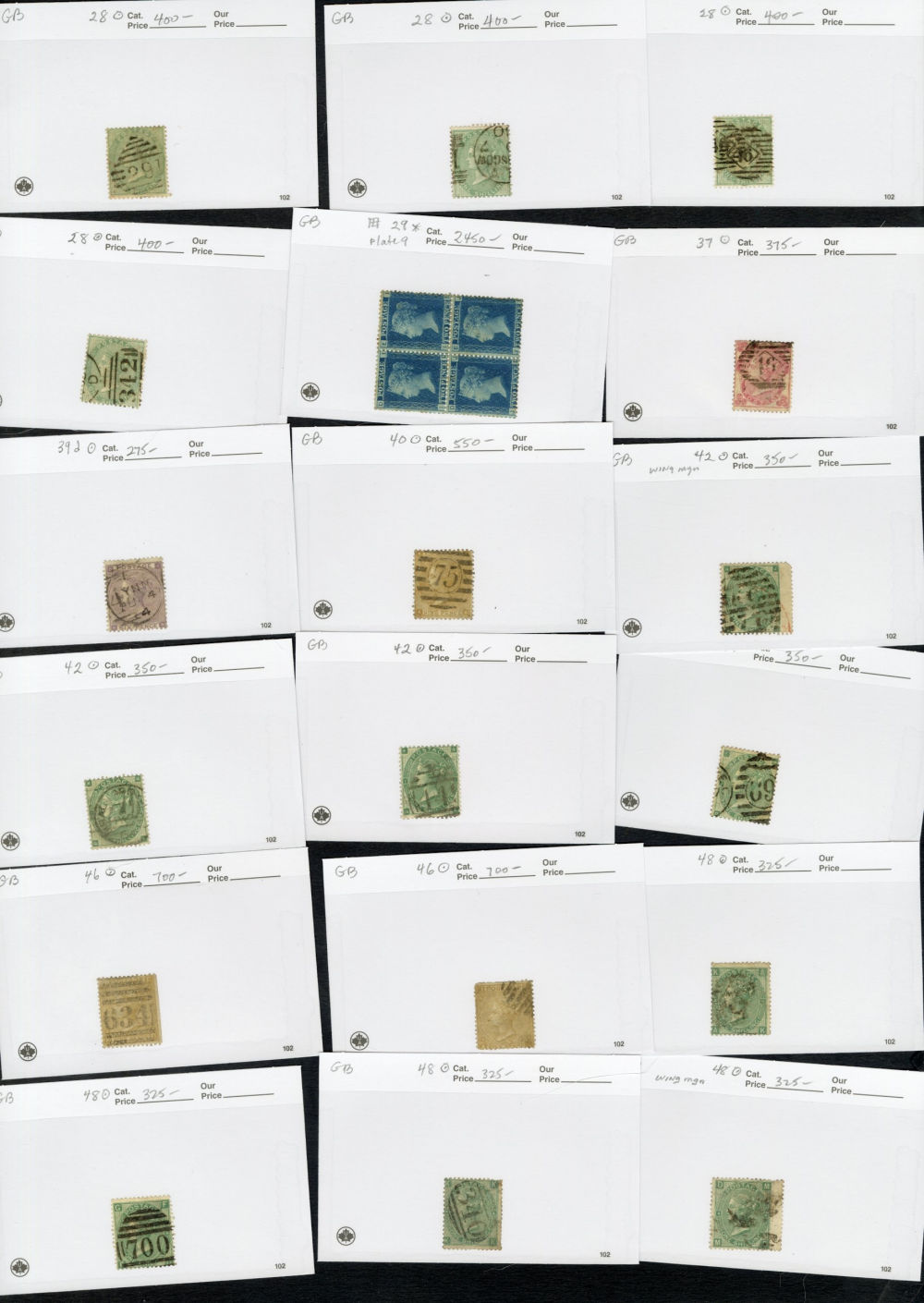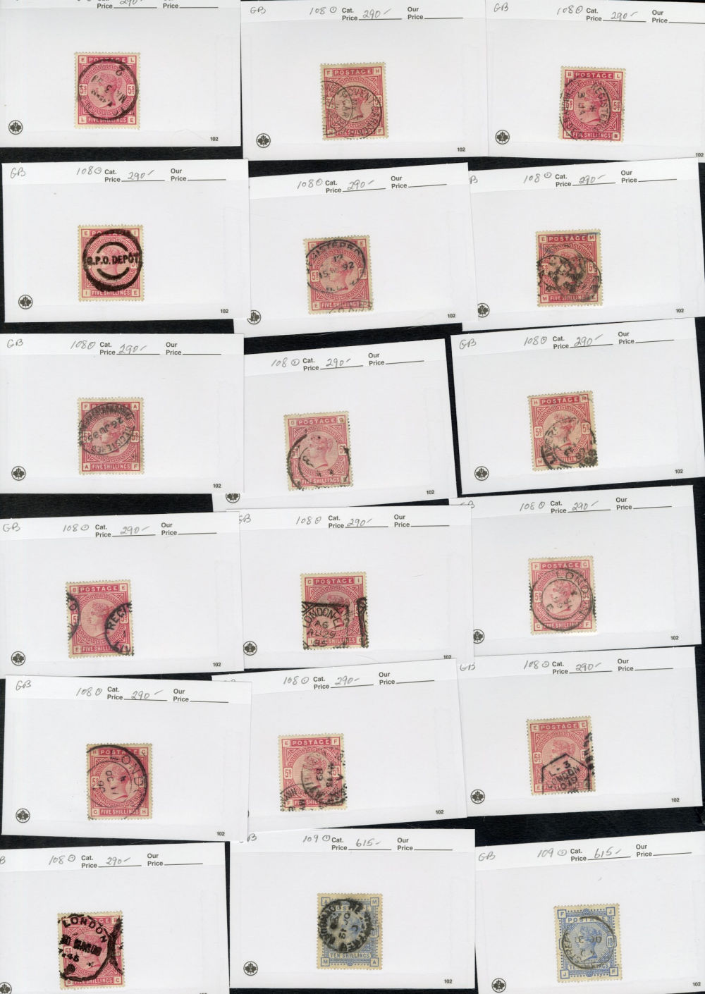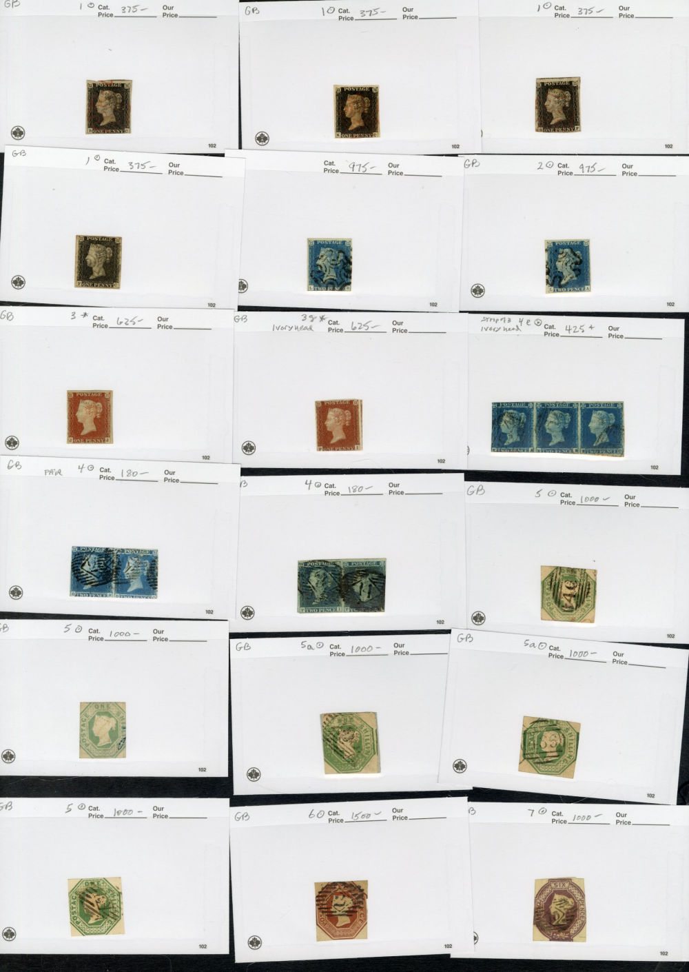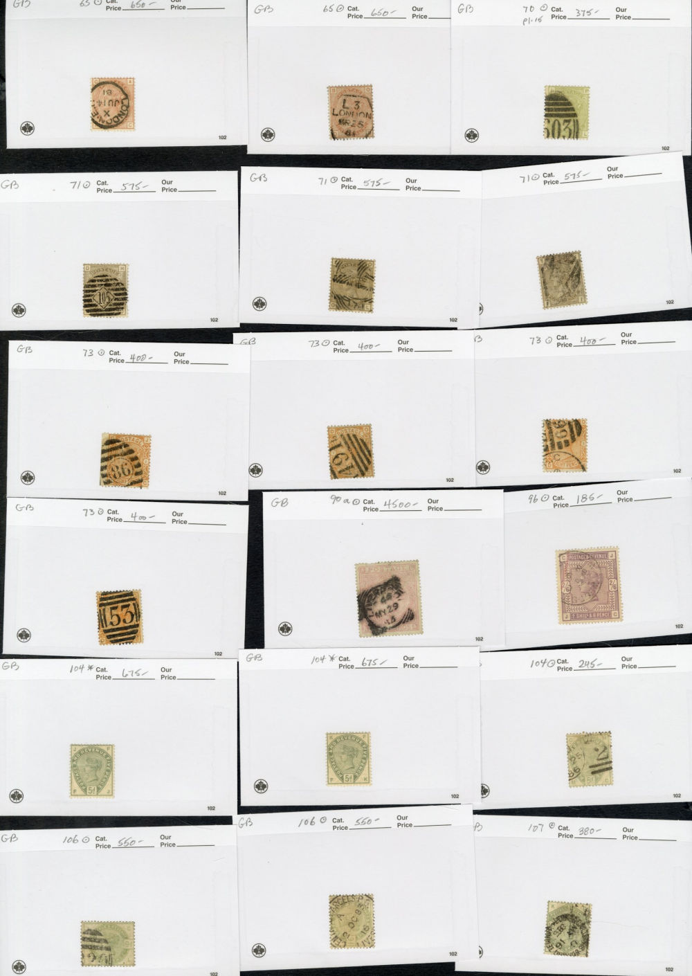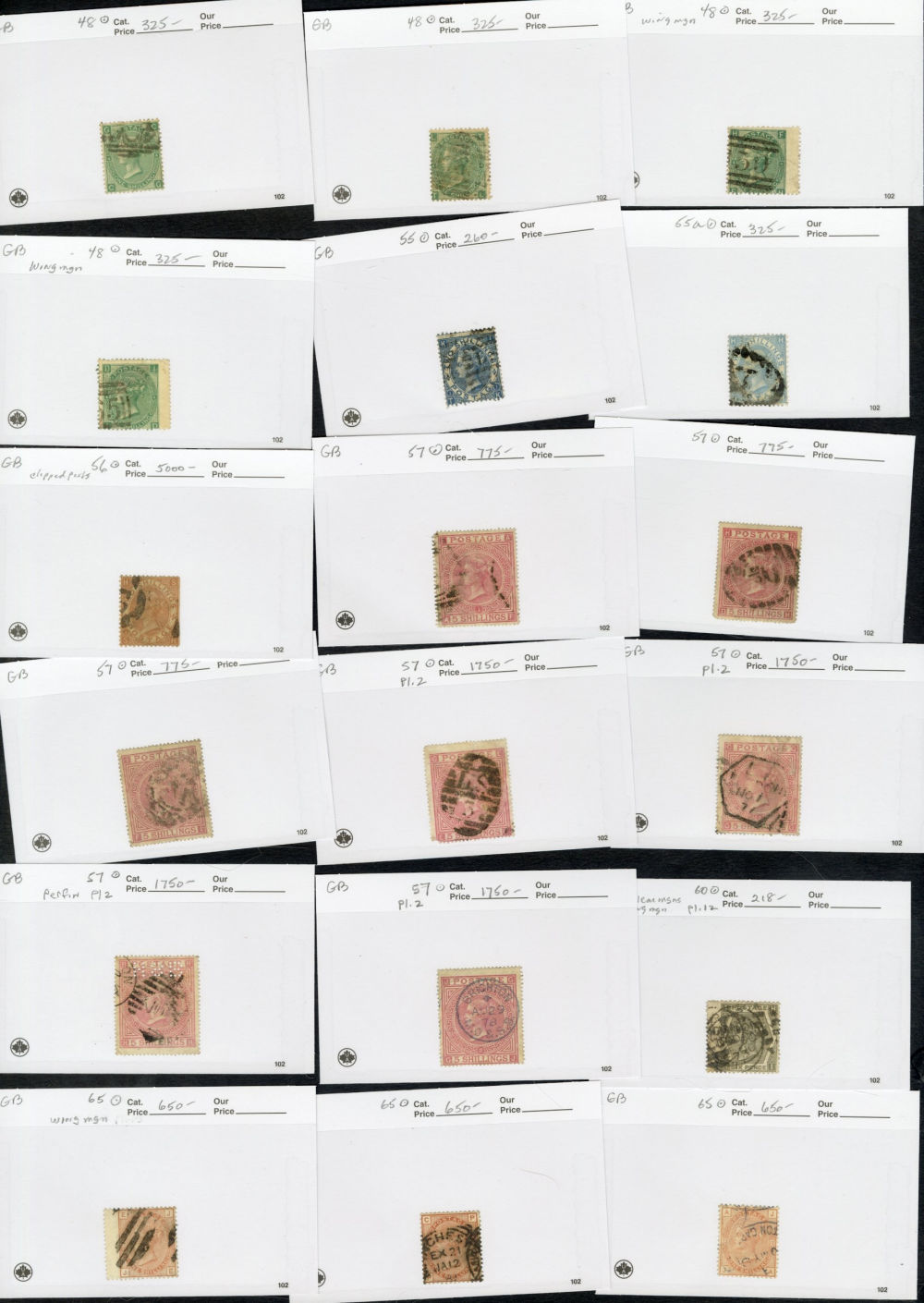 1123 O   imageGREAT BRITAIN 1840-1920 accumulation of mostly used high values, neatly displayed on dealer's cards, some Penny Blacks, Square Embossed values, Queen Victoria to 10sh, KEVII to £1, some Seahorses, occasional unused items, moderate quantities, condition varies, faults to be expected, cat. $115,000+ (Image) (Image 2) (Image 3) (Image 4) (Image 5) (Image 6) (Image 7) (Image 8) (Image 9) (All Images)