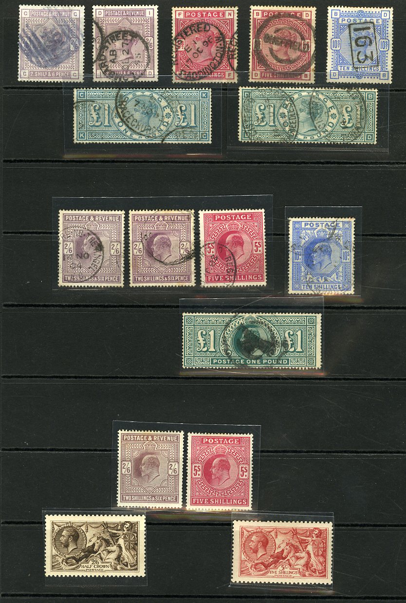 1125 O, og   imageGREAT BRITAIN 1883-1913 selection of high values with Queen Victoria 1883-84 2s6d (2, one blue paper), 5s (both shades) and 10s, £1 green (2), 1902-11 KEVII 2sh6p (2), 5sh, 10sh and £1, all used, plus unused 2sh6p and 5sh, 1913 George V Seahorses, Waterlow 2s6d deep sepia brown and 5s rose carmine unused, mixed condition, mostly fine or better (Image)