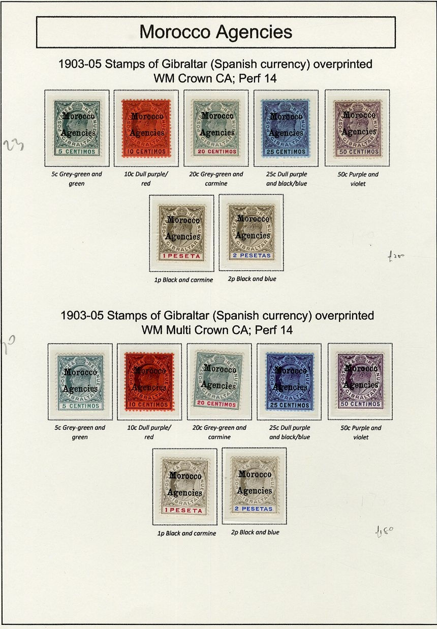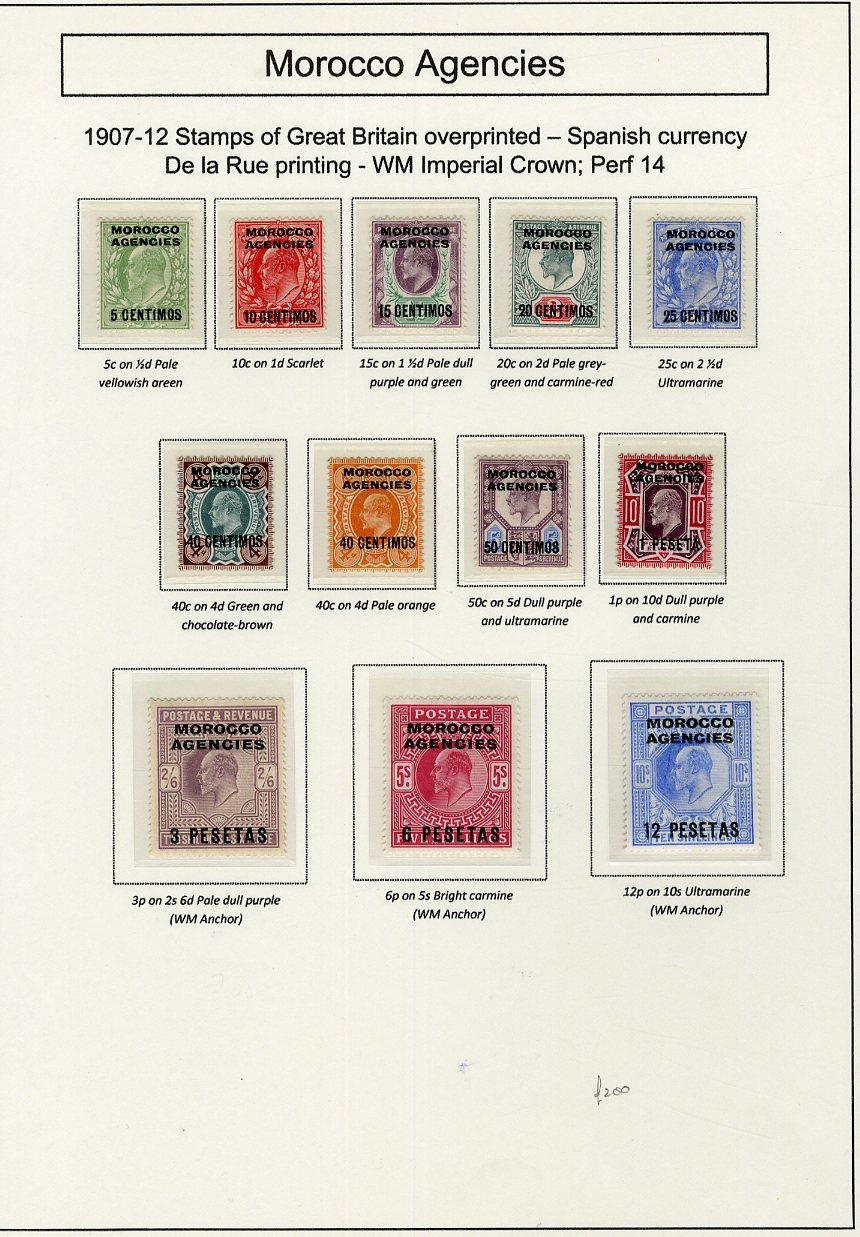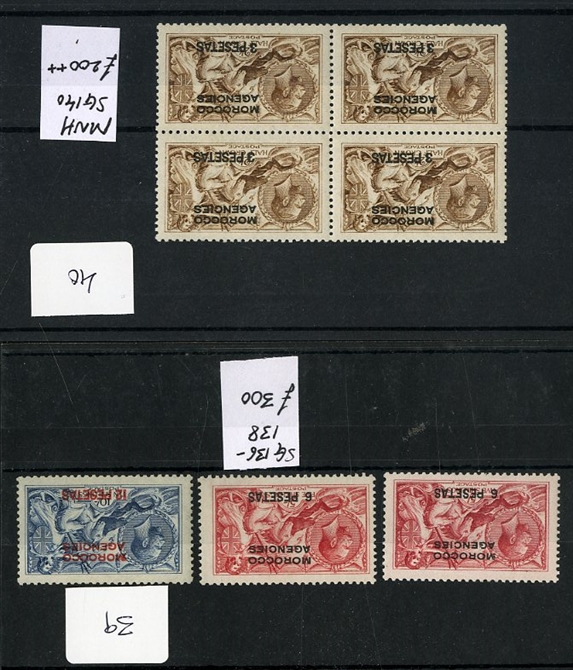 1128 og   imageGREAT BRITAIN - Morocco Agencies 1903-12 selection with 1903-05 both KEVII sets to 2p, Spanish currency 1907-12 issue to 12p on 10sh, and the overprinted Seahorses 5sh (2) and 10sh, as well as a block of four 3p on 2s6d, fine-v.f. (SG £1,080) (Image) (Image 2) (Image 3) (All Images)
