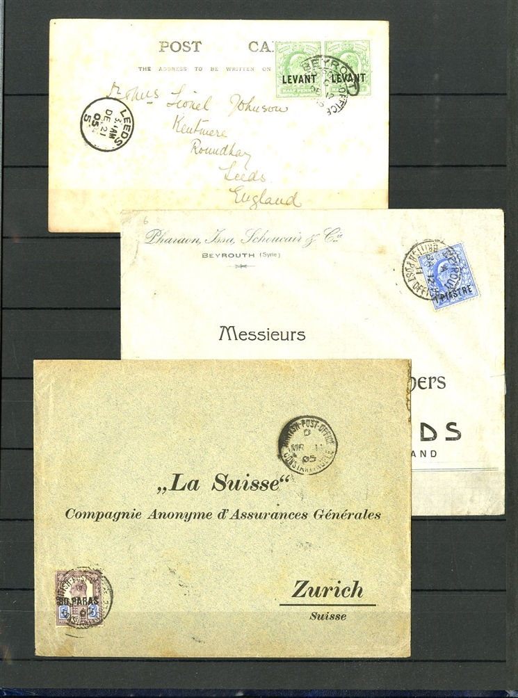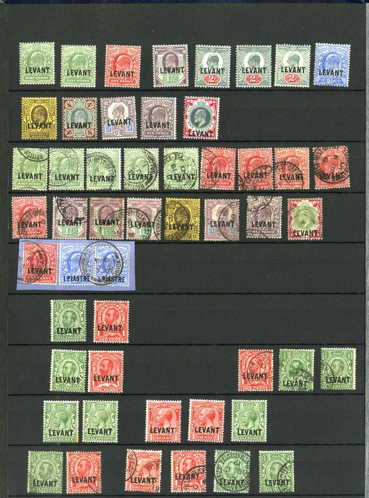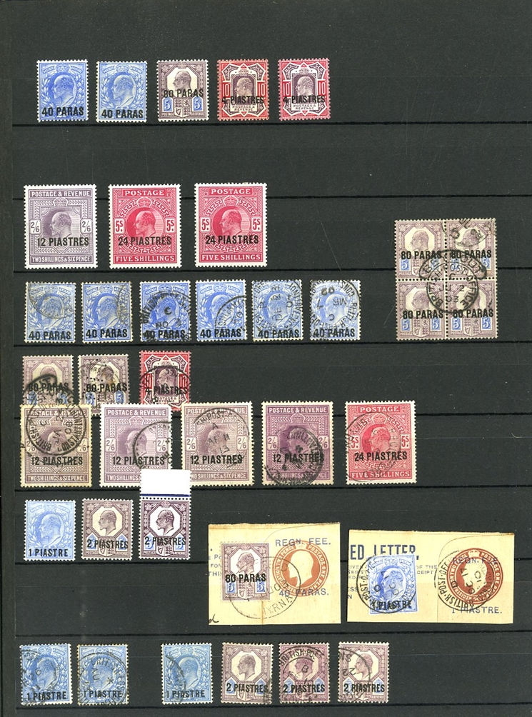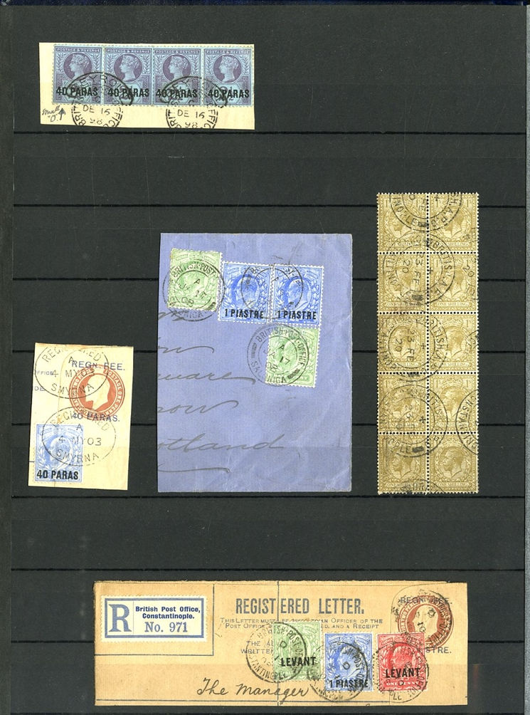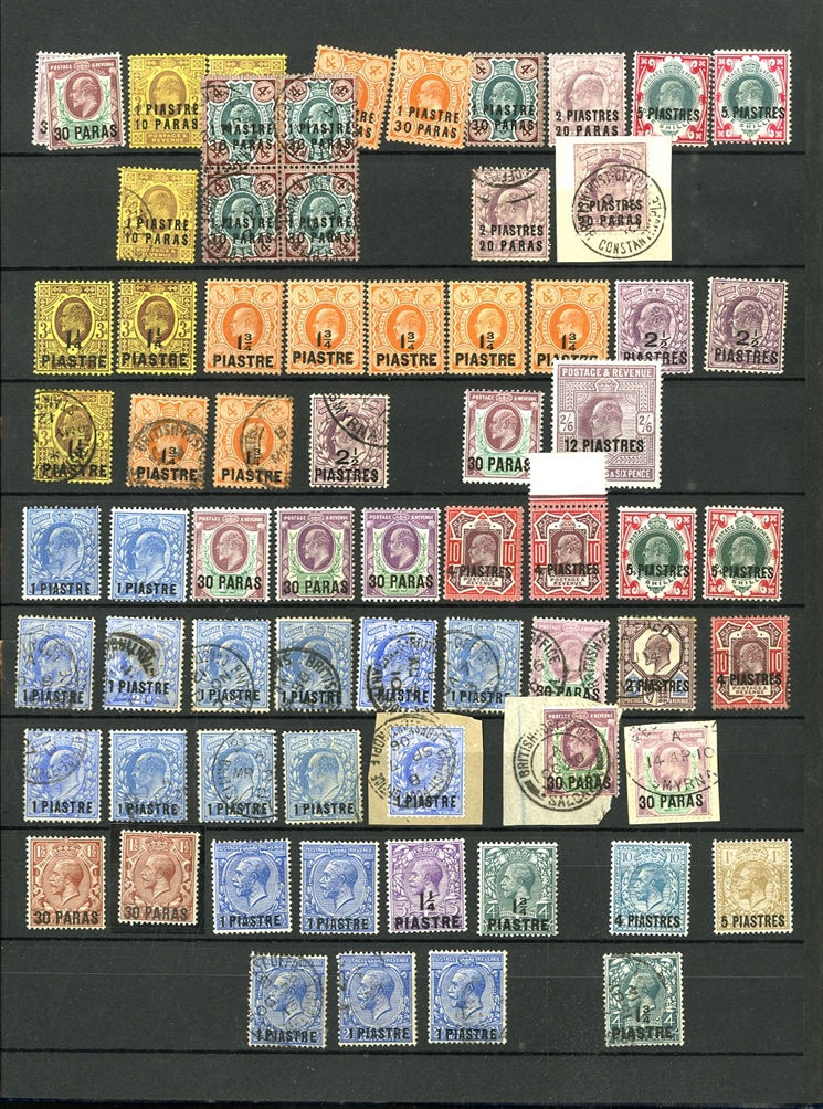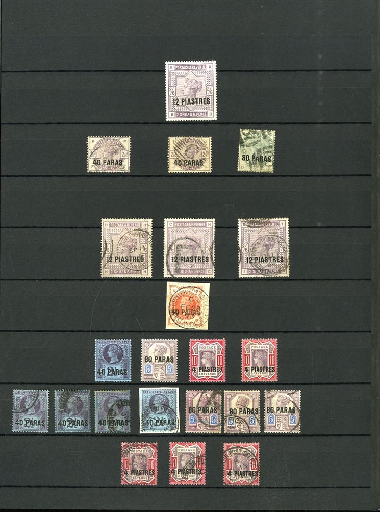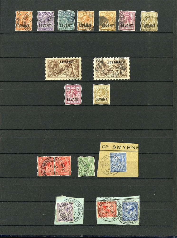1129 O, c   imageGREAT BRITAIN - British Levant 1867-1921 collection in stock book, range of GB stamps used in Levant, noted 1867 10d with "G06" of Beyrouth, 1867 5sh (plates 1 and 2) and 9 values with 8d and 10d canceled with the "C" obliterator, 1875 letter to England franked 4d with "‘C" pmk, 1885 12p on 2s6d (unused and 3 used), 1893 40para on 1/2d used on piece, 1902-05 set to 24pi on 5sh (2) unused and used with 4x2sh6p, 1905-08 2pi on 5d (2), 1911-13 set to 12pi on 2sh6d unused, a good range of the 1905-21 Levant opts to 1sh unused, 921 Seahorses to 90pi unused and 180pi used. In addition, there are 17 covers and cards predominantly KEVII, few George V, with one uprated stationery registered envelope, attractive variety of frankings, variety of destinations including Malta, Hungary and Switzerland (Image) (Image 2) (Image 3) (Image 4) (Image 5) (Image 6) (Image 7) (Image 8) (Image 9) (Image 10) (Image 11) (Image 12) (Image 13) (Image 14) (Image 15) (Image 16) (All Images)