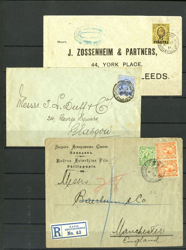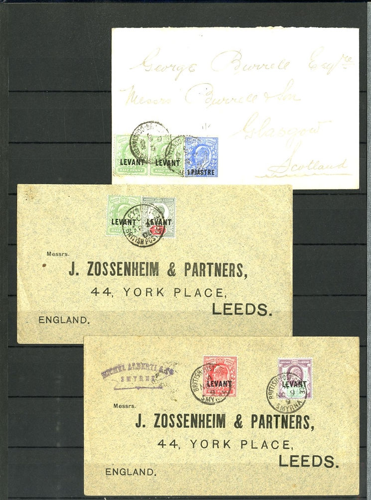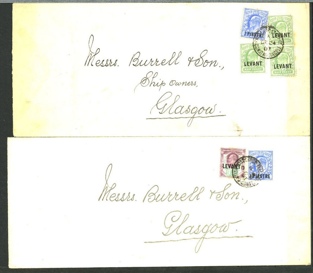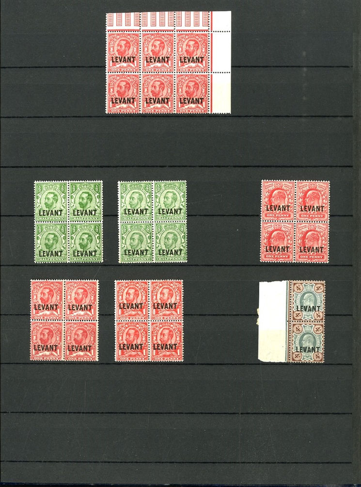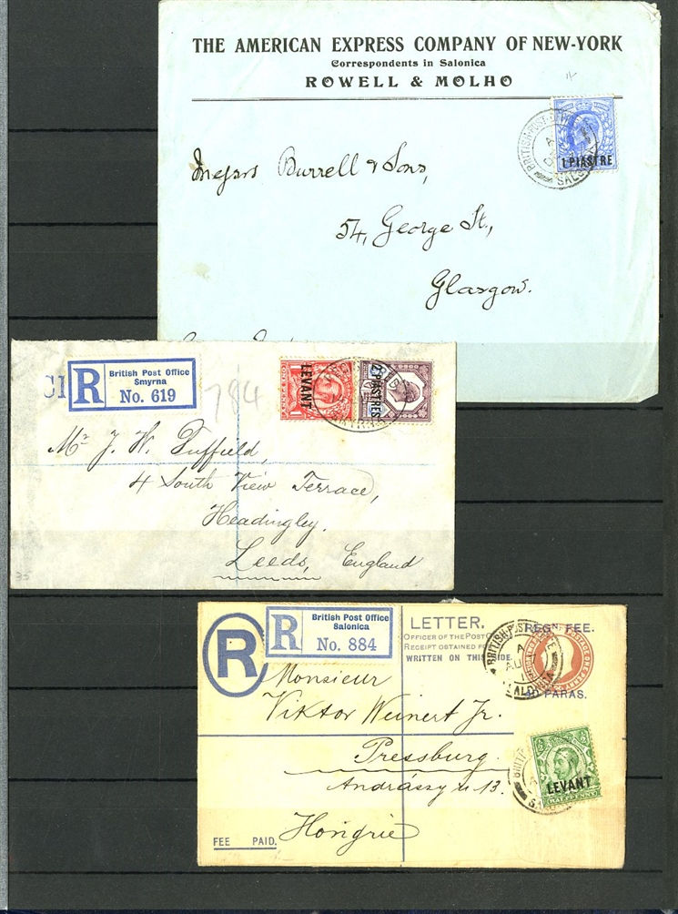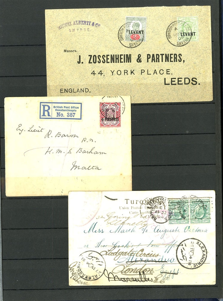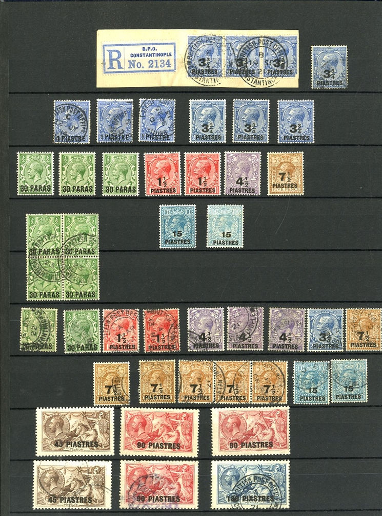 1129 O, c   imageGREAT BRITAIN - British Levant 1867-1921 collection in stock book, range of GB stamps used in Levant, noted 1867 10d with "G06" of Beyrouth, 1867 5sh (plates 1 and 2) and 9 values with 8d and 10d canceled with the "C" obliterator, 1875 letter to England franked 4d with "‘C" pmk, 1885 12p on 2s6d (unused and 3 used), 1893 40para on 1/2d used on piece, 1902-05 set to 24pi on 5sh (2) unused and used with 4x2sh6p, 1905-08 2pi on 5d (2), 1911-13 set to 12pi on 2sh6d unused, a good range of the 1905-21 Levant opts to 1sh unused, 921 Seahorses to 90pi unused and 180pi used. In addition, there are 17 covers and cards predominantly KEVII, few George V, with one uprated stationery registered envelope, attractive variety of frankings, variety of destinations including Malta, Hungary and Switzerland (Image) (Image 2) (Image 3) (Image 4) (Image 5) (Image 6) (Image 7) (Image 8) (Image 9) (Image 10) (Image 11) (Image 12) (Image 13) (Image 14) (Image 15) (Image 16) (All Images)