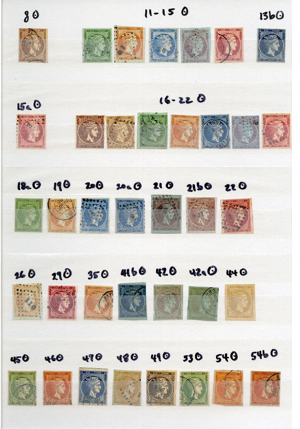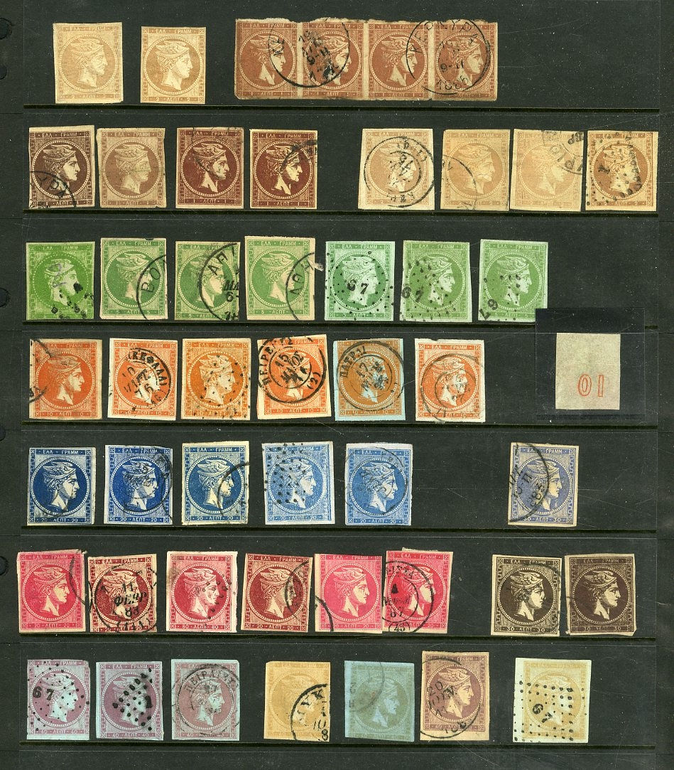 1130 O, og   imageGREECE 1861-1900 unsorted selection of mostly used Hermes Heads on stock cards, also some later items, various shades, 1L horizontal strip of four, also "01" numeral on reverse variety, etc. (Image) (Image 2) (All Images)