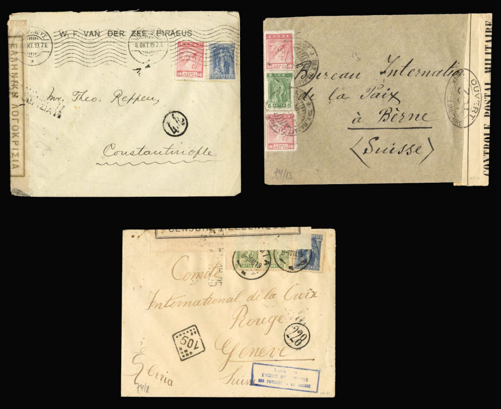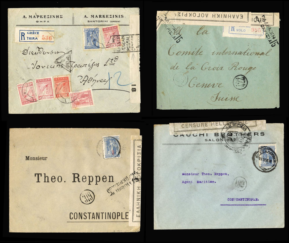 1133 c   imageGREECE 1915-19 censored mail, selection of seven covers to Geneva, Constantinople, one from Santorini to Athens, etc., various censor labels and markings, fine group (Image) (Image 2) (All Images)