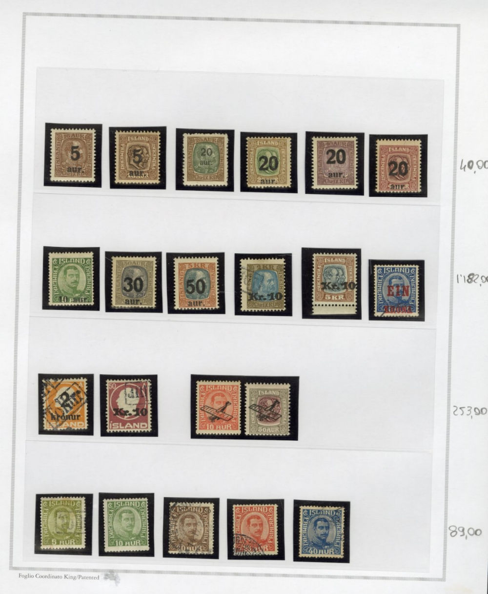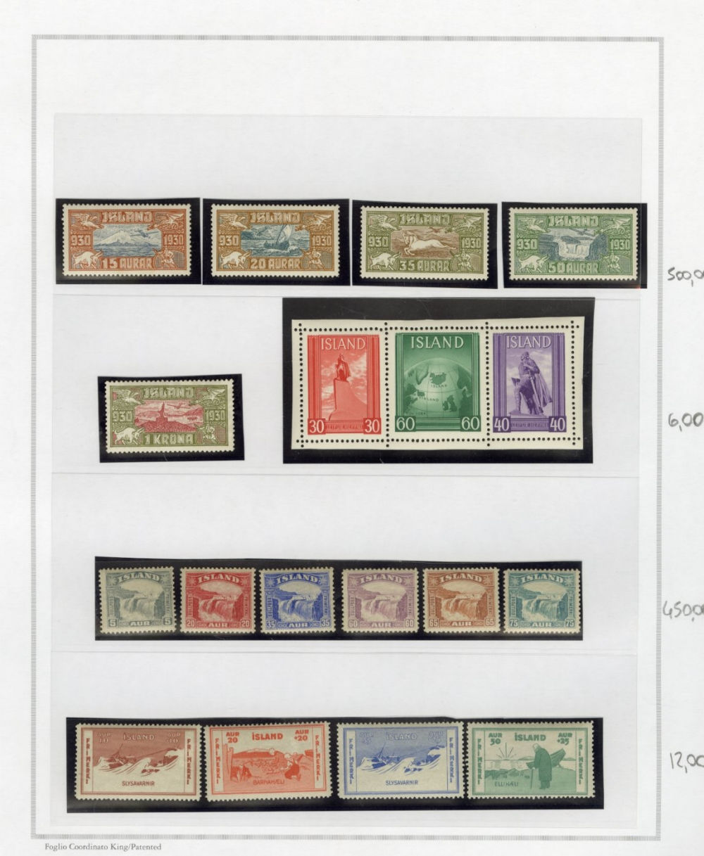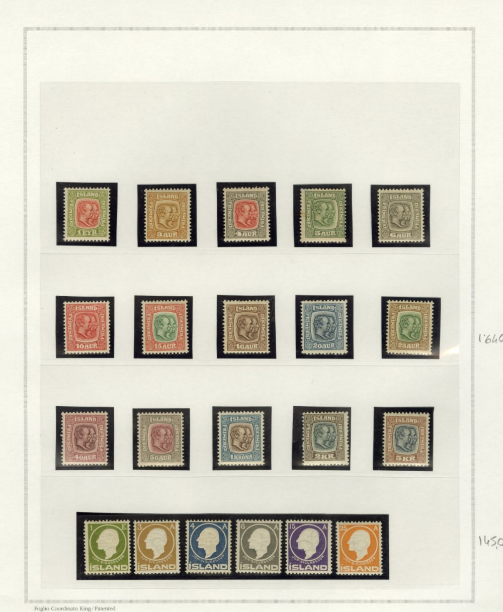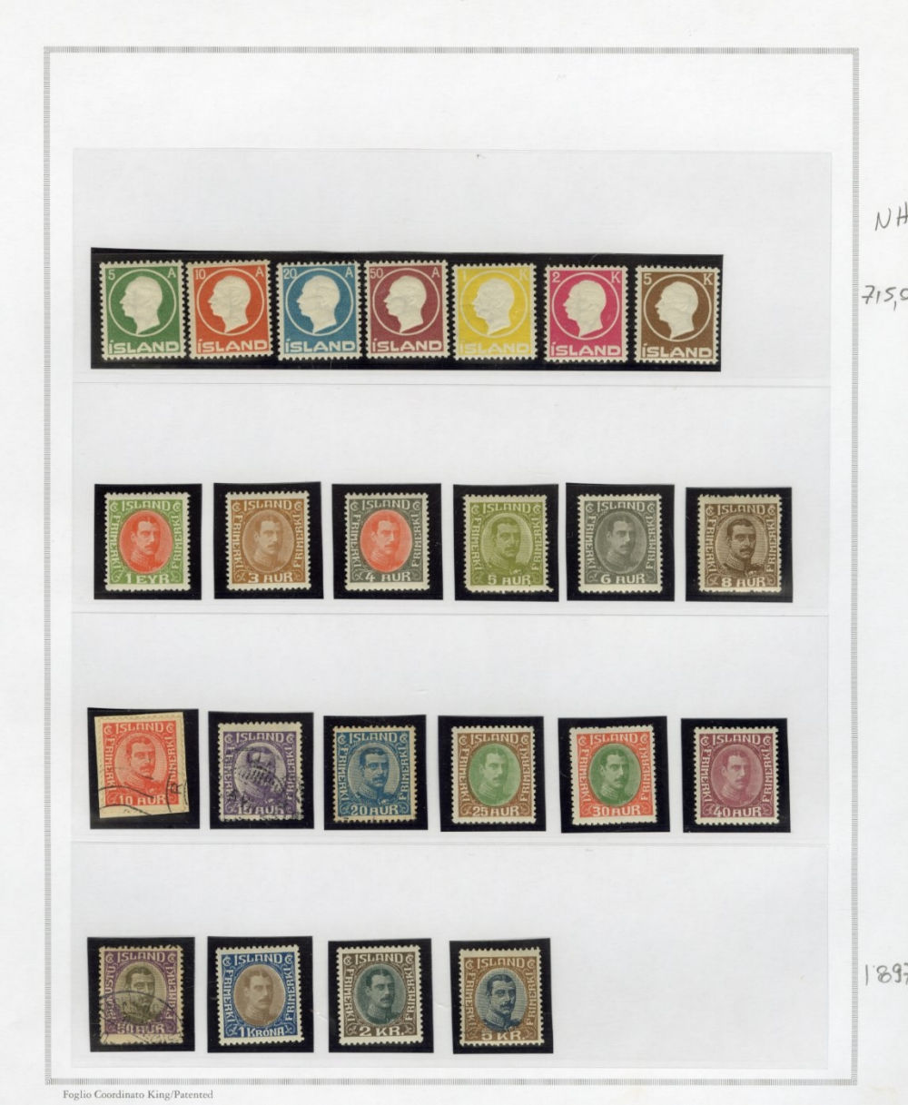 1137 O, og   imageICELAND 1873-2015 two-volume collection on pages, used and unused singles and sets, good showing of 19th Century, mixed condition, mostly complete from 1907, generally n.h. (when unused), including 1907-12 issues (71-98), 1920-22 Christian X, many better singles, surcharges, Landing the mail set of five, Parliament set complete, also Officials (152-66,O53-57) all n.h., Air Post (missing Hopflug Itala), modern issues with booklet panes, etc., also back-of-book, souvenir sheets and more. A nice collection of Iceland, high catalogue value (Image) (Image 2) (Image 3) (Image 4) (Image 5) (Image 6) (Image 7) (Image 8) (Image 9) (Image 10) (Image 11) (Image 12) (Image 13) (Image 14) (Image 15) (Image 16) (Image 17) (All Images)