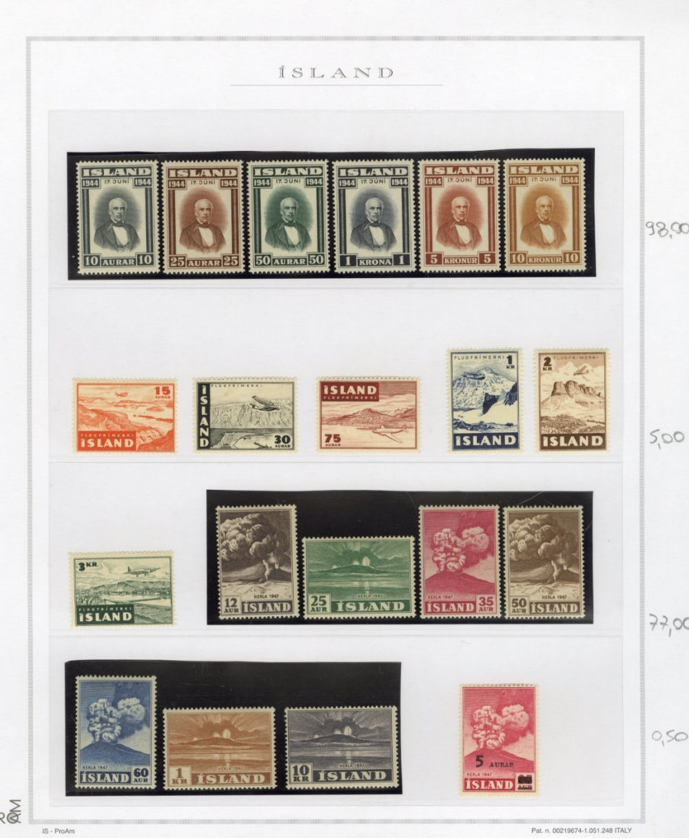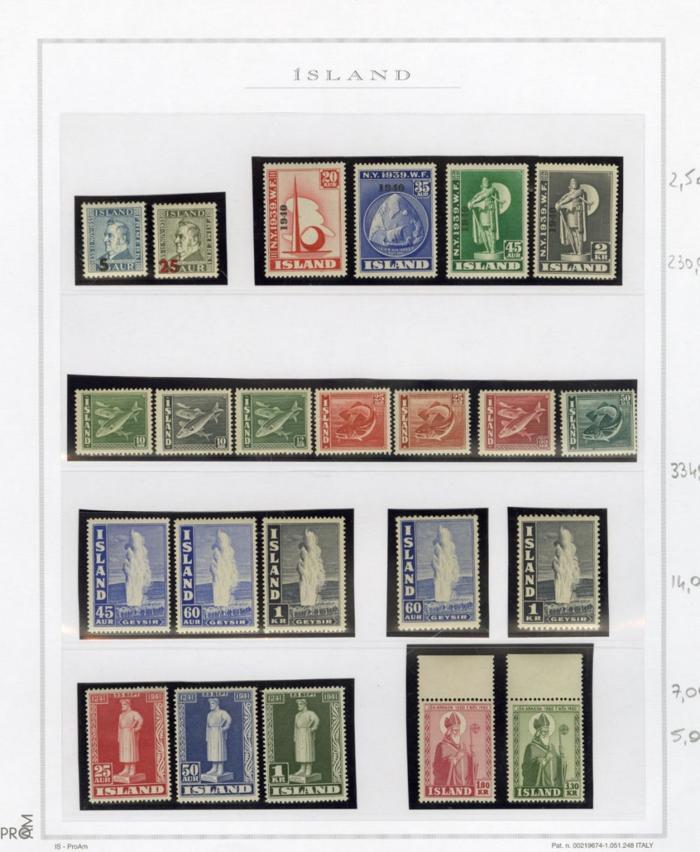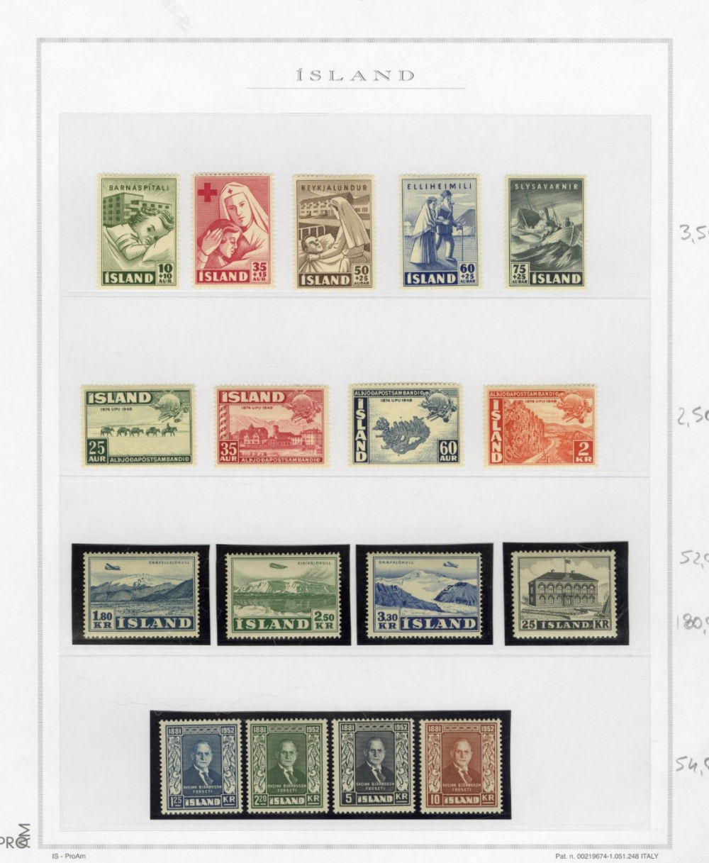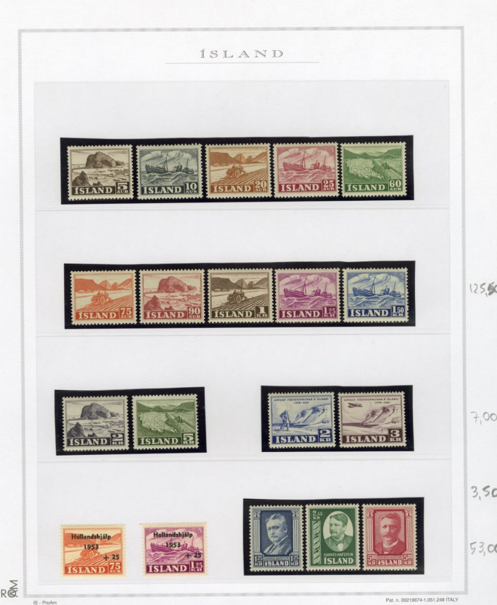 1137 O, og   imageICELAND 1873-2015 two-volume collection on pages, used and unused singles and sets, good showing of 19th Century, mixed condition, mostly complete from 1907, generally n.h. (when unused), including 1907-12 issues (71-98), 1920-22 Christian X, many better singles, surcharges, Landing the mail set of five, Parliament set complete, also Officials (152-66,O53-57) all n.h., Air Post (missing Hopflug Itala), modern issues with booklet panes, etc., also back-of-book, souvenir sheets and more. A nice collection of Iceland, high catalogue value (Image) (Image 2) (Image 3) (Image 4) (Image 5) (Image 6) (Image 7) (Image 8) (Image 9) (Image 10) (Image 11) (Image 12) (Image 13) (Image 14) (Image 15) (Image 16) (Image 17) (All Images)