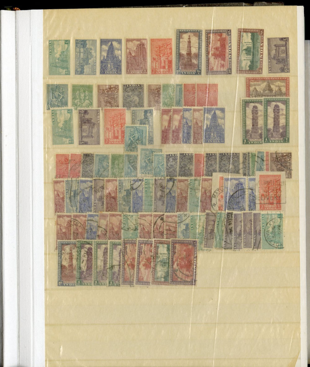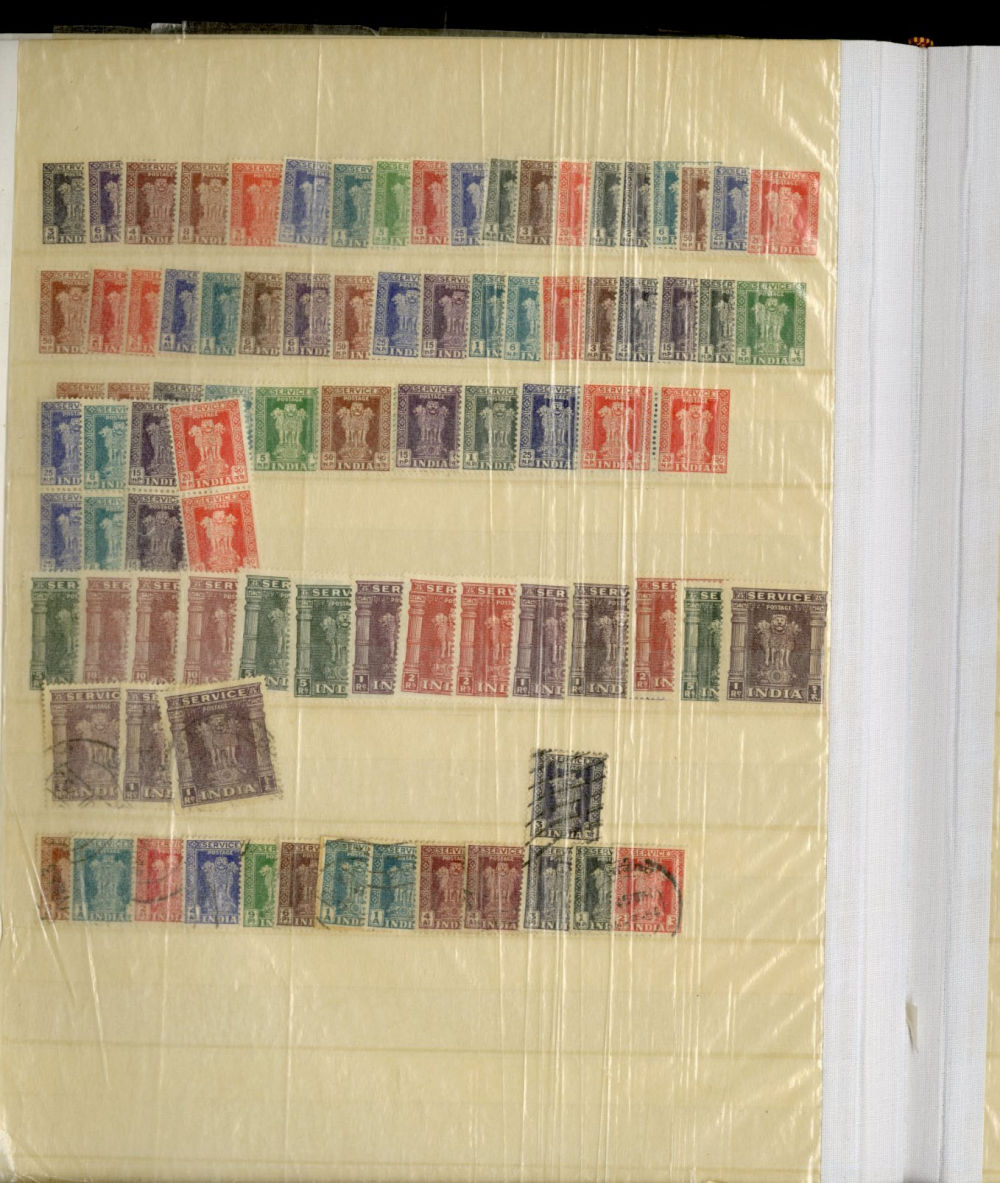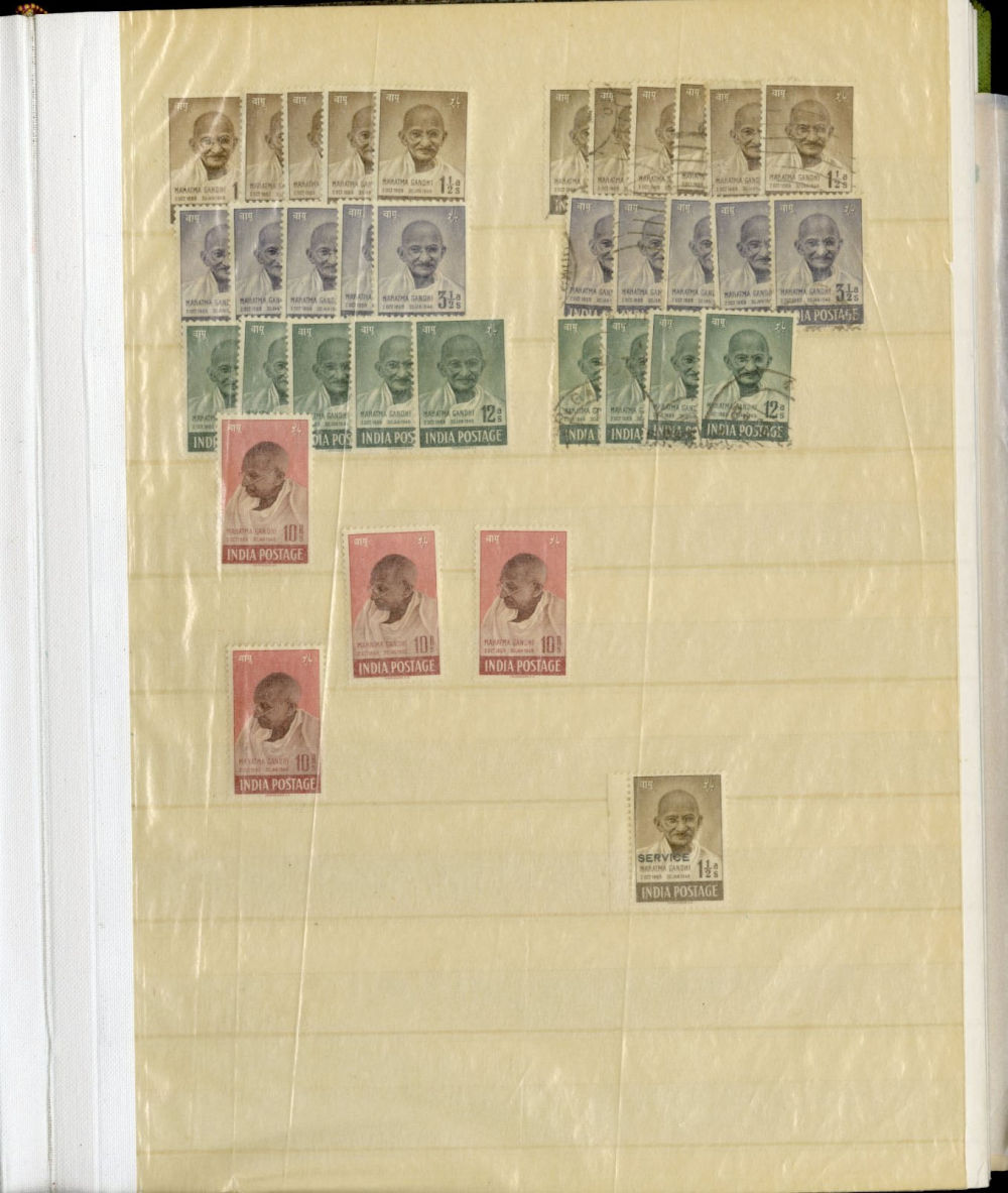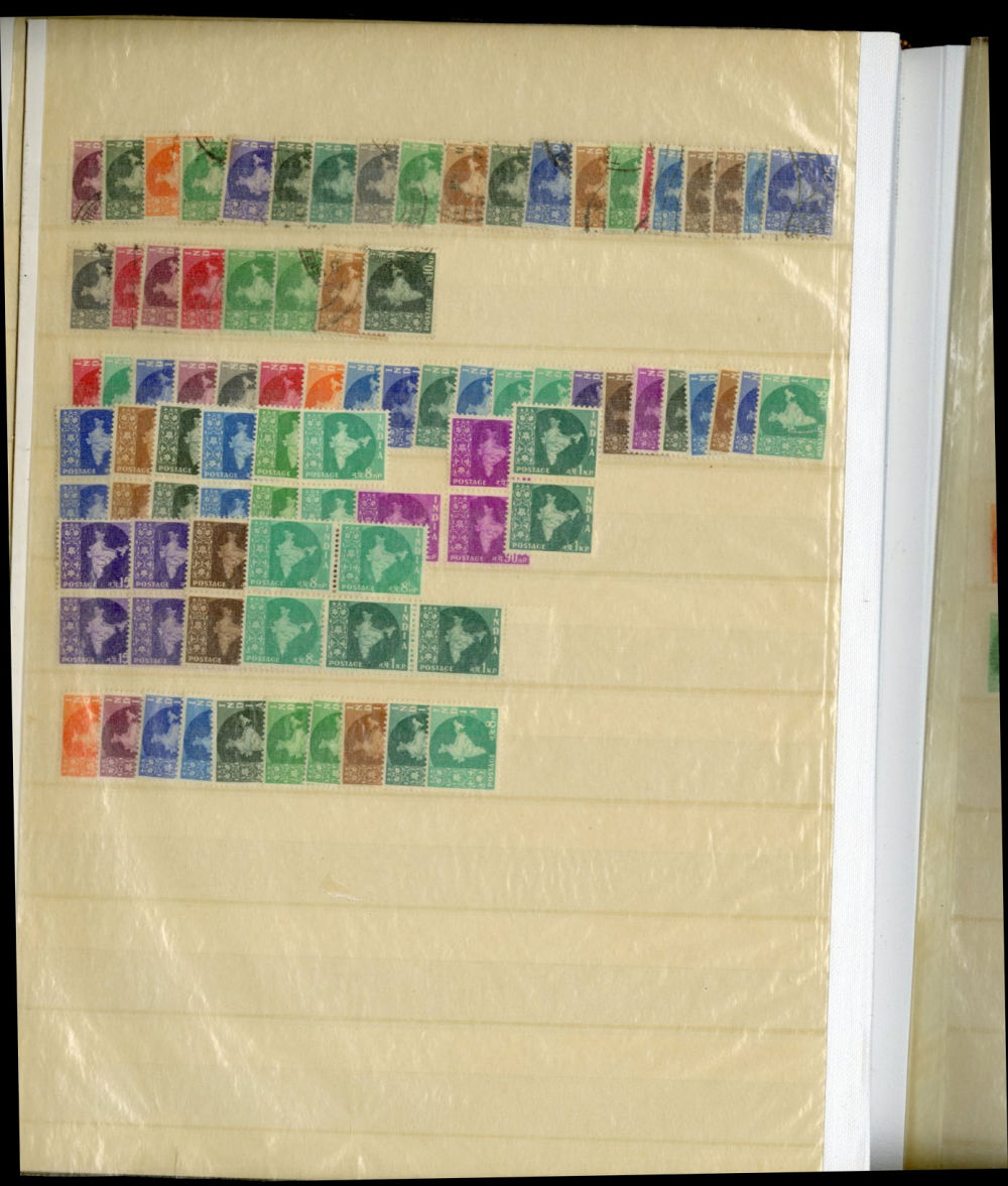 1138 O, og   imageINDIA 1866-1954 dealer's stock book with hundreds of used and unused singles and sets, early Queen Victoria, George V and George VI definitives (mostly used), later commemoratives, with some better items (1948 Gandhi set used in a special folder, also four unused sets, l.h., one n.h.), additional album pages, back of book overprints, some fiscals, etc., mixed condition, mostly fine or better (Image) (Image 2) (Image 3) (Image 4) (Image 5) (Image 6) (Image 7) (Image 8) (Image 9) (Image 10) (Image 11) (Image 12) (Image 13) (Image 14) (Image 15) (Image 16) (Image 17) (All Images)