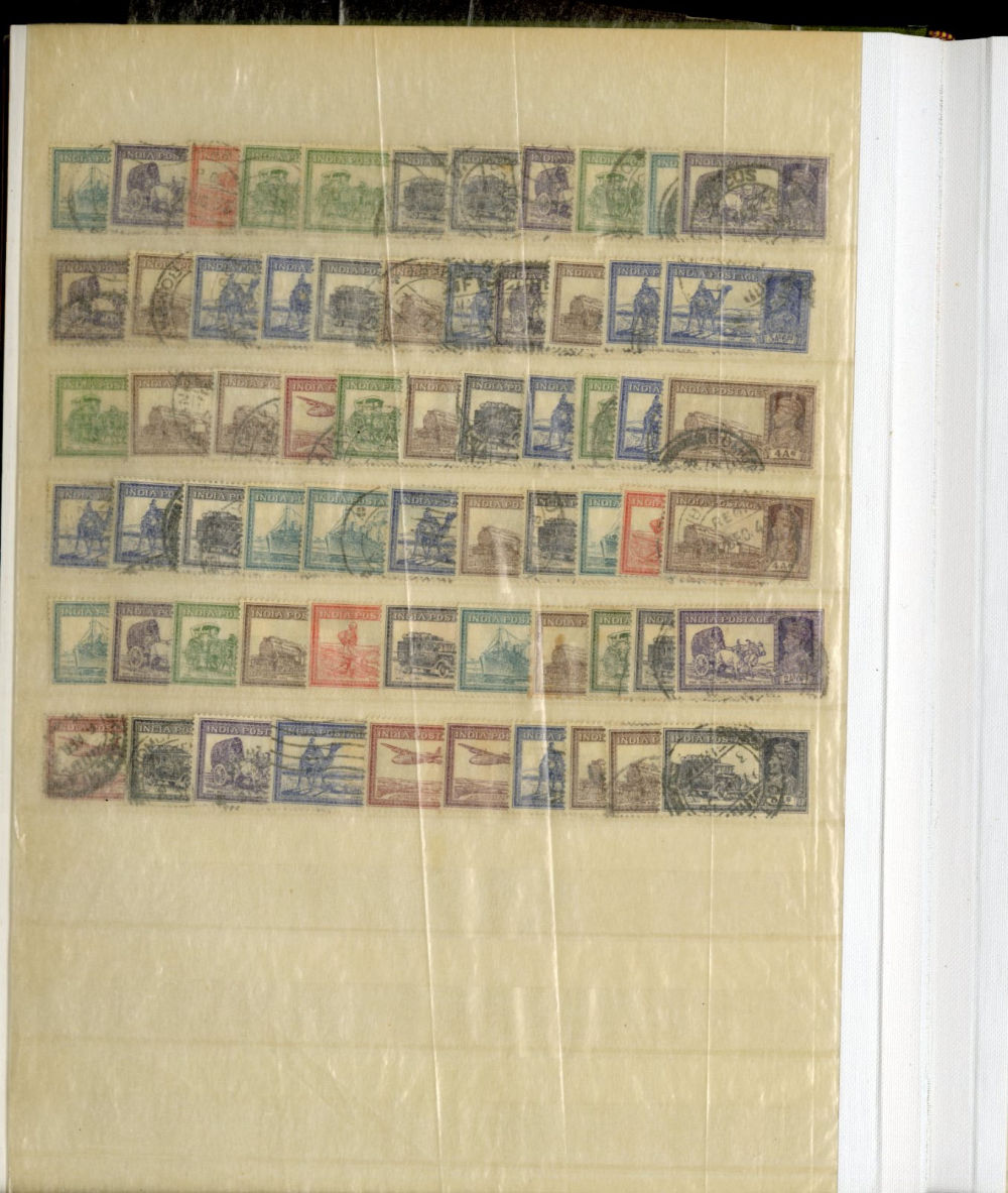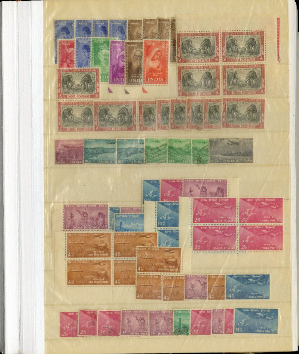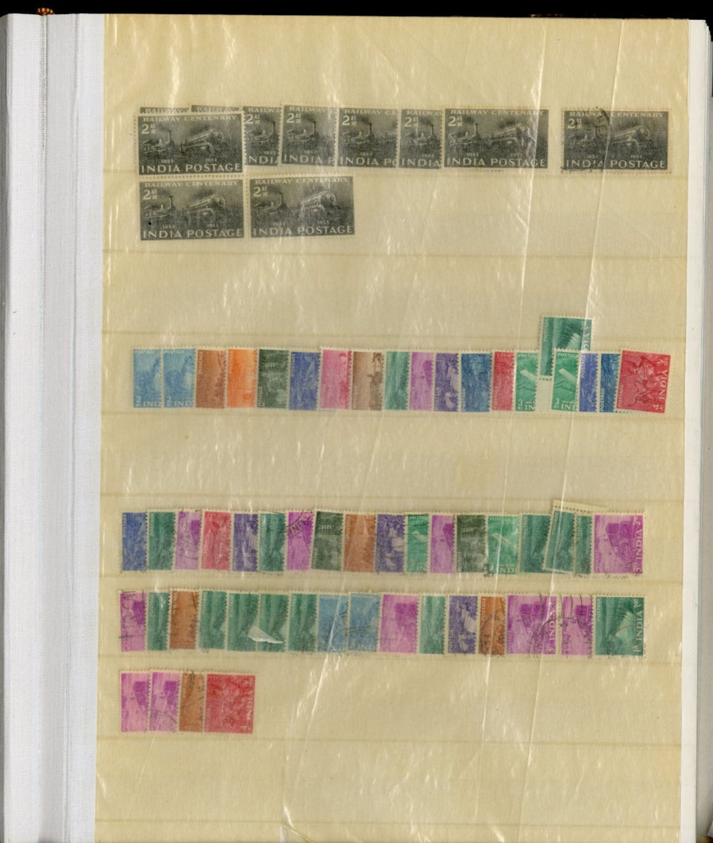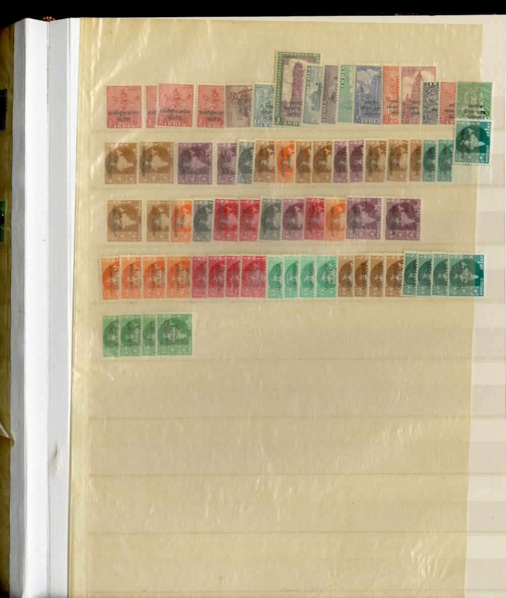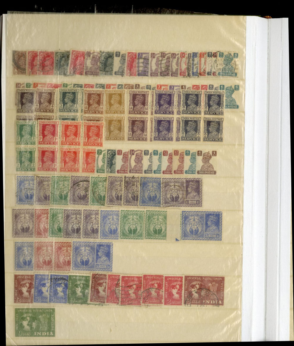 1138 O, og   imageINDIA 1866-1954 dealer's stock book with hundreds of used and unused singles and sets, early Queen Victoria, George V and George VI definitives (mostly used), later commemoratives, with some better items (1948 Gandhi set used in a special folder, also four unused sets, l.h., one n.h.), additional album pages, back of book overprints, some fiscals, etc., mixed condition, mostly fine or better (Image) (Image 2) (Image 3) (Image 4) (Image 5) (Image 6) (Image 7) (Image 8) (Image 9) (Image 10) (Image 11) (Image 12) (Image 13) (Image 14) (Image 15) (Image 16) (Image 17) (All Images)