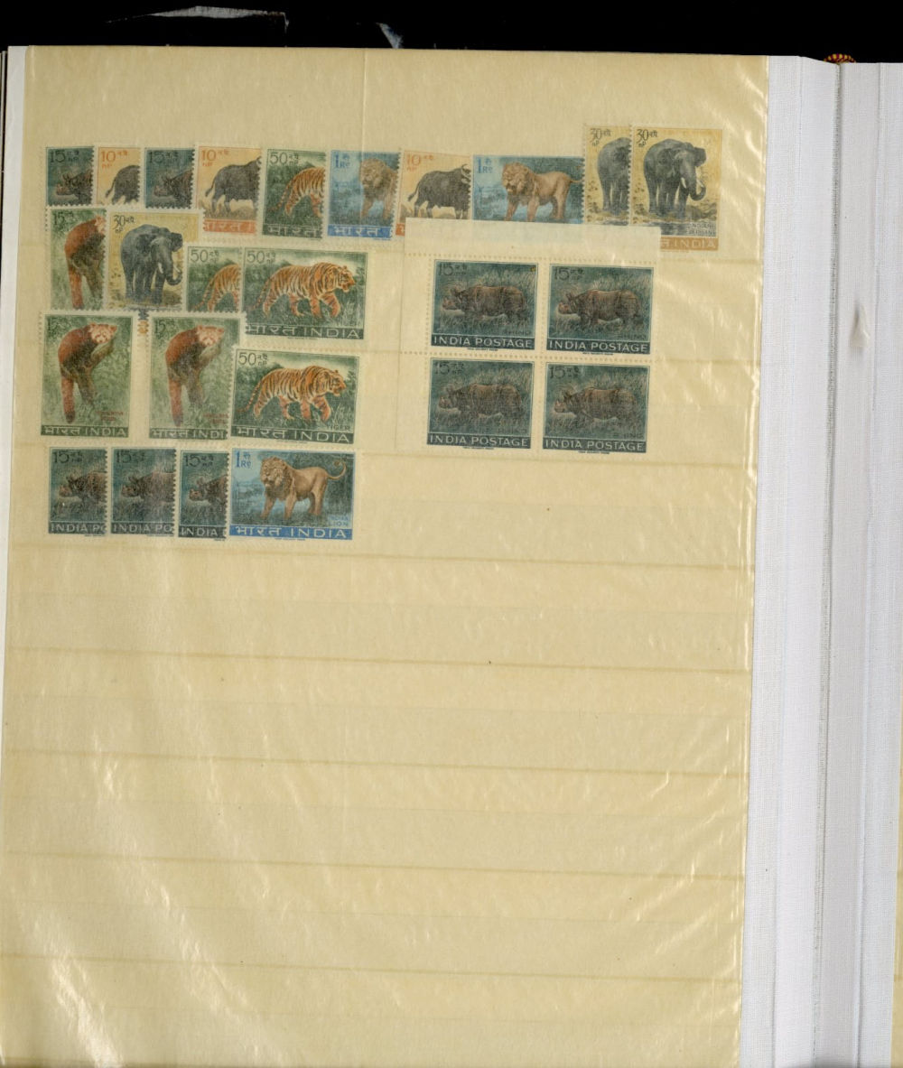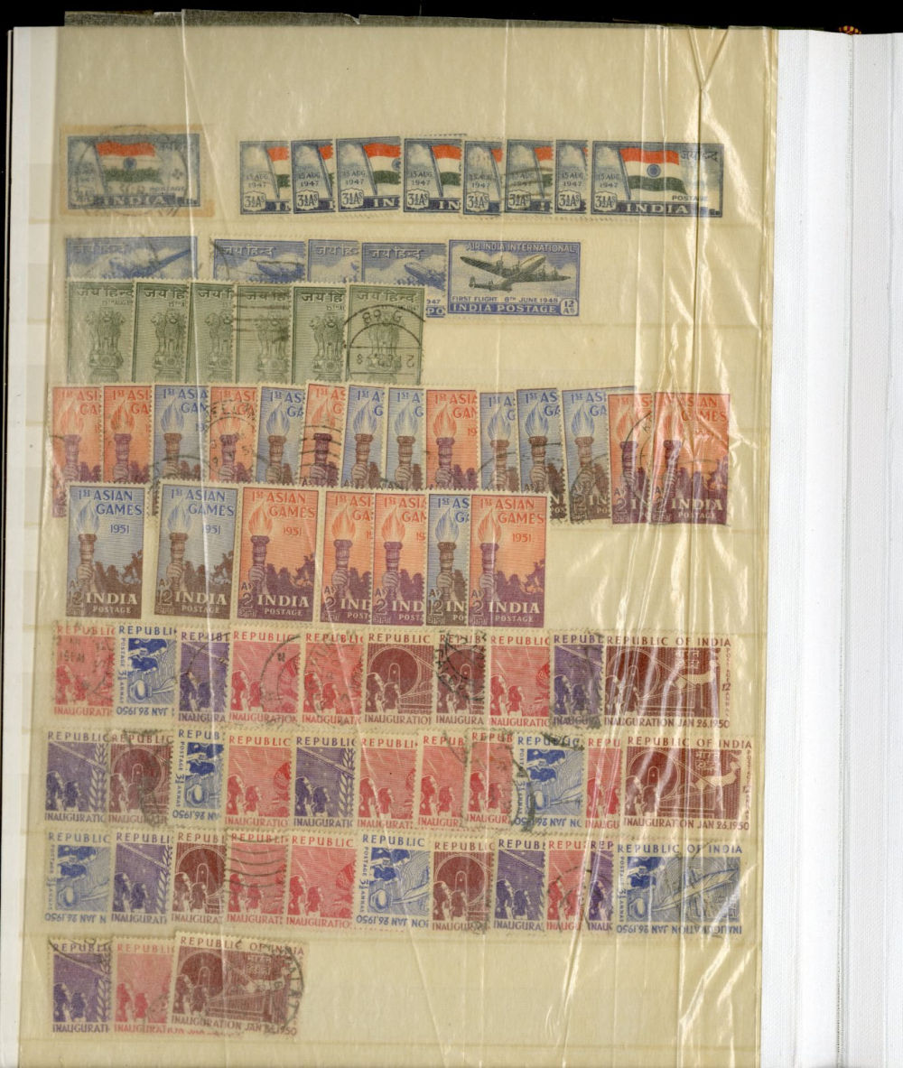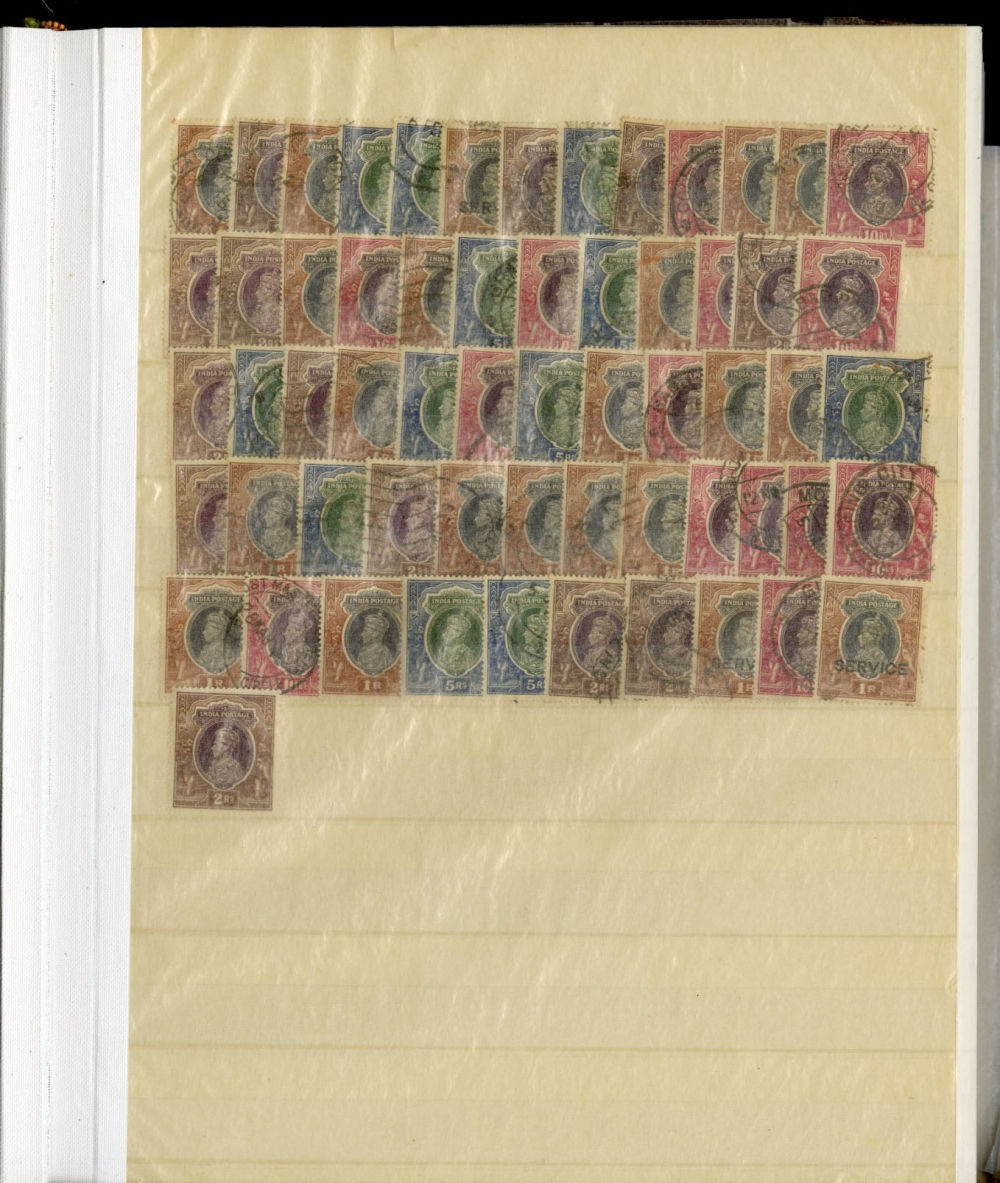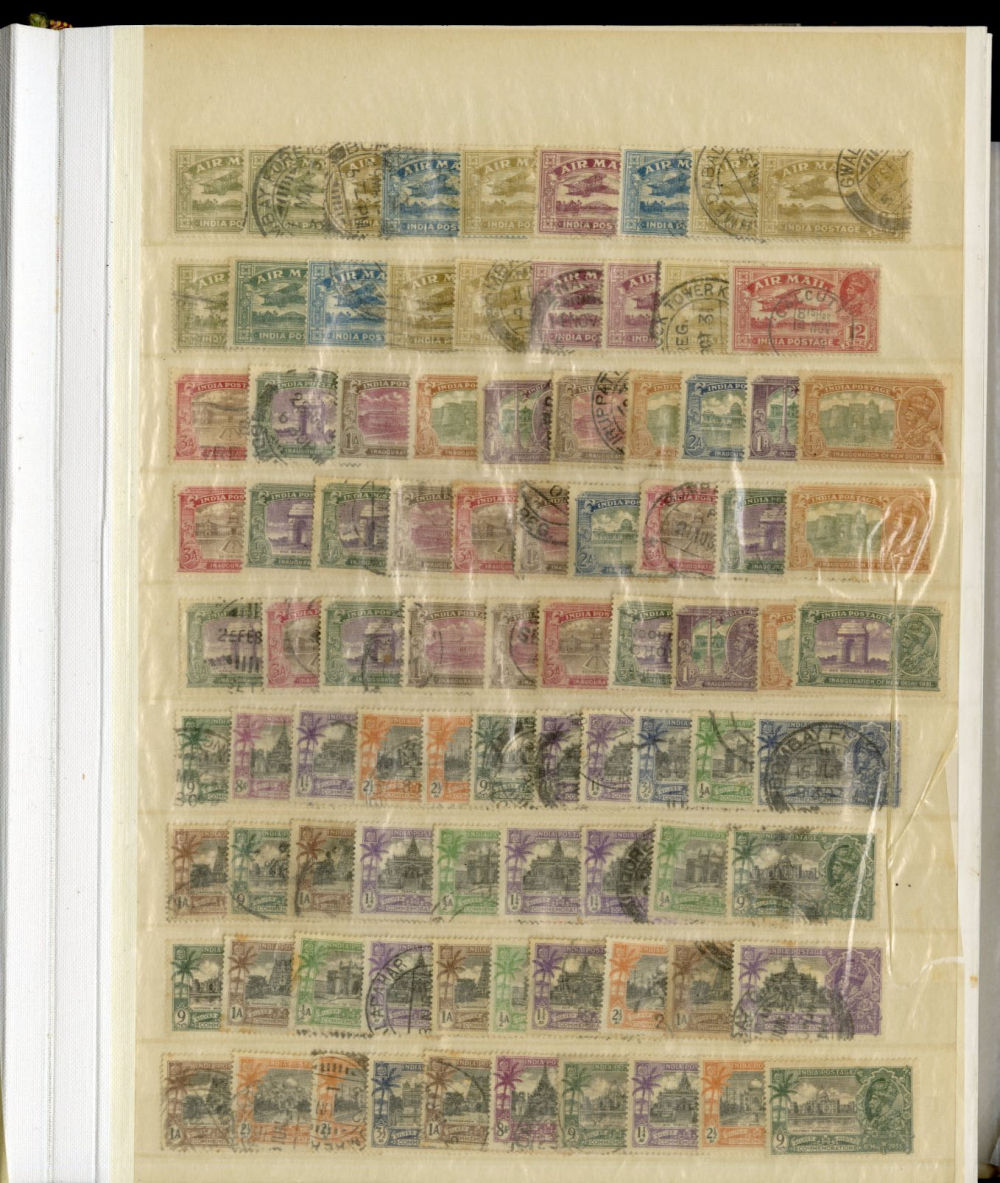 1138 O, og   imageINDIA 1866-1954 dealer's stock book with hundreds of used and unused singles and sets, early Queen Victoria, George V and George VI definitives (mostly used), later commemoratives, with some better items (1948 Gandhi set used in a special folder, also four unused sets, l.h., one n.h.), additional album pages, back of book overprints, some fiscals, etc., mixed condition, mostly fine or better (Image) (Image 2) (Image 3) (Image 4) (Image 5) (Image 6) (Image 7) (Image 8) (Image 9) (Image 10) (Image 11) (Image 12) (Image 13) (Image 14) (Image 15) (Image 16) (Image 17) (All Images)