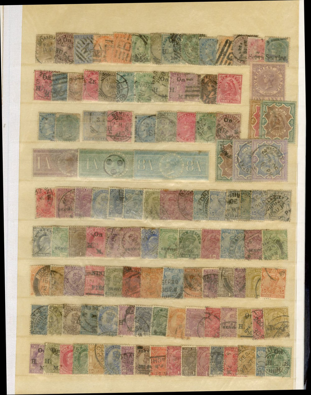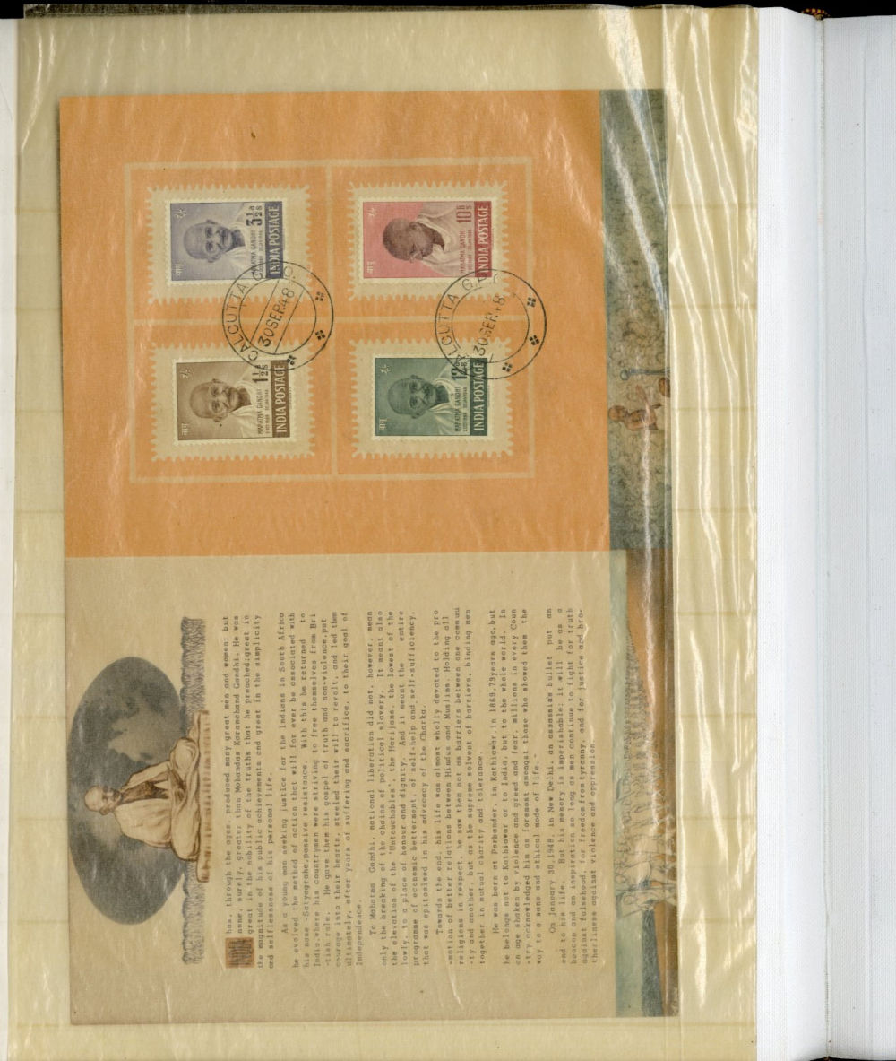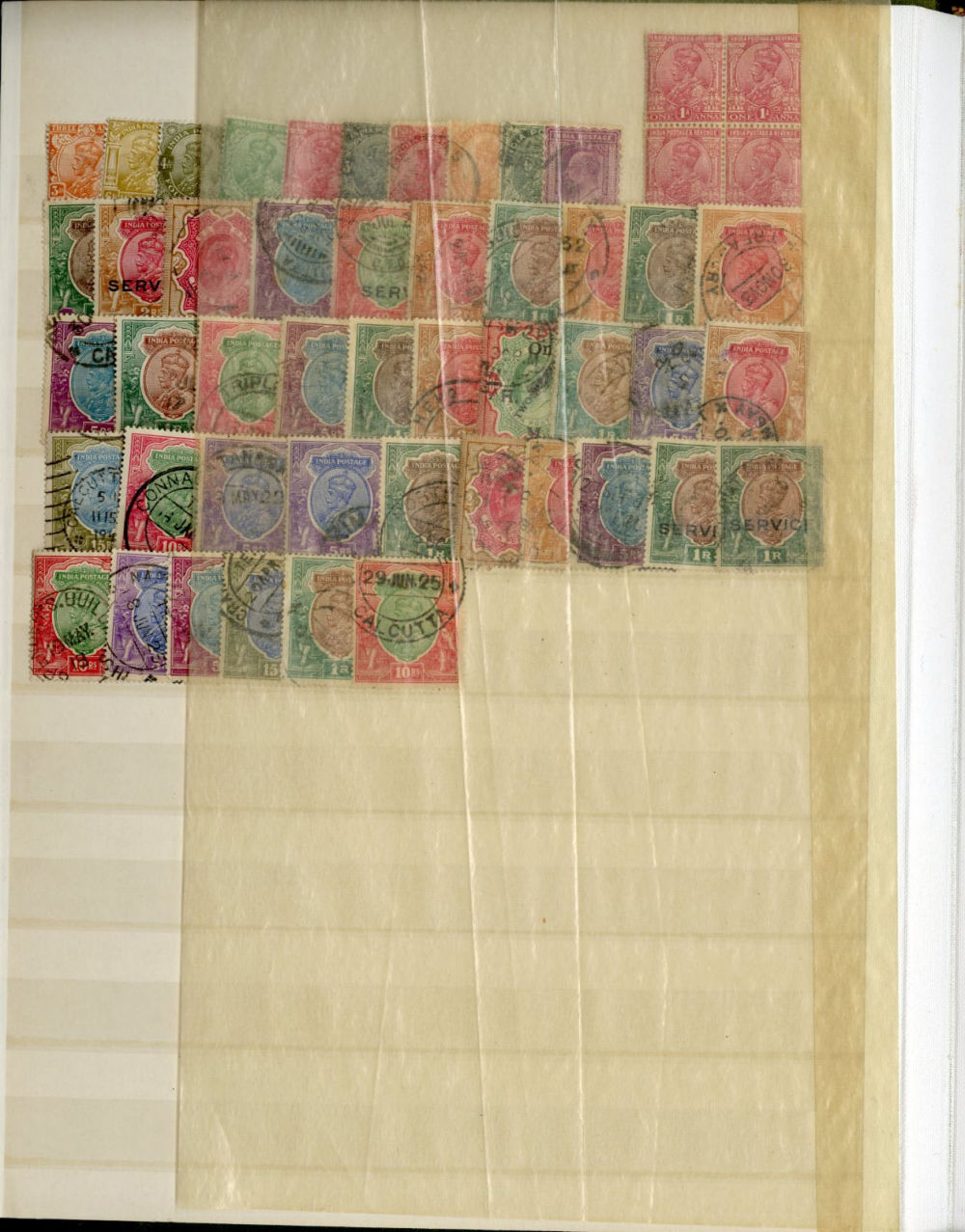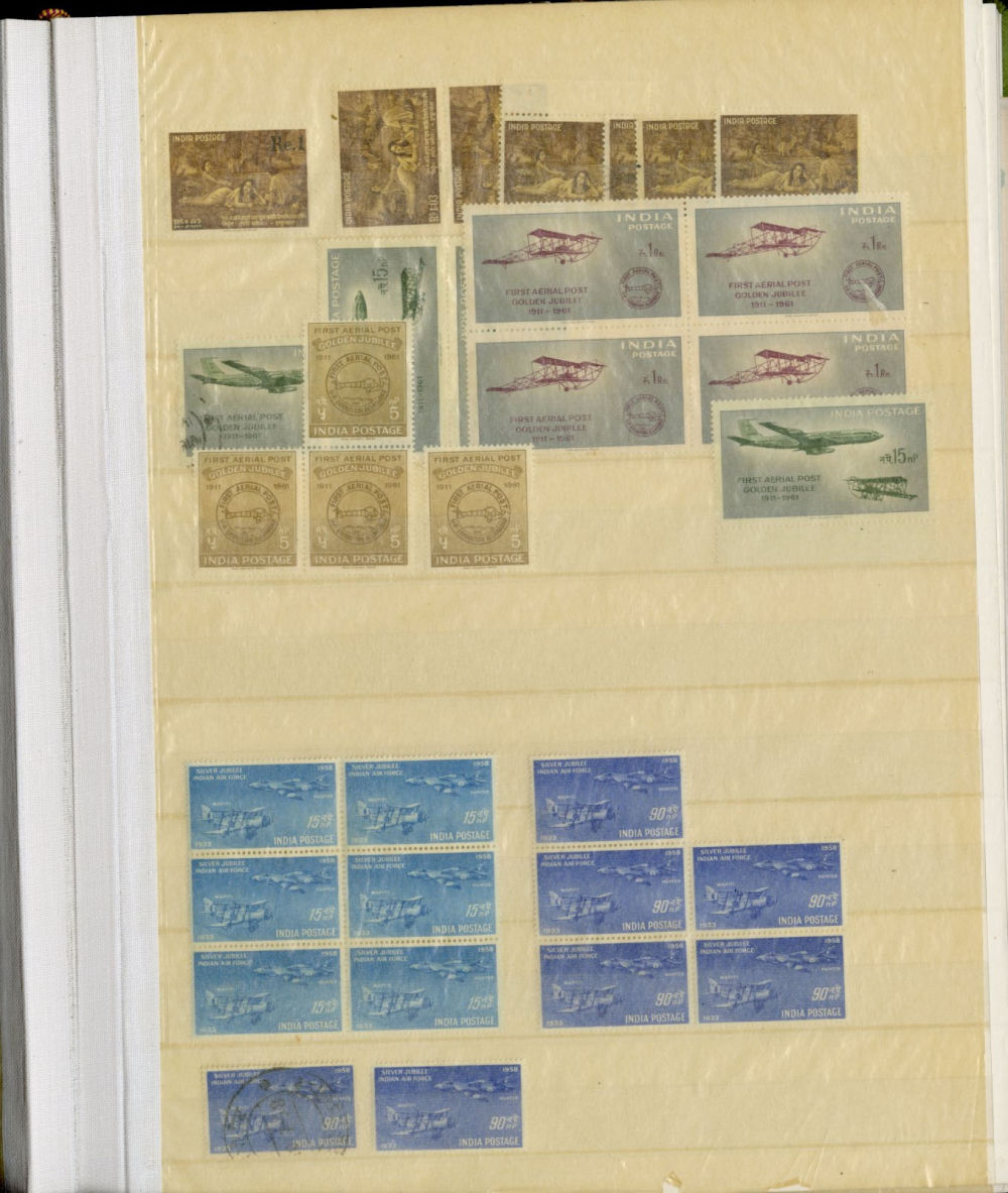 1138 O, og   imageINDIA 1866-1954 dealer's stock book with hundreds of used and unused singles and sets, early Queen Victoria, George V and George VI definitives (mostly used), later commemoratives, with some better items (1948 Gandhi set used in a special folder, also four unused sets, l.h., one n.h.), additional album pages, back of book overprints, some fiscals, etc., mixed condition, mostly fine or better (Image) (Image 2) (Image 3) (Image 4) (Image 5) (Image 6) (Image 7) (Image 8) (Image 9) (Image 10) (Image 11) (Image 12) (Image 13) (Image 14) (Image 15) (Image 16) (Image 17) (All Images)