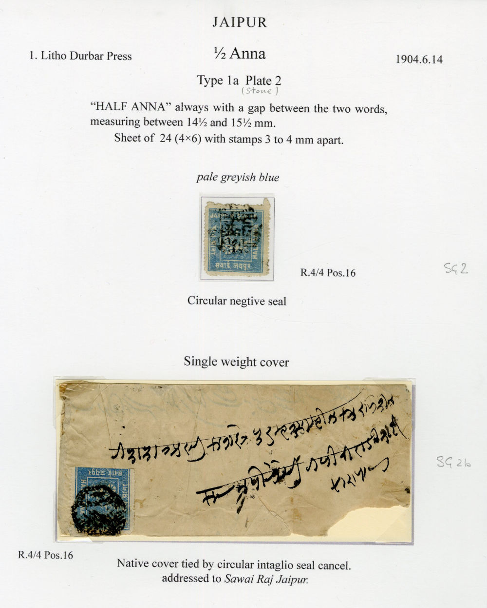 1139 c   imageINDIA - FEUDATORY STATES 1904 Japur. Durbar Printing 1/2a gray blue (SG £325) and 1/2a ultramarine on Native cover, tied by an intaglio seal in black (only known used), (SG £650 off cover), mixed condition (Image)