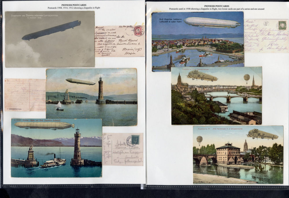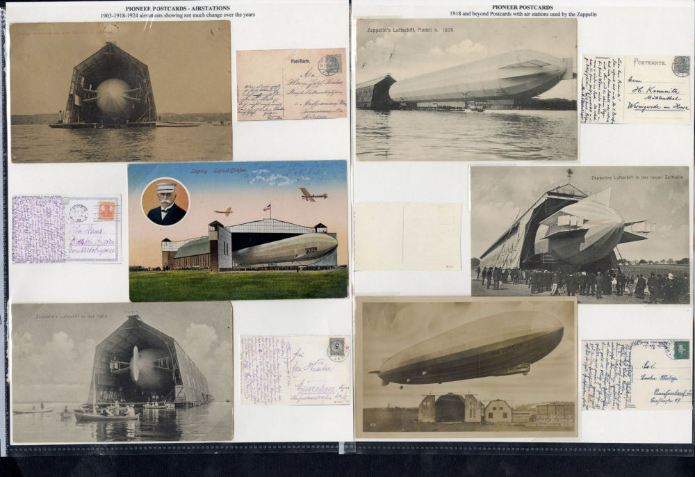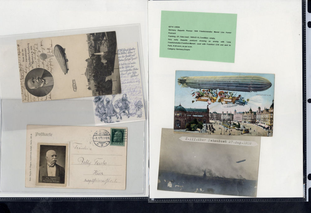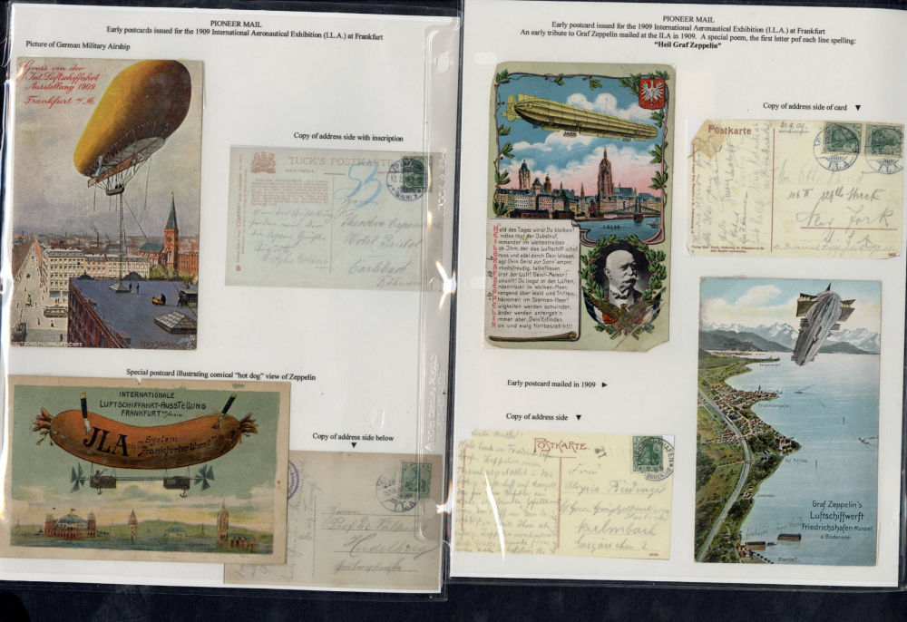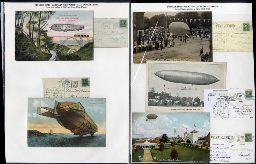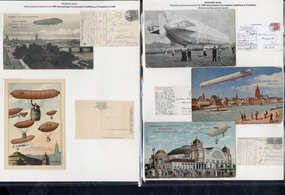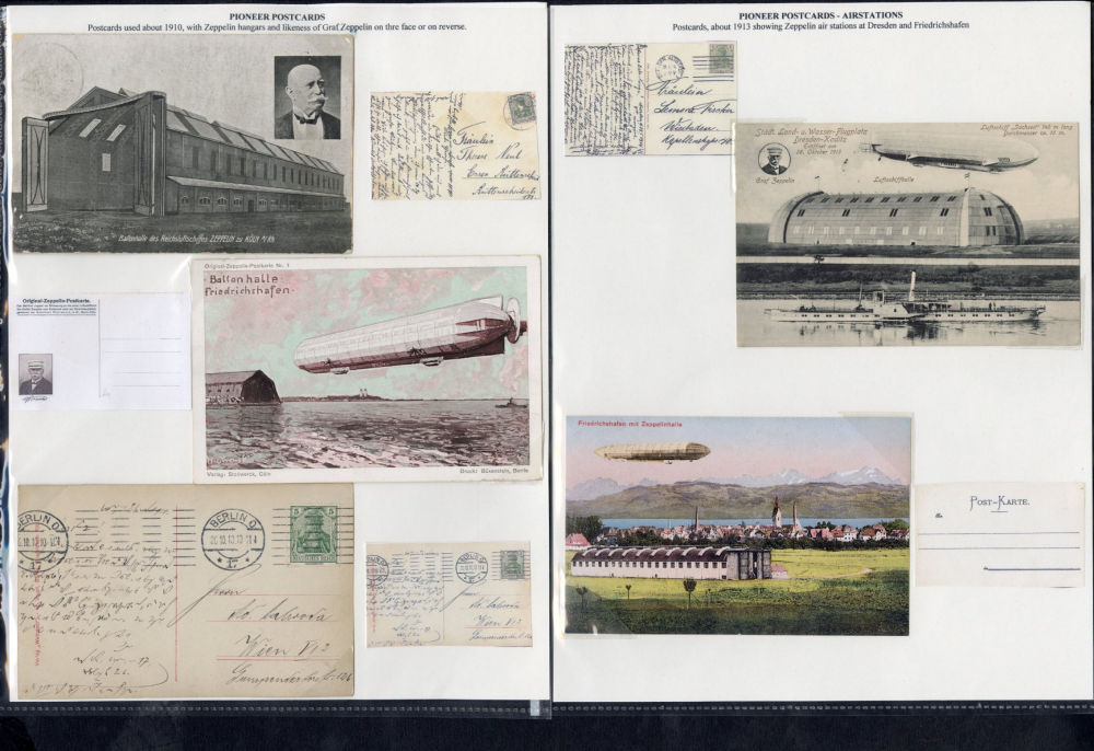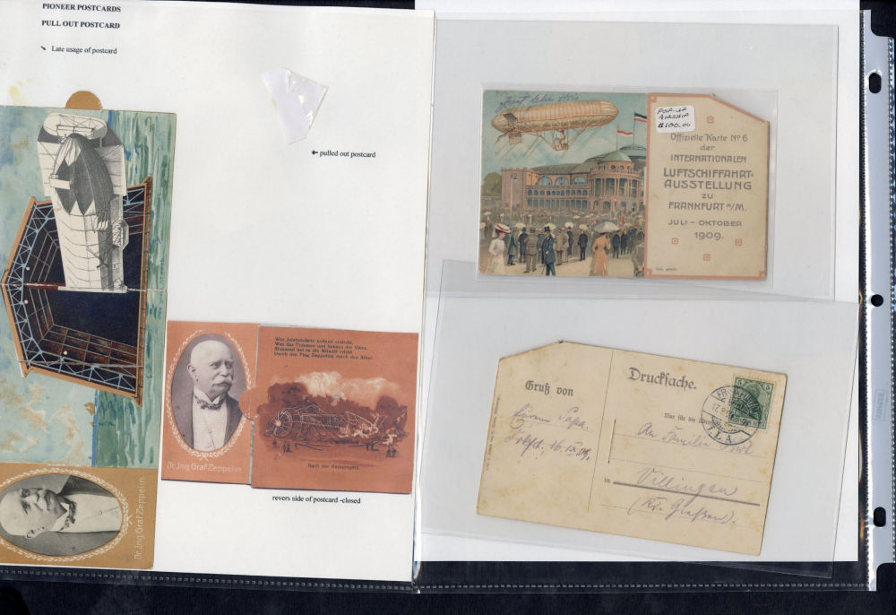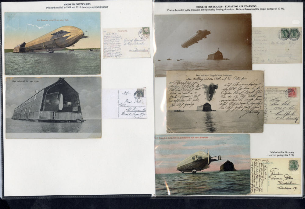 1244 c   imageWORLDWIDE COVERS and POSTAL HISTORY1909-18 collection of 160+ mostly used Zeppelin picture postcards (not flown by Zeppelin), views with Zeppelin in the air or moored at an air station, showing the early struggles of these giant oblong objects gliding through the air, almost always ending in a disaster. Most of these cards were issued at various Air shows, the 1909 International Aeronautical Exhibition (I.L.A.) and others, mostly in Germany, few other countries, many elaborate designs, embossing, extended cards, panoramic pop-up folding cards, pull-out postcards, some with additional labels, generally fine-v.f., many $100+ items, difficult to assemble (Image) (Image 2) (Image 3) (Image 4) (Image 5) (Image 6) (Image 7) (Image 8) (Image 9) (Image 10) (Image 11) (Image 12) (Image 13) (Image 14) (Image 15) (Image 16) (Image 17) (Image 18) (Image 19) (Image 20) (Image 21) (Image 22) (Image 23) (Image 24) (Image 25) (Image 26) (Image 27) (Image 28) (Image 29) (Image 30) (Image 31) (Image 32) (Image 33) (Image 34) (Image 35) (Image 36) (All Images)