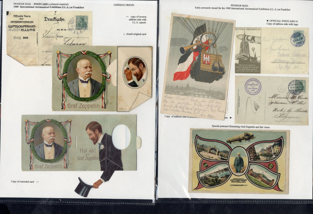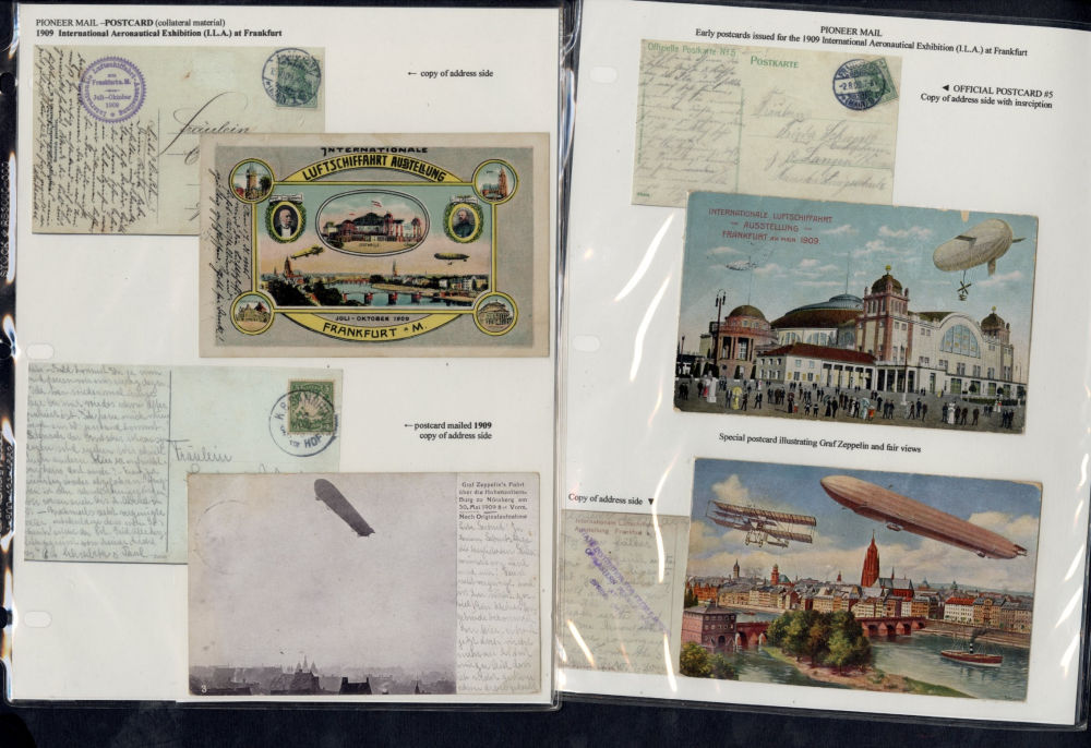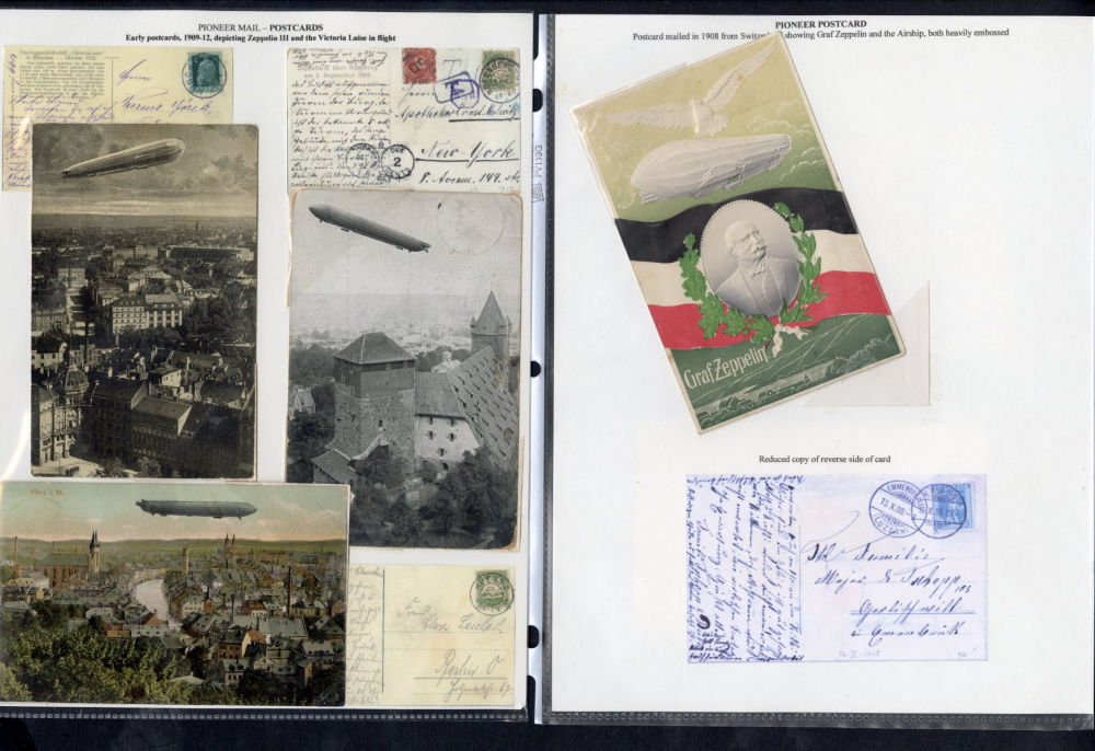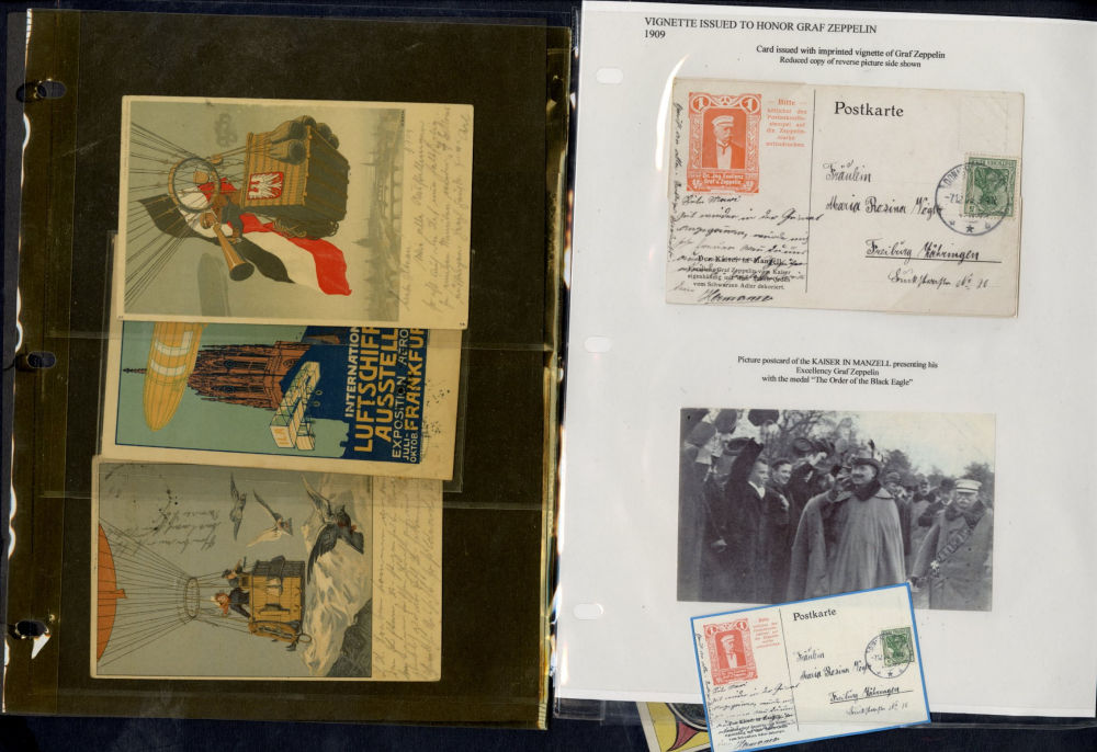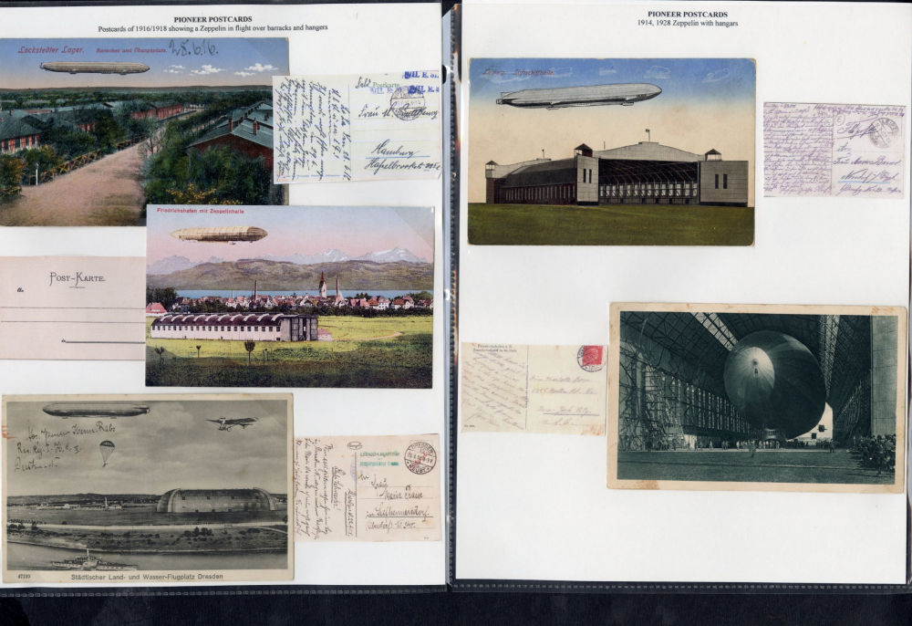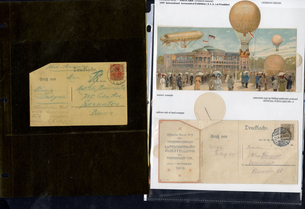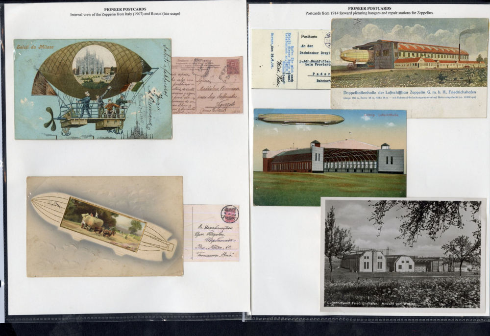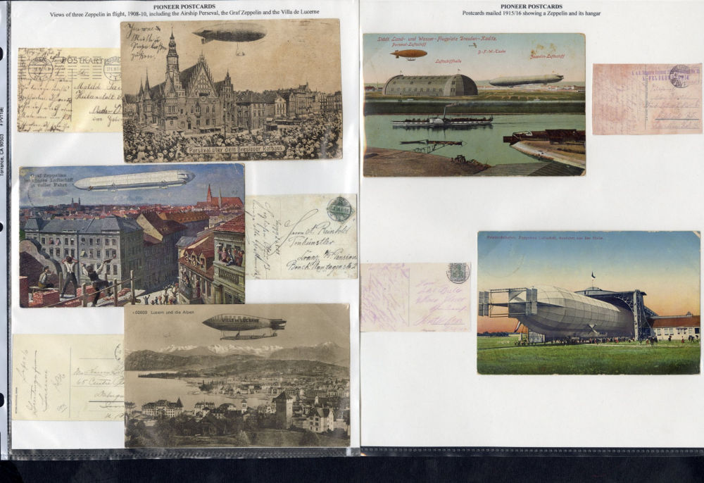 1244 c   imageWORLDWIDE COVERS and POSTAL HISTORY1909-18 collection of 160+ mostly used Zeppelin picture postcards (not flown by Zeppelin), views with Zeppelin in the air or moored at an air station, showing the early struggles of these giant oblong objects gliding through the air, almost always ending in a disaster. Most of these cards were issued at various Air shows, the 1909 International Aeronautical Exhibition (I.L.A.) and others, mostly in Germany, few other countries, many elaborate designs, embossing, extended cards, panoramic pop-up folding cards, pull-out postcards, some with additional labels, generally fine-v.f., many $100+ items, difficult to assemble (Image) (Image 2) (Image 3) (Image 4) (Image 5) (Image 6) (Image 7) (Image 8) (Image 9) (Image 10) (Image 11) (Image 12) (Image 13) (Image 14) (Image 15) (Image 16) (Image 17) (Image 18) (Image 19) (Image 20) (Image 21) (Image 22) (Image 23) (Image 24) (Image 25) (Image 26) (Image 27) (Image 28) (Image 29) (Image 30) (Image 31) (Image 32) (Image 33) (Image 34) (Image 35) (Image 36) (All Images)