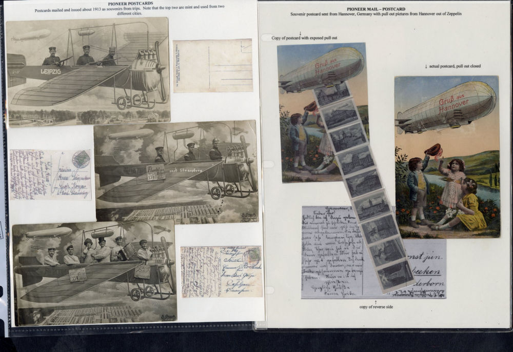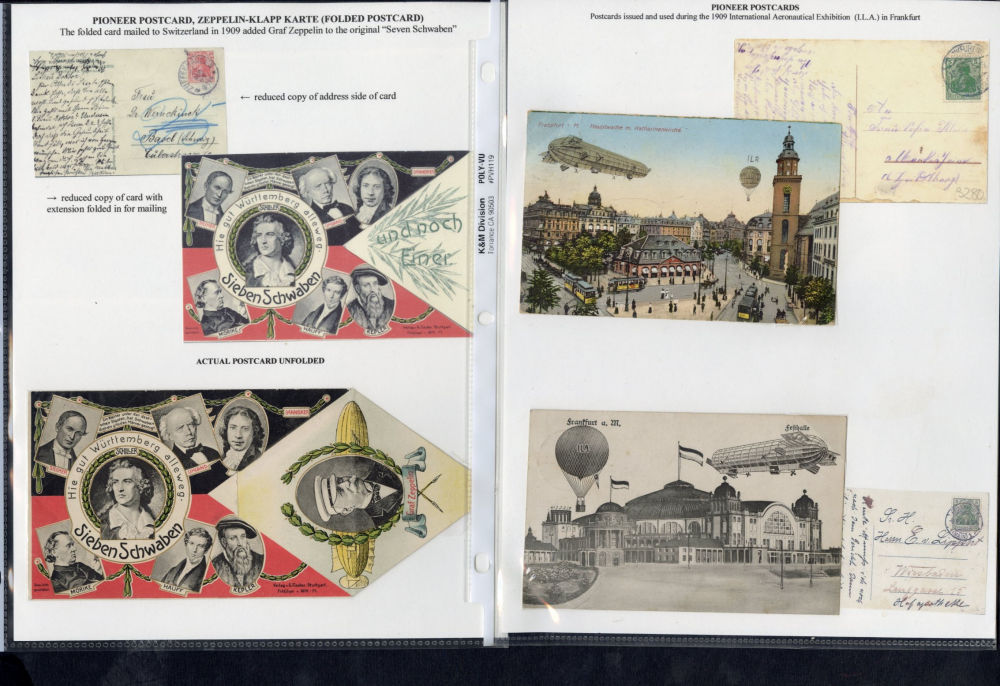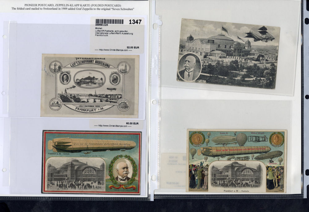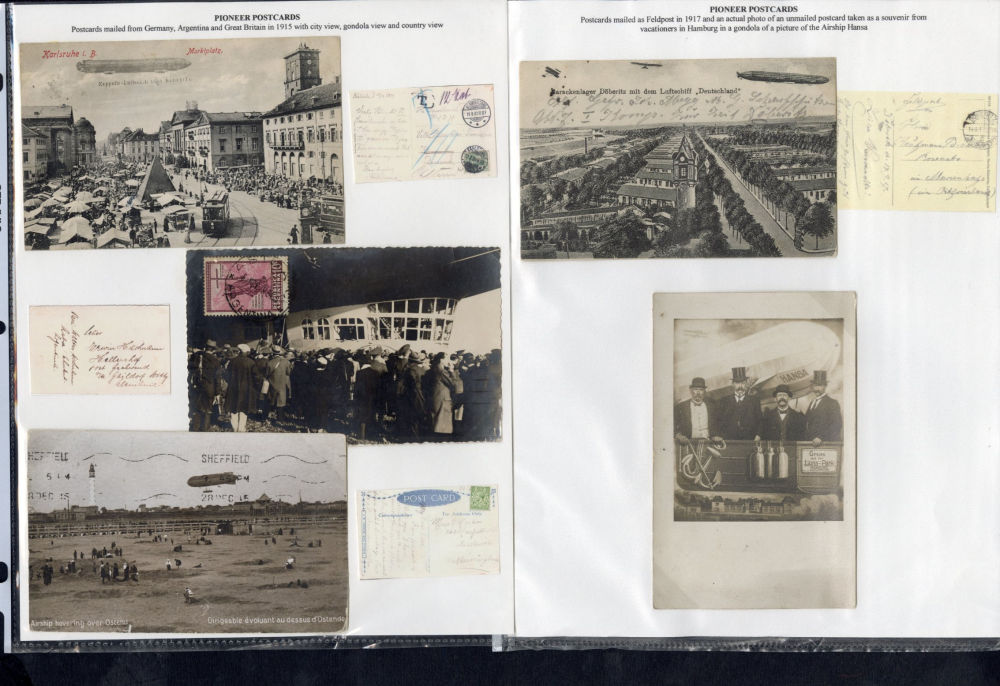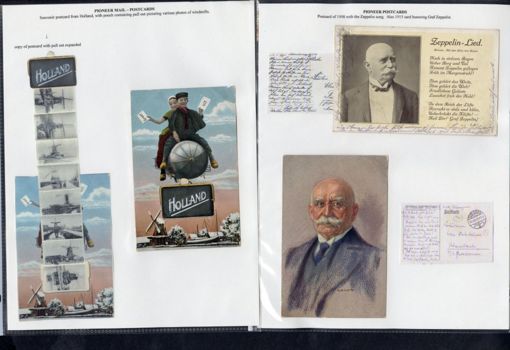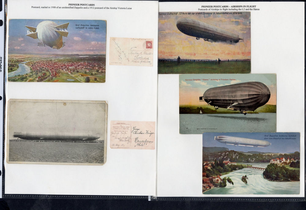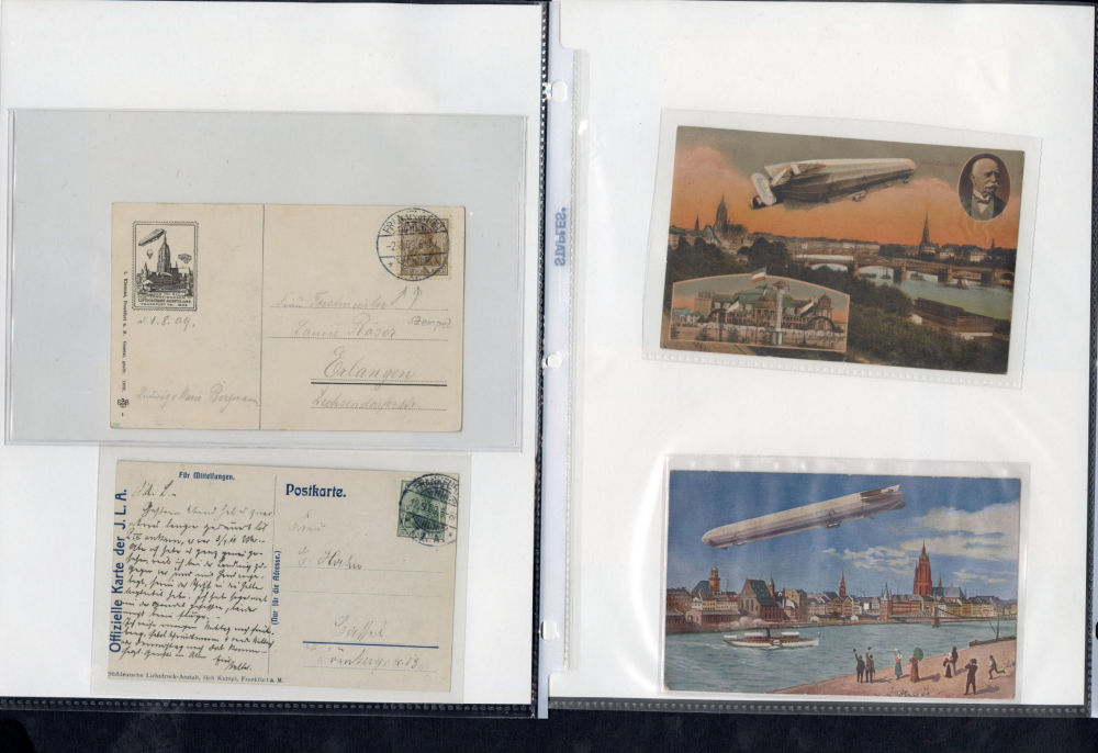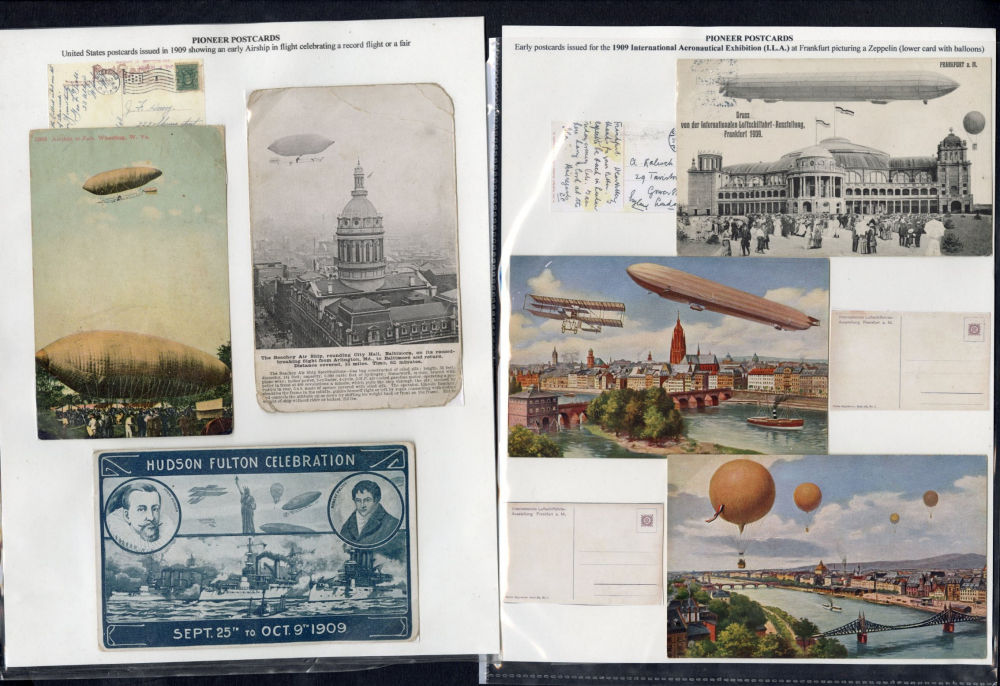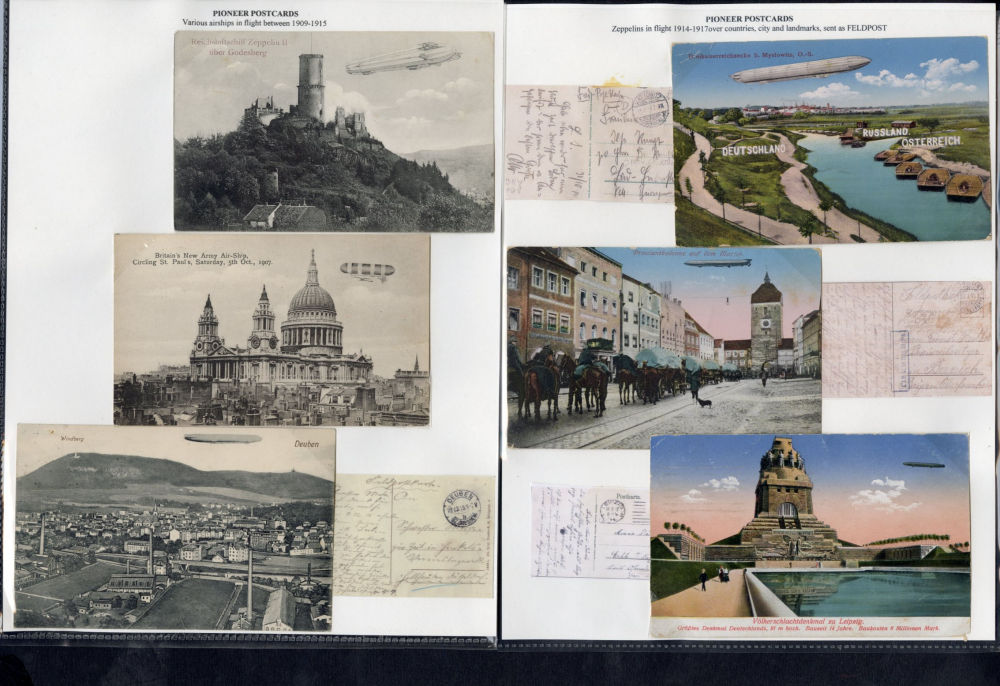 1244 c   imageWORLDWIDE COVERS and POSTAL HISTORY1909-18 collection of 160+ mostly used Zeppelin picture postcards (not flown by Zeppelin), views with Zeppelin in the air or moored at an air station, showing the early struggles of these giant oblong objects gliding through the air, almost always ending in a disaster. Most of these cards were issued at various Air shows, the 1909 International Aeronautical Exhibition (I.L.A.) and others, mostly in Germany, few other countries, many elaborate designs, embossing, extended cards, panoramic pop-up folding cards, pull-out postcards, some with additional labels, generally fine-v.f., many $100+ items, difficult to assemble (Image) (Image 2) (Image 3) (Image 4) (Image 5) (Image 6) (Image 7) (Image 8) (Image 9) (Image 10) (Image 11) (Image 12) (Image 13) (Image 14) (Image 15) (Image 16) (Image 17) (Image 18) (Image 19) (Image 20) (Image 21) (Image 22) (Image 23) (Image 24) (Image 25) (Image 26) (Image 27) (Image 28) (Image 29) (Image 30) (Image 31) (Image 32) (Image 33) (Image 34) (Image 35) (Image 36) (All Images)