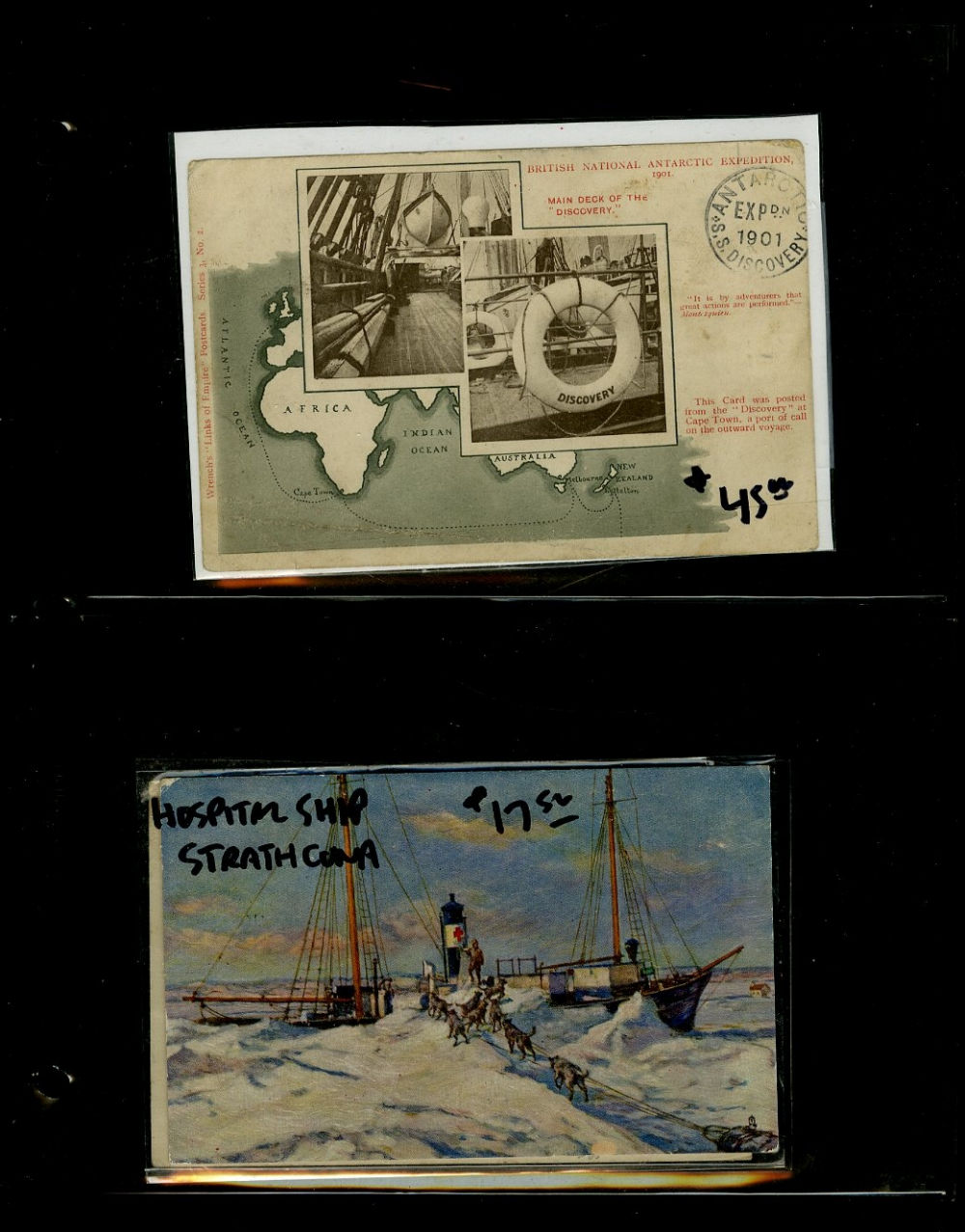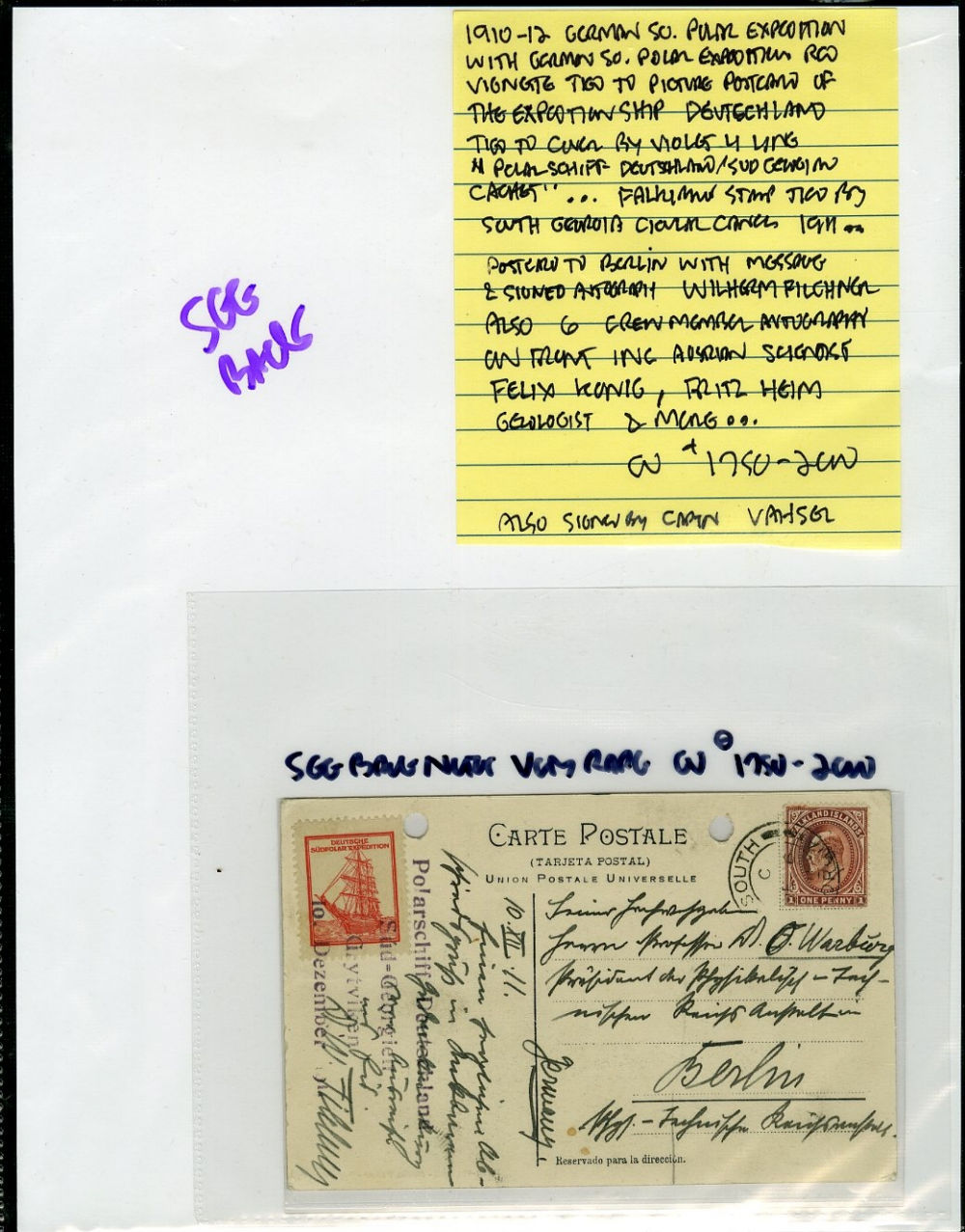 1248 c   imageWORLDWIDE COVERS and POSTAL HISTORY Antarctica 1901-51 selection of 45 covers or cards, including 1911 South Polar Expedition, ppc ("Sudpolarschiff Deutschland" Peuser, Buenos Aires) franked with Falkland Islands 1p and "Deutsche Sud-Polar Expedition" vignette tied by four line "Polarschiff "Deutschland" Sud-Georgien Grytviken Dezember1911" hs, sent to Berlin (rare), Ingolf-Expedition lettersheet signed by Fridtjof Nansen, excellent strike of "Deutsche Sudpol.Exped.Kerguelen Insel Royal Sound 9 Nov.1901" on piece, Wilkins-Ellsworth (8 different items), etc. A fine and compelling assembly (Image) (Image 2) (Image 3) (Image 4) (Image 5) (Image 6) (Image 7) (Image 8) (Image 9) (Image 10) (Image 11) (Image 12) (Image 13) (Image 14) (Image 15) (Image 16) (Image 17) (Image 18) (Image 19) (Image 20) (Image 21) (Image 22) (Image 23) (Image 24) (Image 25) (Image 26) (All Images)