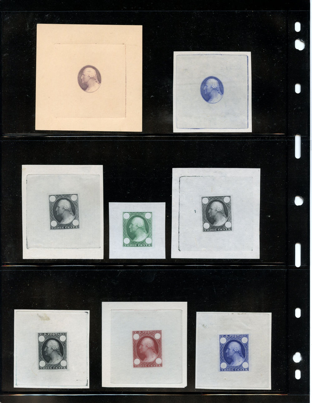 Group of nine Toppan, Carpenter & Co. 3c Washington 1903 Schernikow die essays including 11-E17c, 65-E1a, 65-E1c, 2x 65-E2b and 4x 65-E3c. A very fine assemblage of these interesting die essays produced from the original dies by Schernikow.