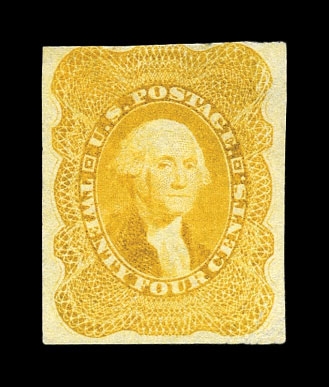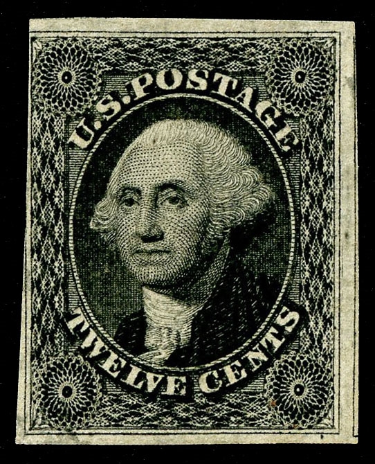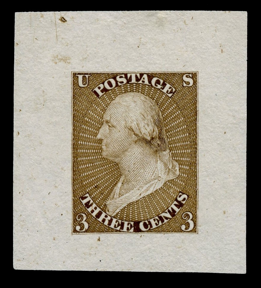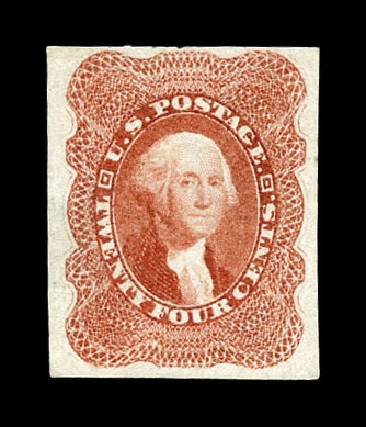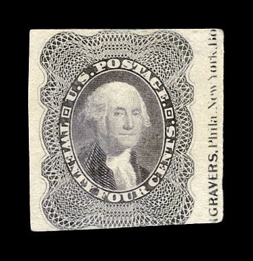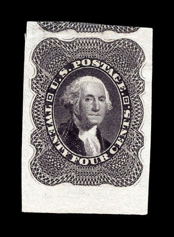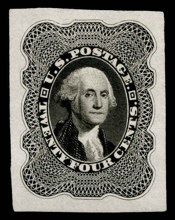 (37-E1) 1857–61 24¢ black large die essay on India paper, 22 x 29mm, showing the unadopted design for the 24¢ 1860 Washington issue. This early die displays an intense, rich black shade and presents subtle but significant differences from the die ultimately used to create the transfer roll for the issued stamp. Most notably, the vignette background is etched with considerably darker cross-hatching, giving the portrait a more recessed appearance. A scarce and desirable essay illustrating the evolution of design and engraving decisions leading to the final 24¢ issue, very fine and choice.Cat. value $1,500.