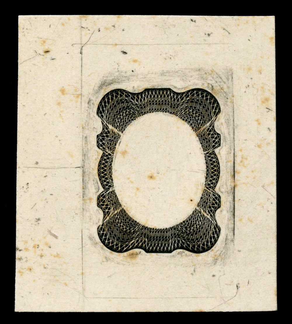 (37-E2) 1857-61 (24¢) black frame-only die essay on India, on 39 x 44mm card, showing crisp impression of the intricate lathework frame used for the 24¢ denomination of the 1857-61 Issue, without outer frame line, with clear die layout lines visible, light scattered toning spots, otherwise well-preserved.