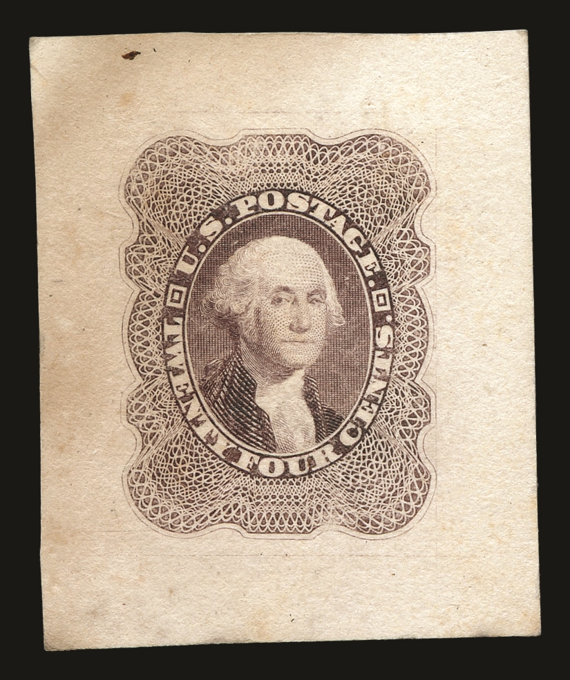 A very fine example of a progressive die essay from an early state of the 1857-61 24¢ Issue design—a rare artifact from the production process at Toppan, Carpenter, Casilear & Co. One of three frame-only die essays recorded.