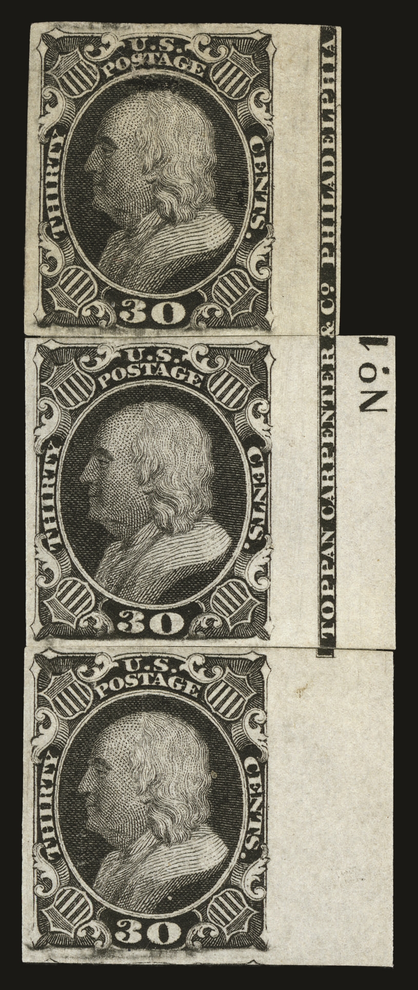 (38TC5a) 1857-61 30¢ black trial color plate proof on wove paper, positions 50R-60R-70R, reconstructed to show progressive portions of the Toppan, Carpenter & Co. Philadelphia imprint and “No. 1” plate number.