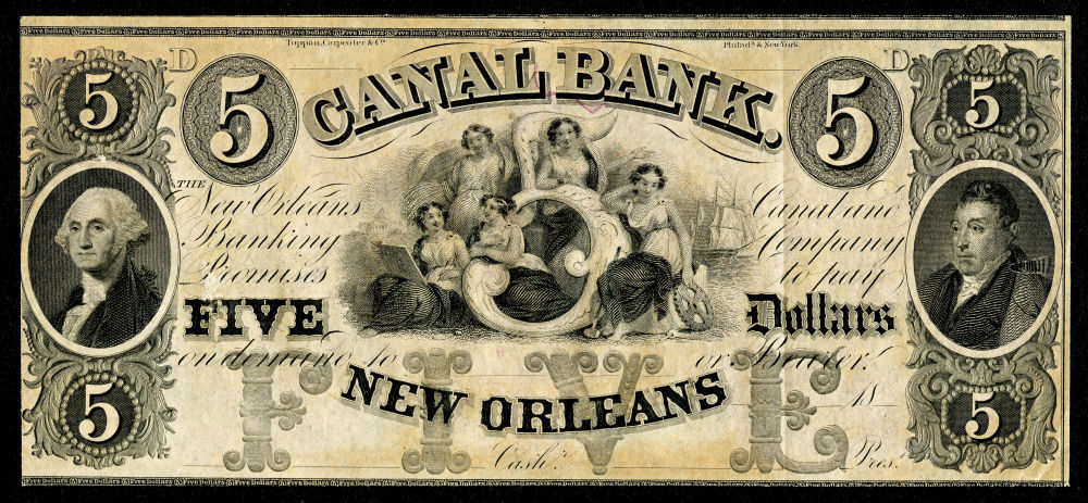 Two Toppan, Carpenter Canal Bank banknotes showing examples of the original dies used to prepare the (7/10A/17) 1851-57 1¢, 3¢ & 12¢ stamp plates previously deployed in the production of banknotes by the firm. Used examples of 1¢, 3¢ & 12¢ 1851-57 Issue stamps included on original exhibit page.