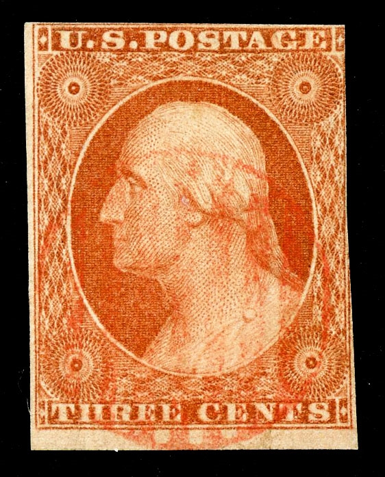 (11-E10b) 1851 3c Danforth, Bald & Co. scarlet die essay on India paper, fine-v.f.